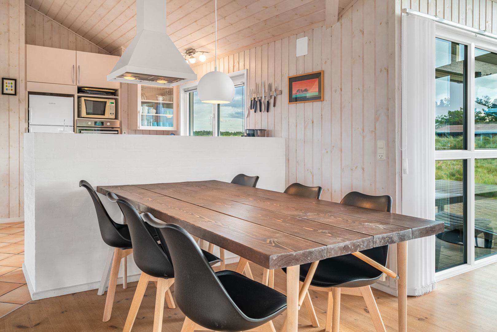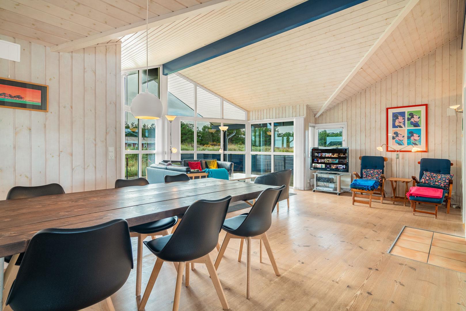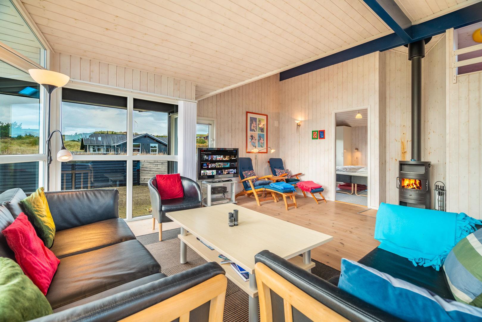 Der Innenbereich deines Ferienhauses am Ærenprisvej 3 empfängt dich mit einer warmen, freundlichen Atmosphäre – ideal für einen entspannten Urlaub in Henne Strand. Der kombinierte Wohn- und Essbereich ist offen gestaltet und lädt zum gemeinsamen Verweilen ein. Vor allem der Kamin schafft echte Ferienhaus-Stimmung, wenn es draußen etwas frischer ist. Durch die großen Fenster fällt viel Tageslicht und du genießt einen schönen Blick auf die Dünen.