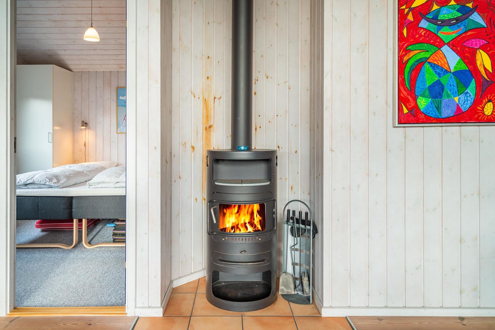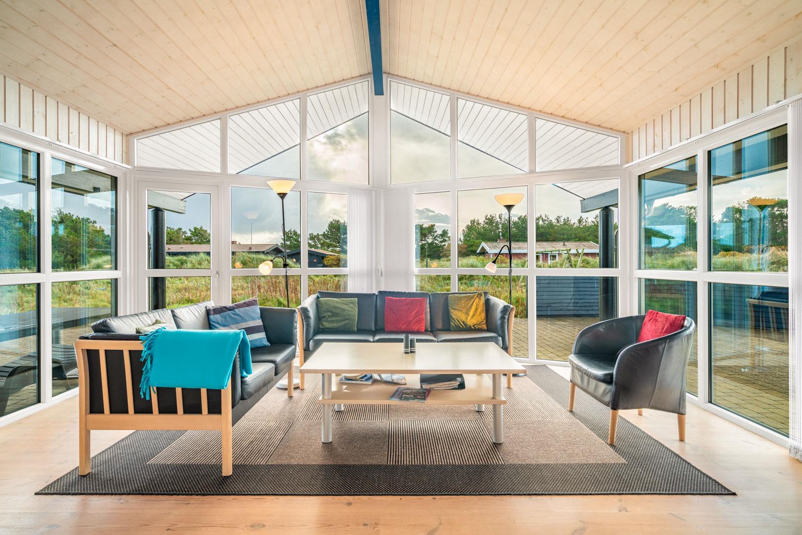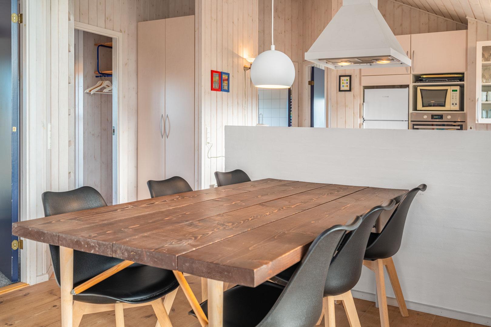 Der Innenbereich deines Ferienhauses am Ærenprisvej 3 empfängt dich mit einer warmen, freundlichen Atmosphäre – ideal für einen entspannten Urlaub in Henne Strand. Der kombinierte Wohn- und Essbereich ist offen gestaltet und lädt zum gemeinsamen Verweilen ein. Vor allem der Kamin schafft echte Ferienhaus-Stimmung, wenn es draußen etwas frischer ist. Durch die großen Fenster fällt viel Tageslicht und du genießt einen schönen Blick auf die Dünen.