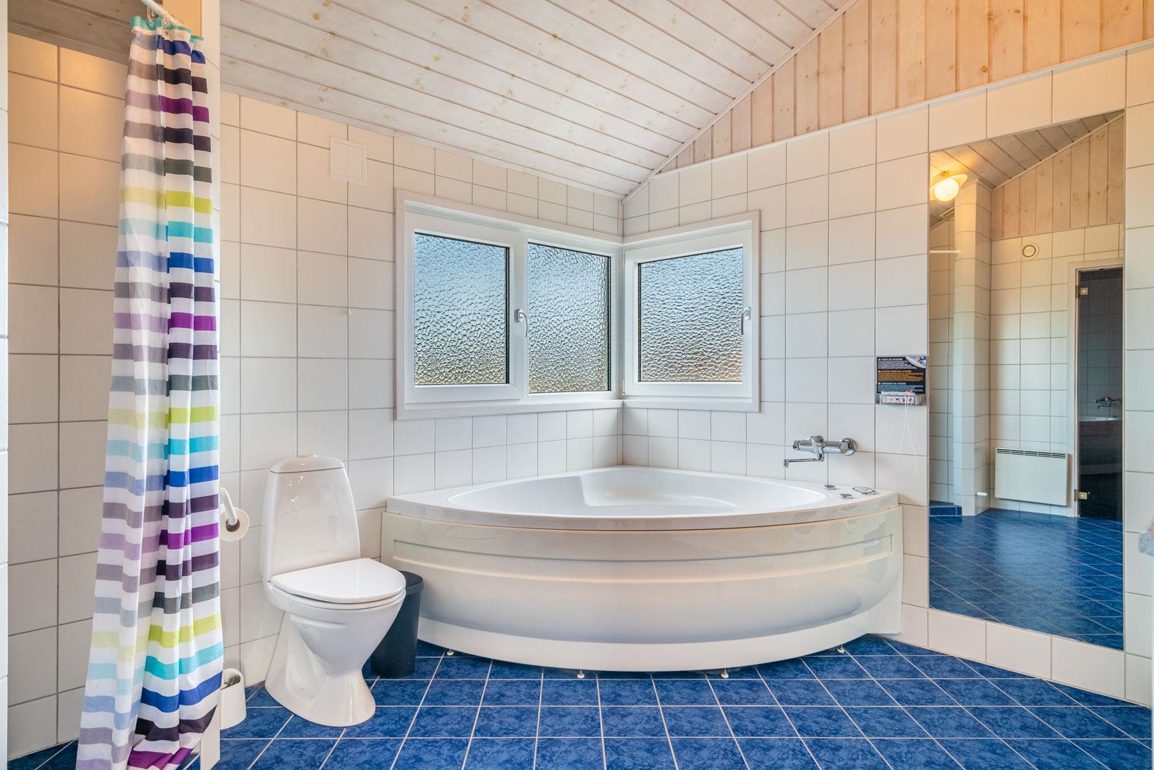 In insgesamt 3 Schlafzimmern finden bis zu 6 Personen ausreichend Rückzugsmöglichkeiten. Das Badezimmer überzeugt mit Fußbodenheizung sowie Sauna und Whirlpool – perfekt, um nach einem Tag am Strand abzuschalten.