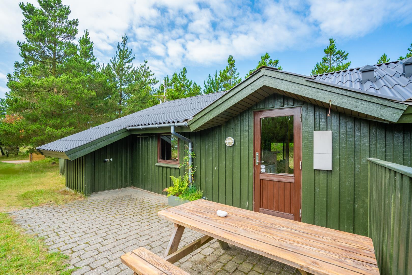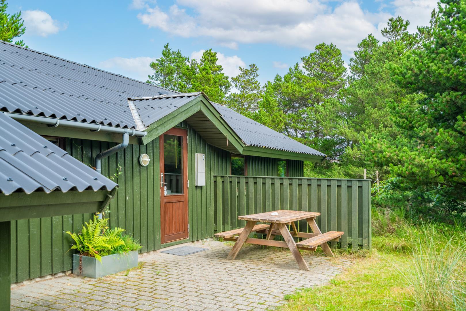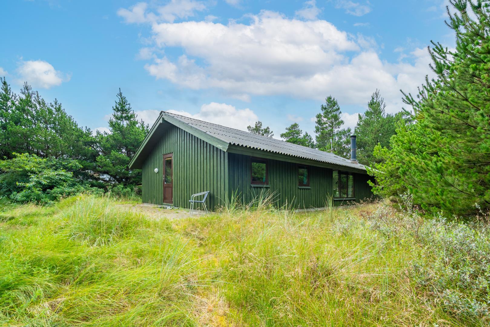 Gemütliches Holzferienhaus in Henne Strand mit WLAN, Kaminofen und zwei Terrassen, umgeben von Nadelbäumen und nah am Meer.