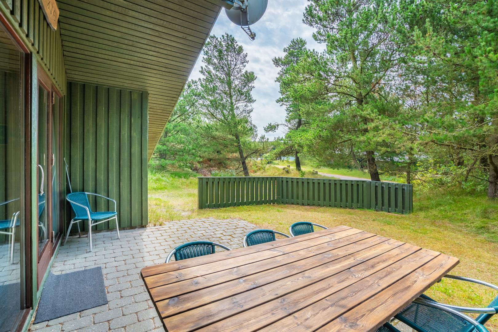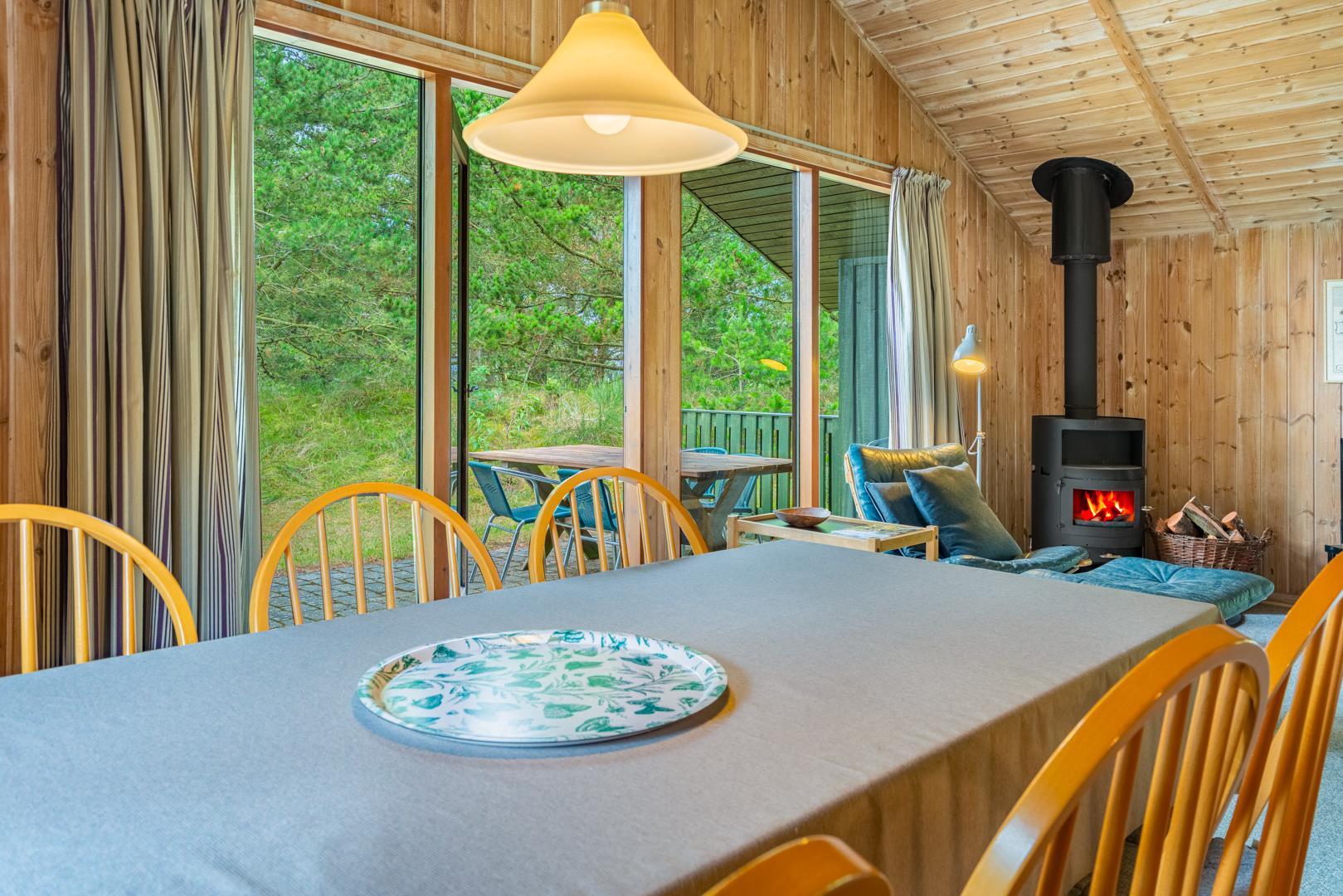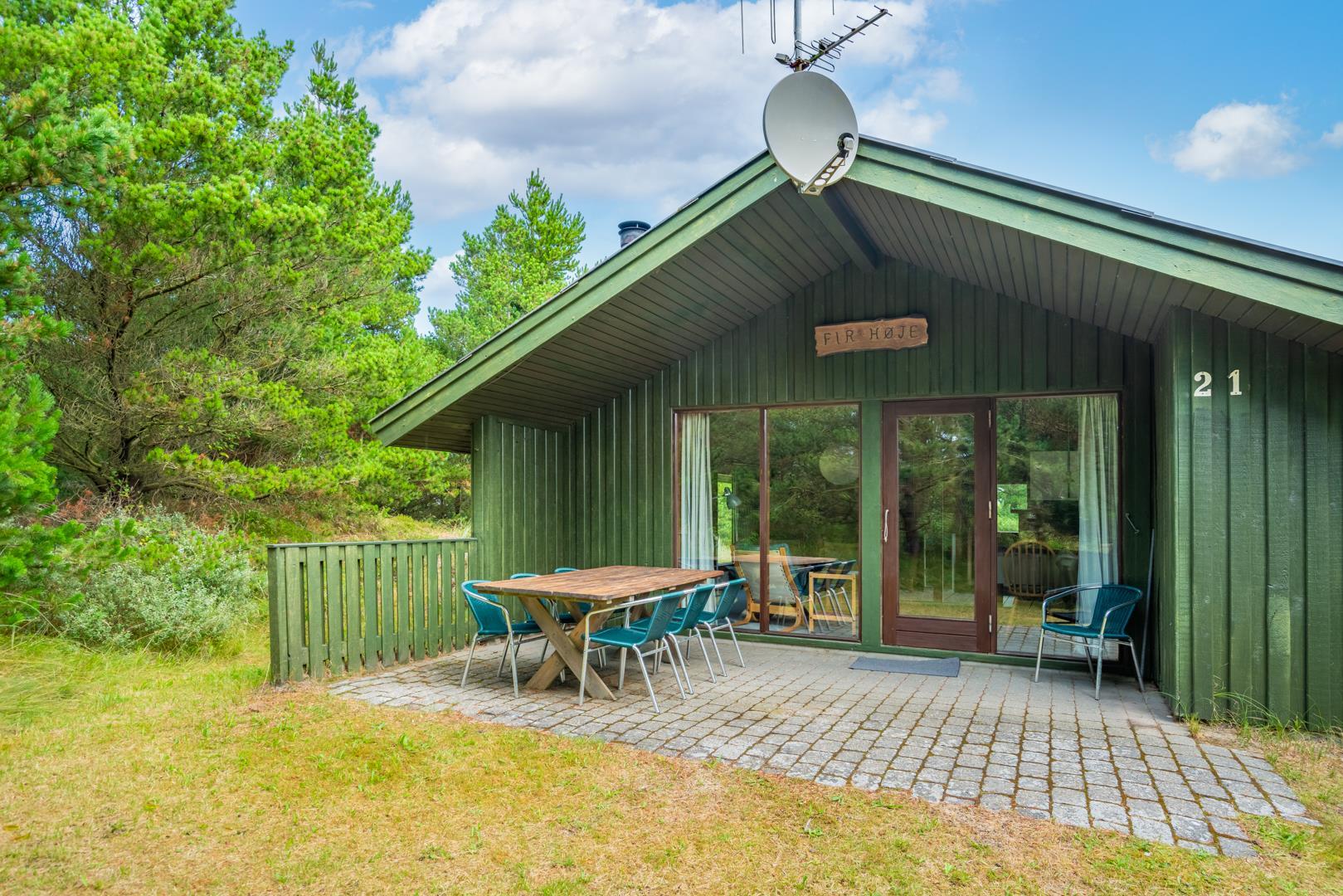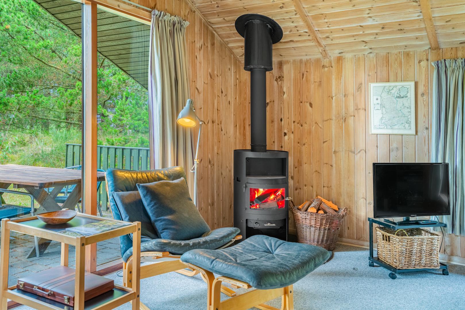 Gemütliches Holzferienhaus in Henne Strand mit WLAN, Kaminofen und zwei Terrassen, umgeben von Nadelbäumen und nah am Meer.