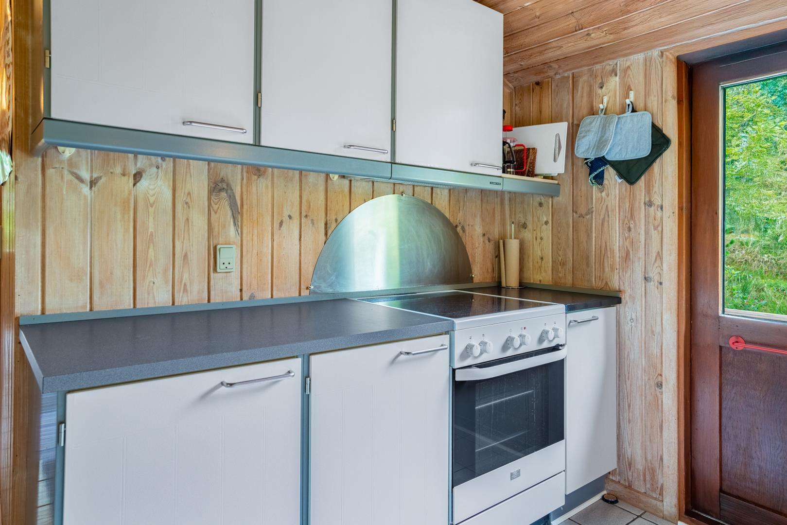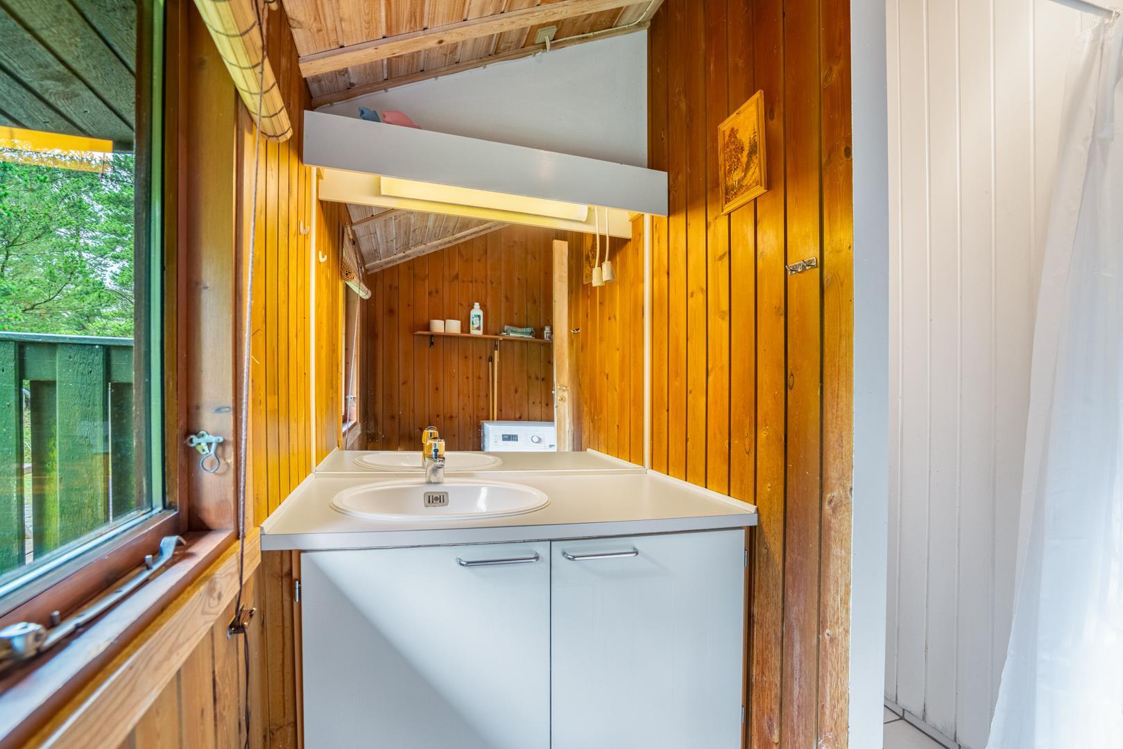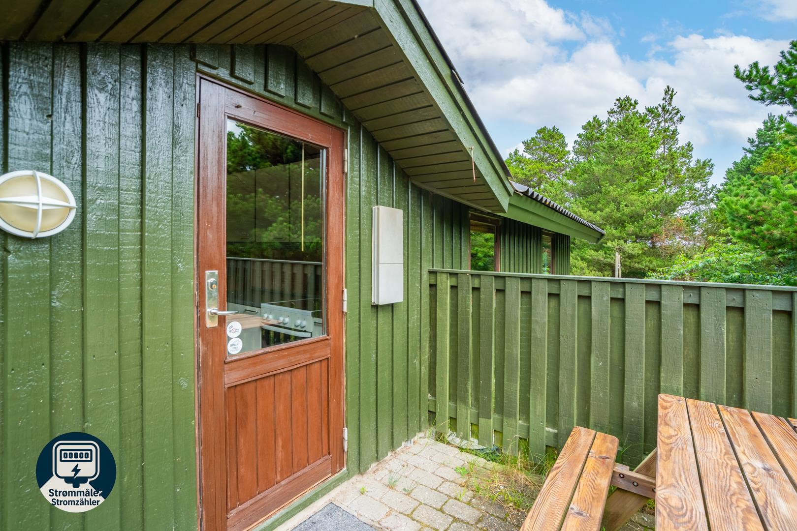Holzferienhaus befindet sich auf einem großen, ungestörten und von Nadelbäumen umgebenen Heidegrund. Vom Wohnzimmer aus gelangt man auf die teilweise überdachte Terrasse. Eine kleinere Terrasse befindet sich vor der Küche.