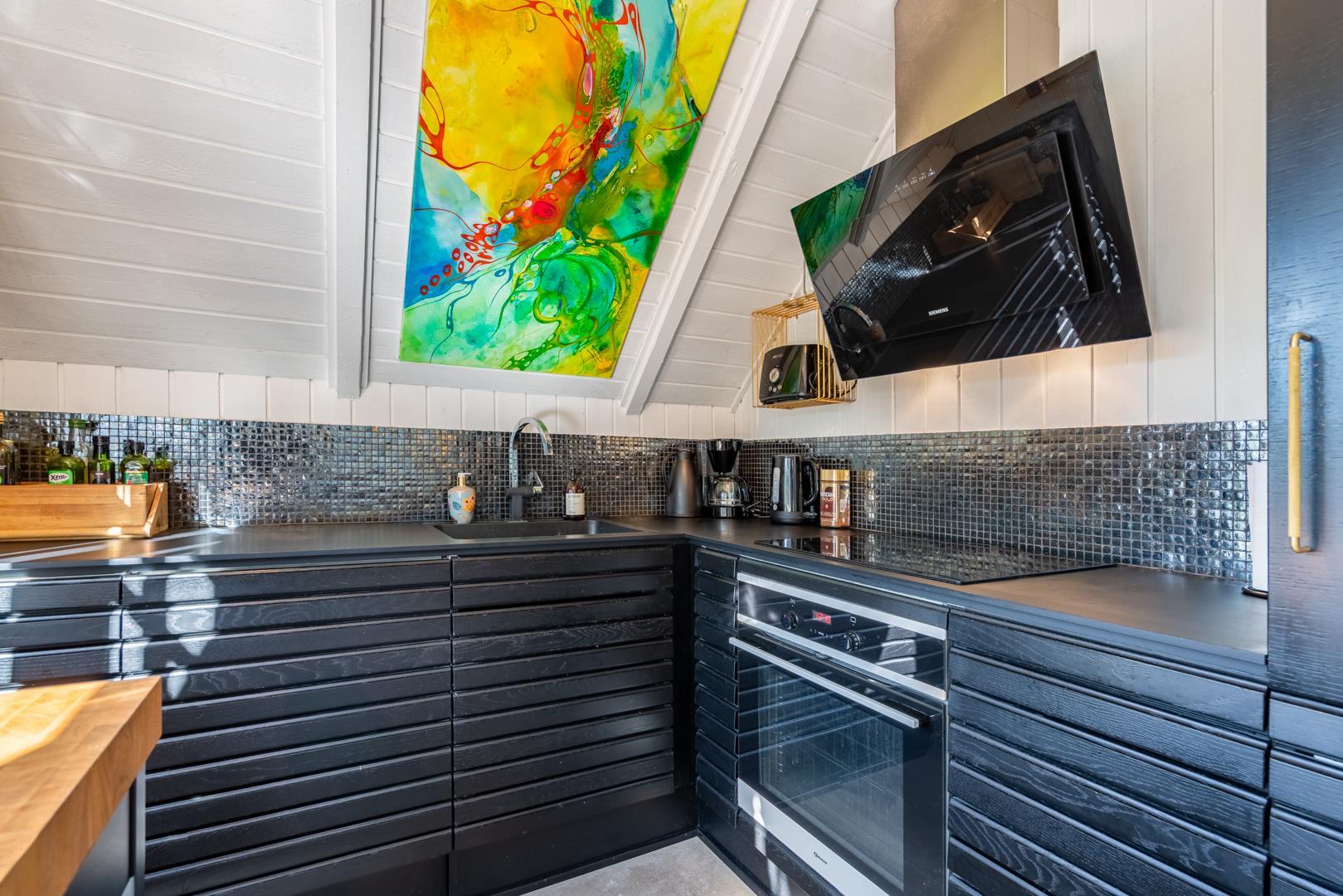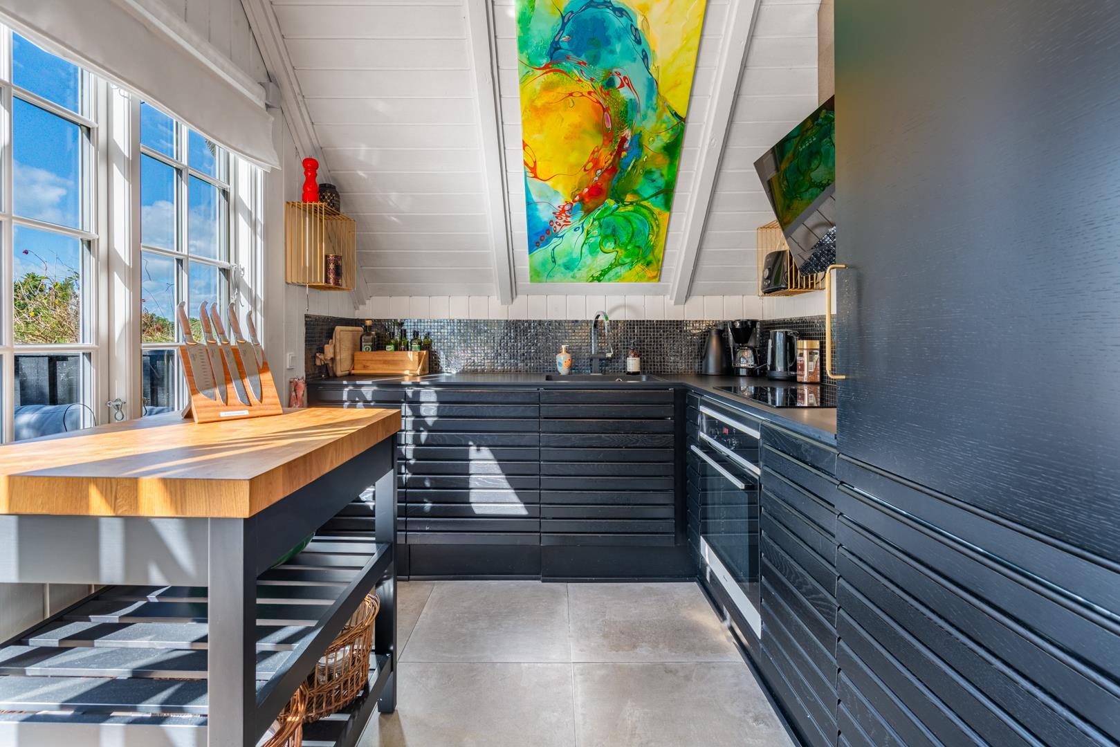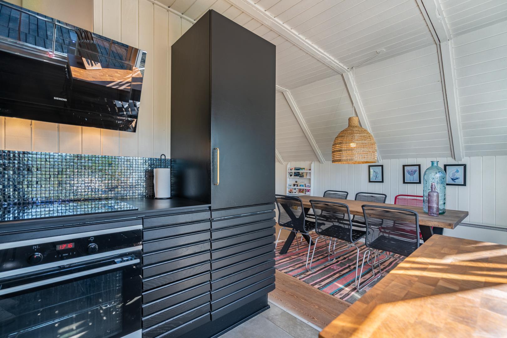 Die offene Küche mit dem gemütlichen Essbereich bietet direkten Zugang zur großen, südlich ausgerichteten Holzterrasse – ideal für den Morgenkaffee in der Sonne oder für lange Sommerabende im Freien.