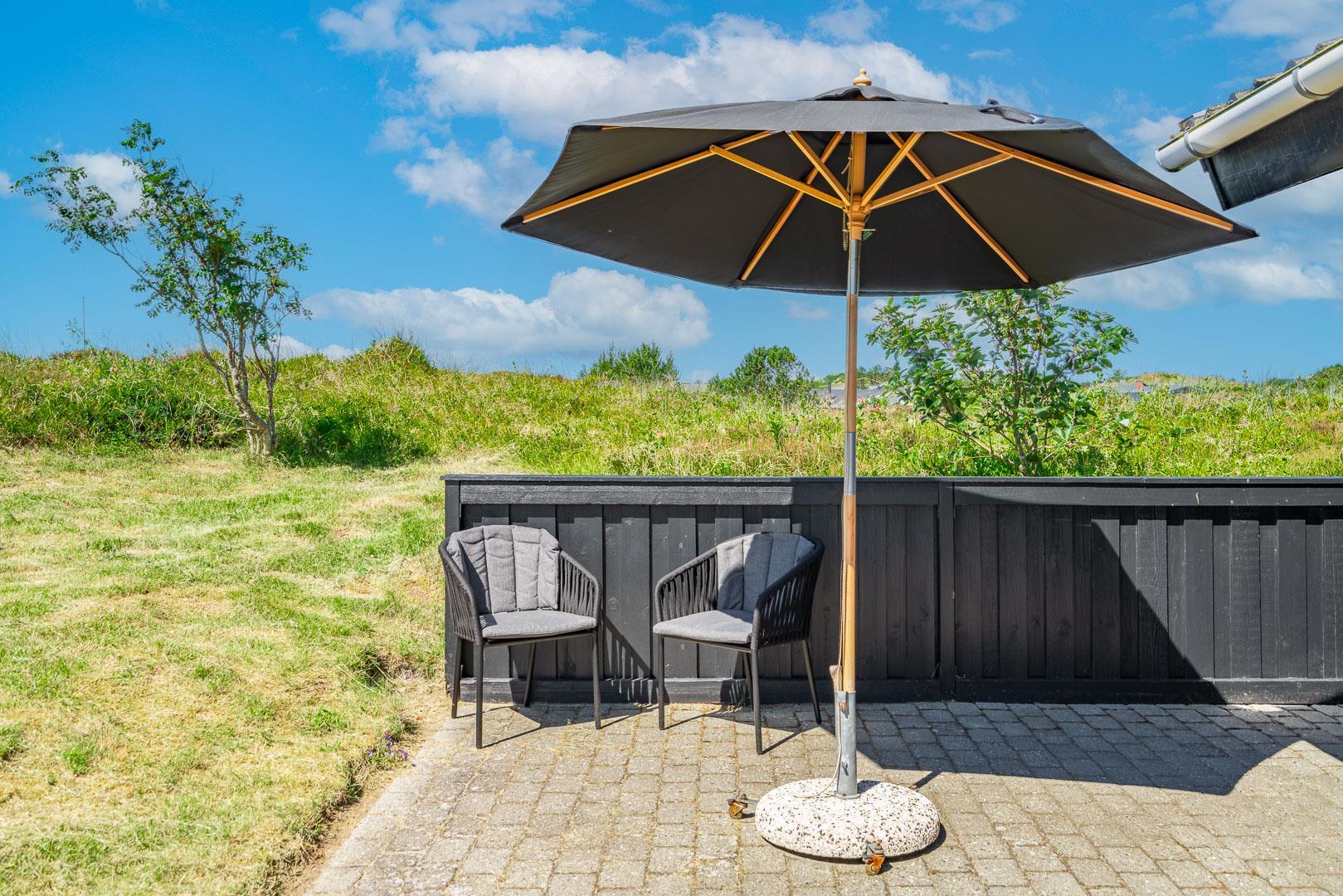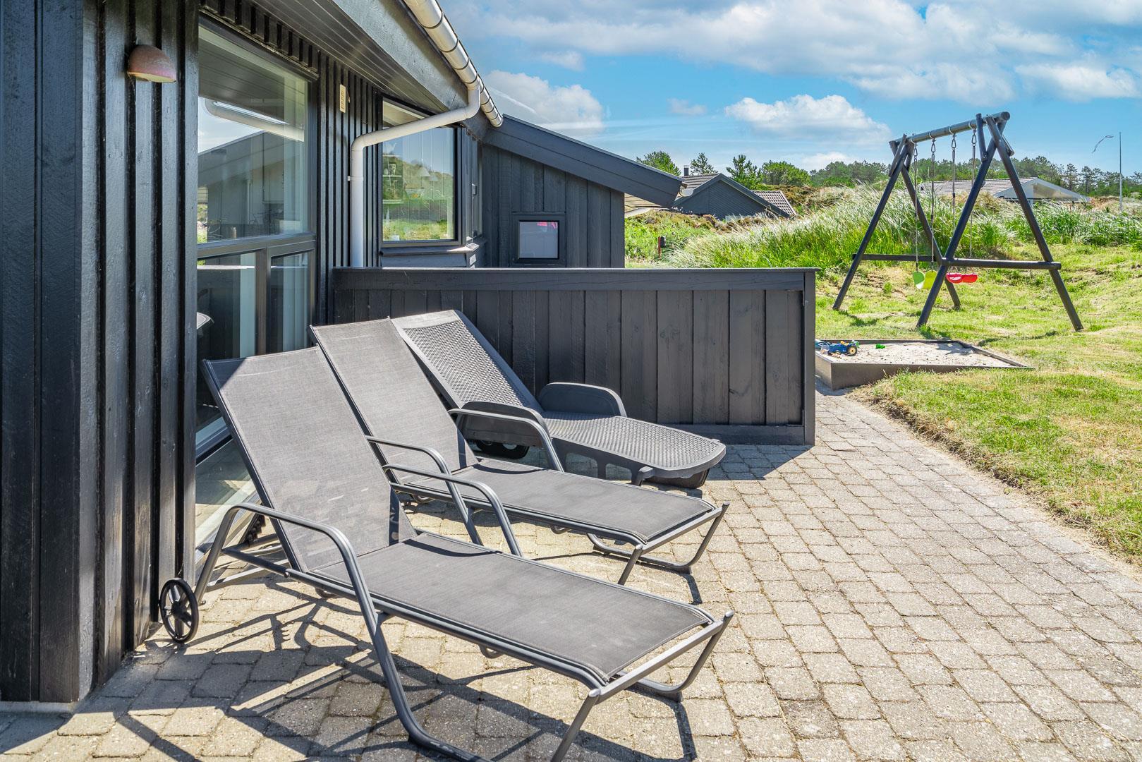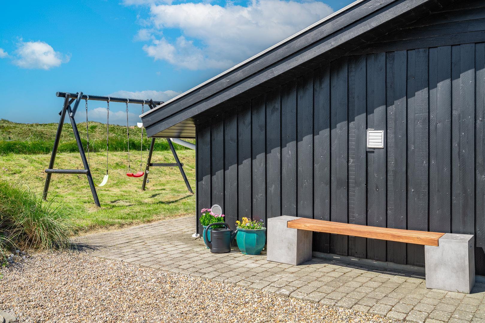 Draußen warten noch mehr Freuden, mit schönen Terrassen, Gartenmöbeln und Liegestühlen zum Entspannen unter freiem Himmel. Für die kleinen Feriengäste gibt es einen Sandkasten und eine Schaukel, die sie lange Zeit beschäftigen werden.