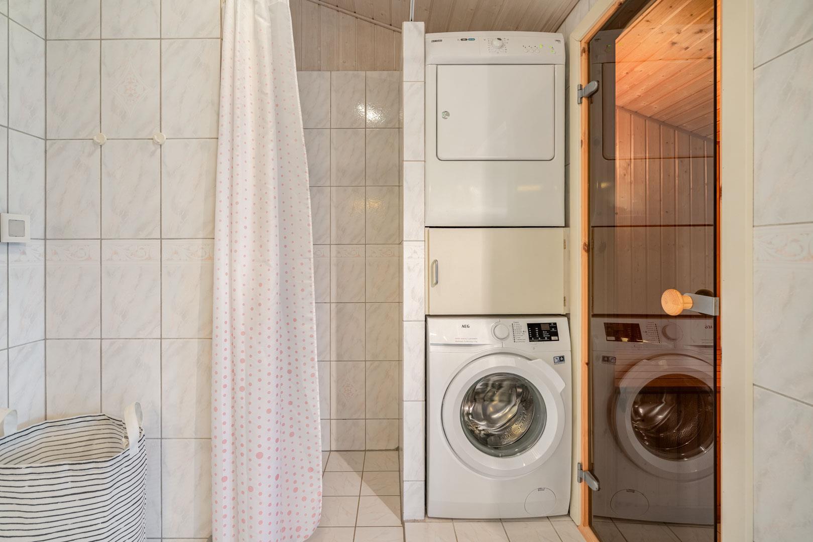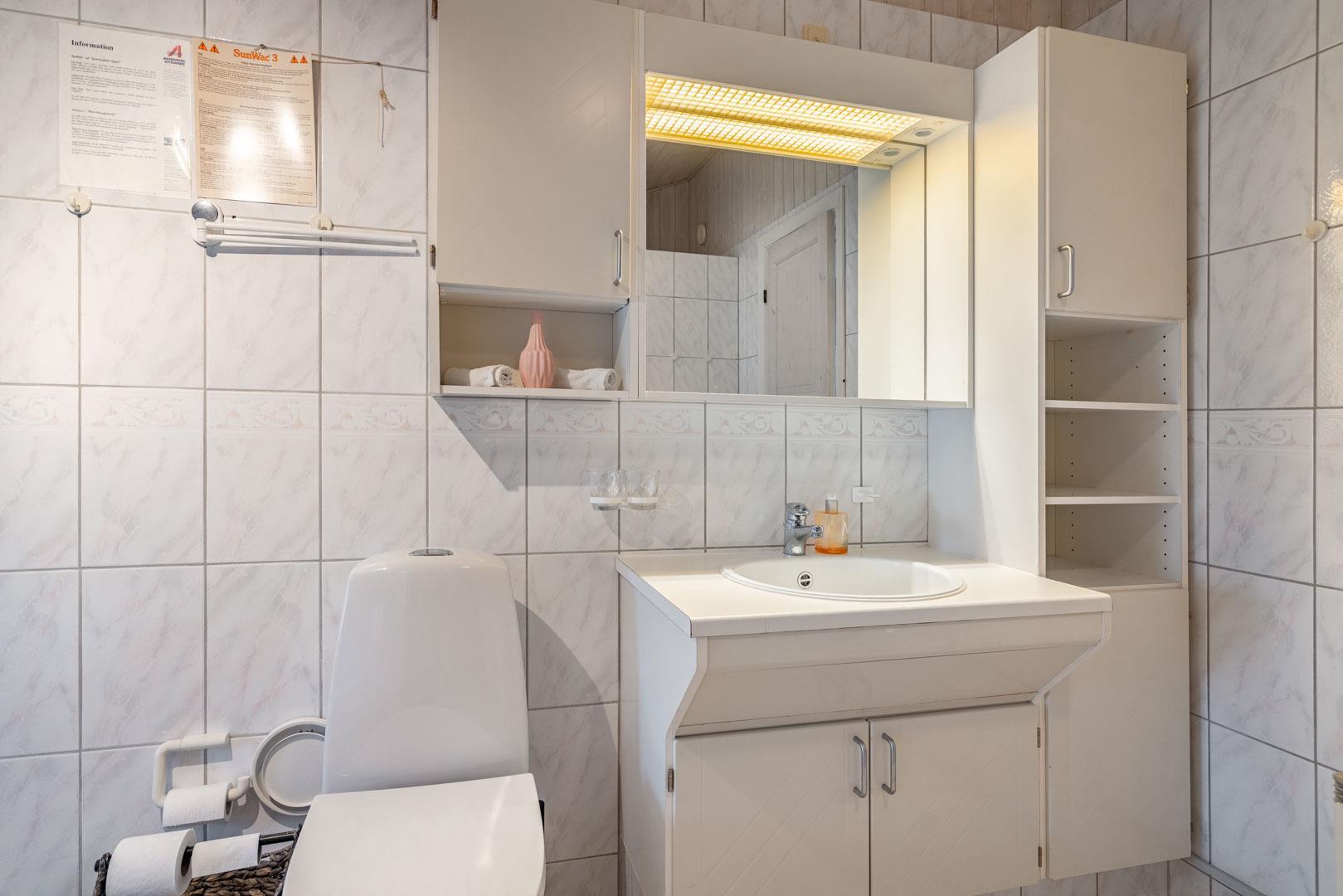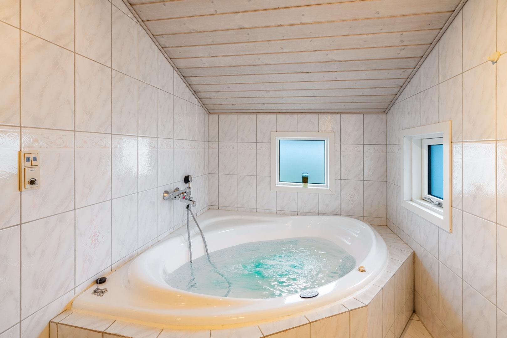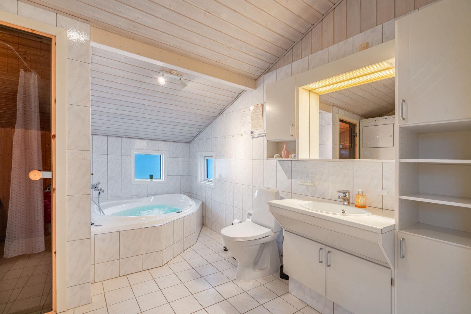 Das Ferienhaus verfügt über ein Badezimmer und ein zusätzliches Gäste-WC. Im großen, komfortablen Badezimmer können Sie sich mit etwas Wellness verwöhnen, da es sowohl mit einem Whirlpool als auch einer Sauna ausgestattet ist.