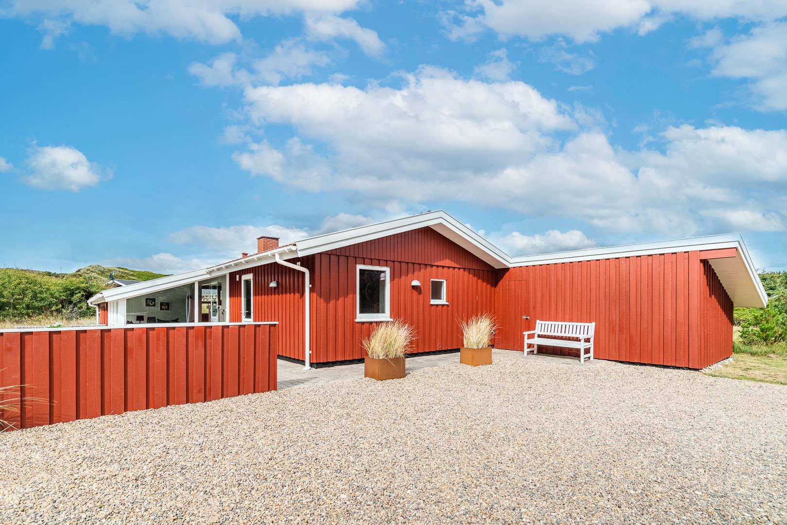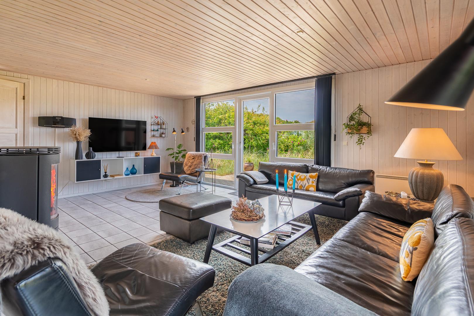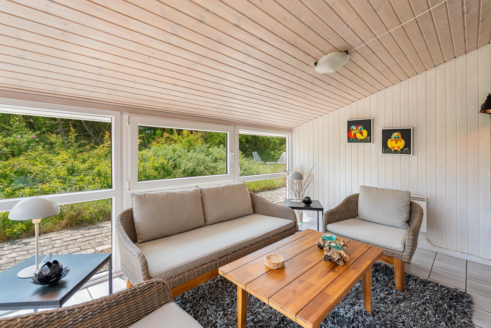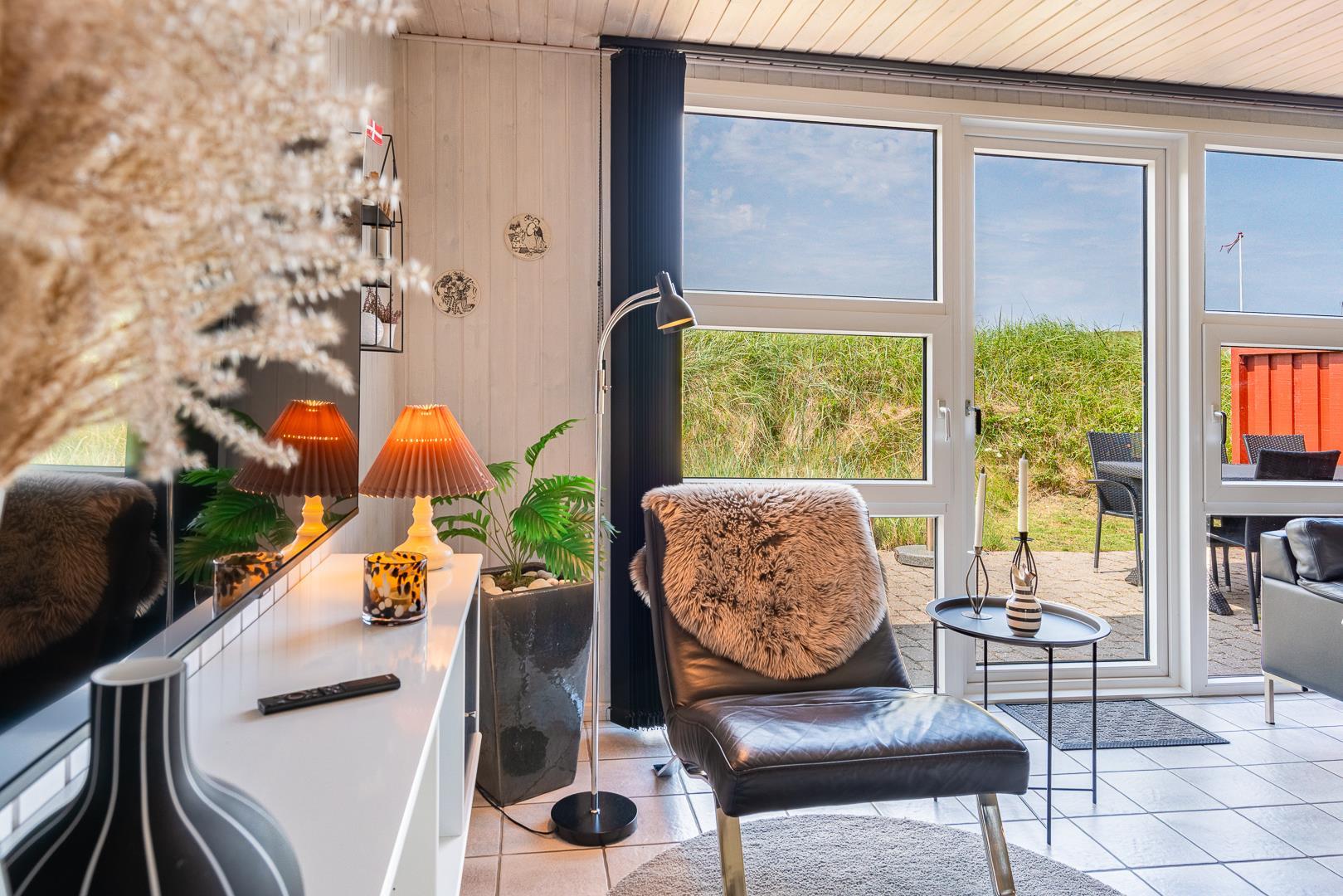 Die offene Küche/Esszimmer ist gut in das gemütliche Wohnzimmer integriert, wo der Holzofen in der Mitte des Raumes für eine schöne Atmosphäre sorgt, und TV "55". Zu den weiteren Einrichtungen gehört ein schöner Eingangsbereich mit Waschmaschine und ein toller Wintergarten, wo Sie reichlich Gelegenheit haben, bei einer guten Tasse Kaffee die Aussicht auf die umliegende Natur zu genießen. Im Wintergarten gibt es außerdem viel Platz, um sich bei Familienspielen zu messen oder in ruhiger Umgebung in ein gutes Buch zu vertiefen. Aber mit einer Terrasse, die zum Entspannen unter freiem Himmel inmitten der Natur einlädt, schafft dieses Ferienhaus das ganze Jahr über den perfekten Rahmen für einen unvergesslichen Urlaub am Henne Strand. Das Parken mit einem Wohnmobil auf dem Grundstück ist nicht erlaubt.