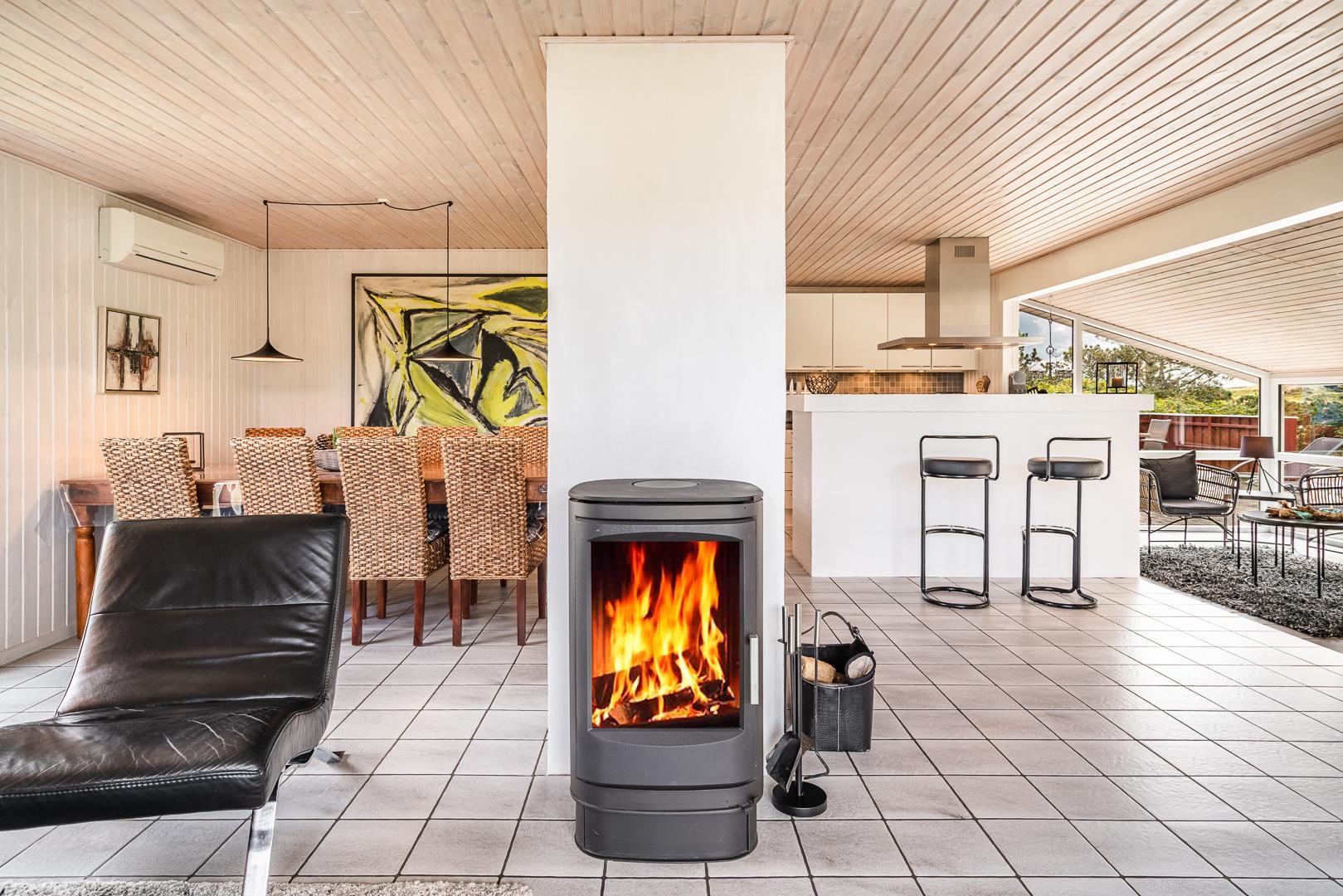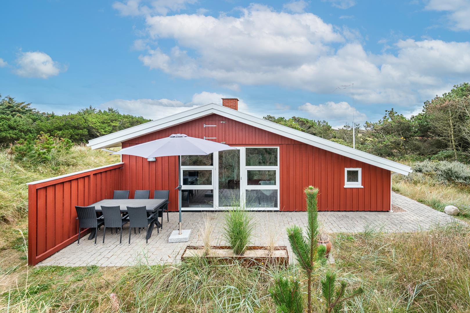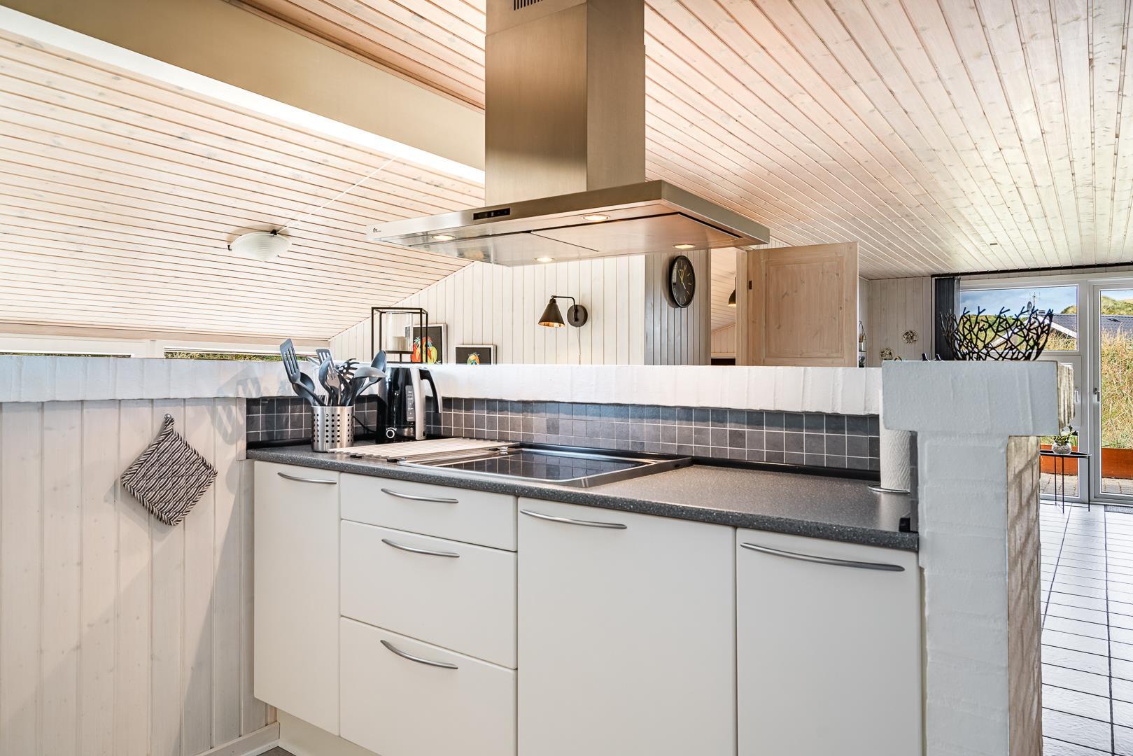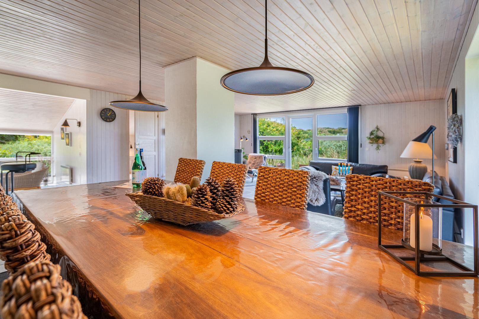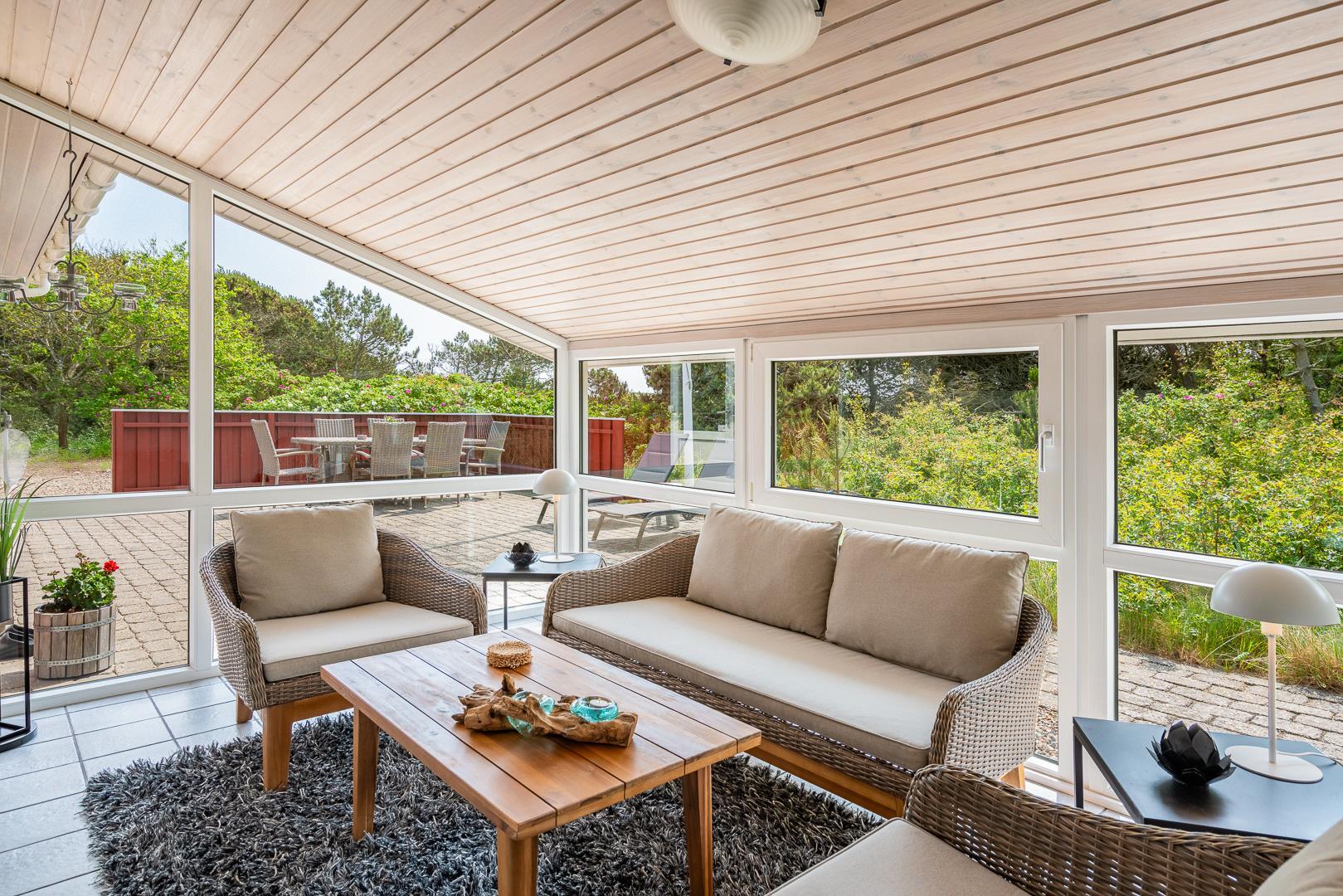 Die offene Küche/Esszimmer ist gut in das gemütliche Wohnzimmer integriert, wo der Holzofen in der Mitte des Raumes für eine schöne Atmosphäre sorgt, und TV "55". Zu den weiteren Einrichtungen gehört ein schöner Eingangsbereich mit Waschmaschine und ein toller Wintergarten, wo Sie reichlich Gelegenheit haben, bei einer guten Tasse Kaffee die Aussicht auf die umliegende Natur zu genießen. Im Wintergarten gibt es außerdem viel Platz, um sich bei Familienspielen zu messen oder in ruhiger Umgebung in ein gutes Buch zu vertiefen. Aber mit einer Terrasse, die zum Entspannen unter freiem Himmel inmitten der Natur einlädt, schafft dieses Ferienhaus das ganze Jahr über den perfekten Rahmen für einen unvergesslichen Urlaub am Henne Strand. Das Parken mit einem Wohnmobil auf dem Grundstück ist nicht erlaubt.