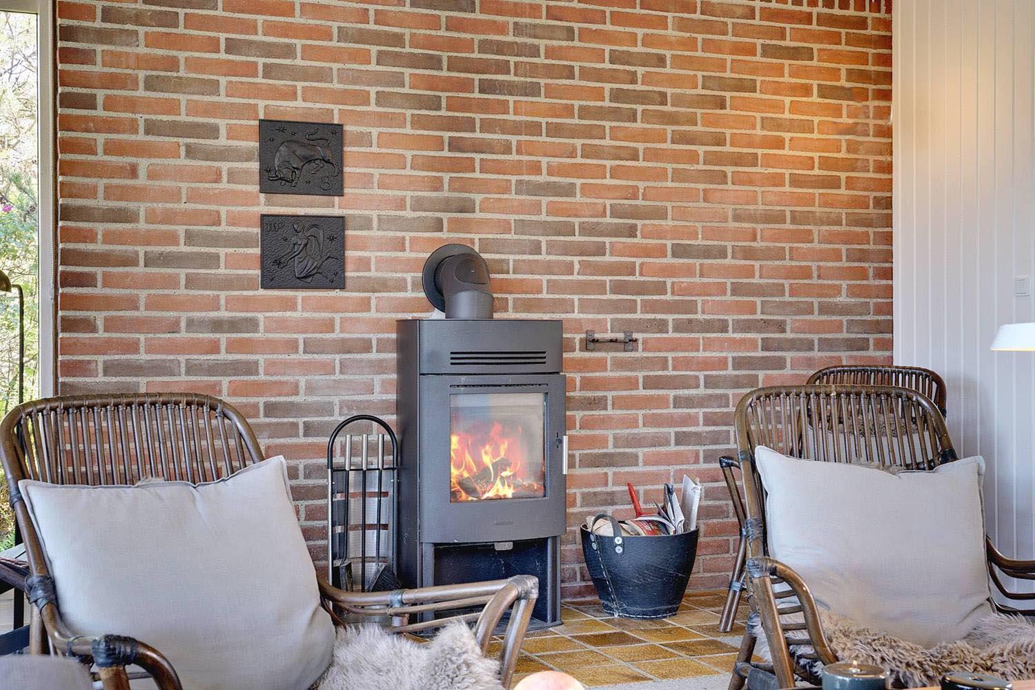 Den Sonnenuntergang und die spektakuläre Umgebung genießen Sie vom Wintergarten oder vom Wohnzimmer des Hauses aus. Beide sind wunderschöne, nach Westen ausgerichtete Zimmer mit großen Fenstern. Die Küche liegt offen zum Wohnzimmer, das eine rustikale Backsteinmauer und einen Holzofen hat.