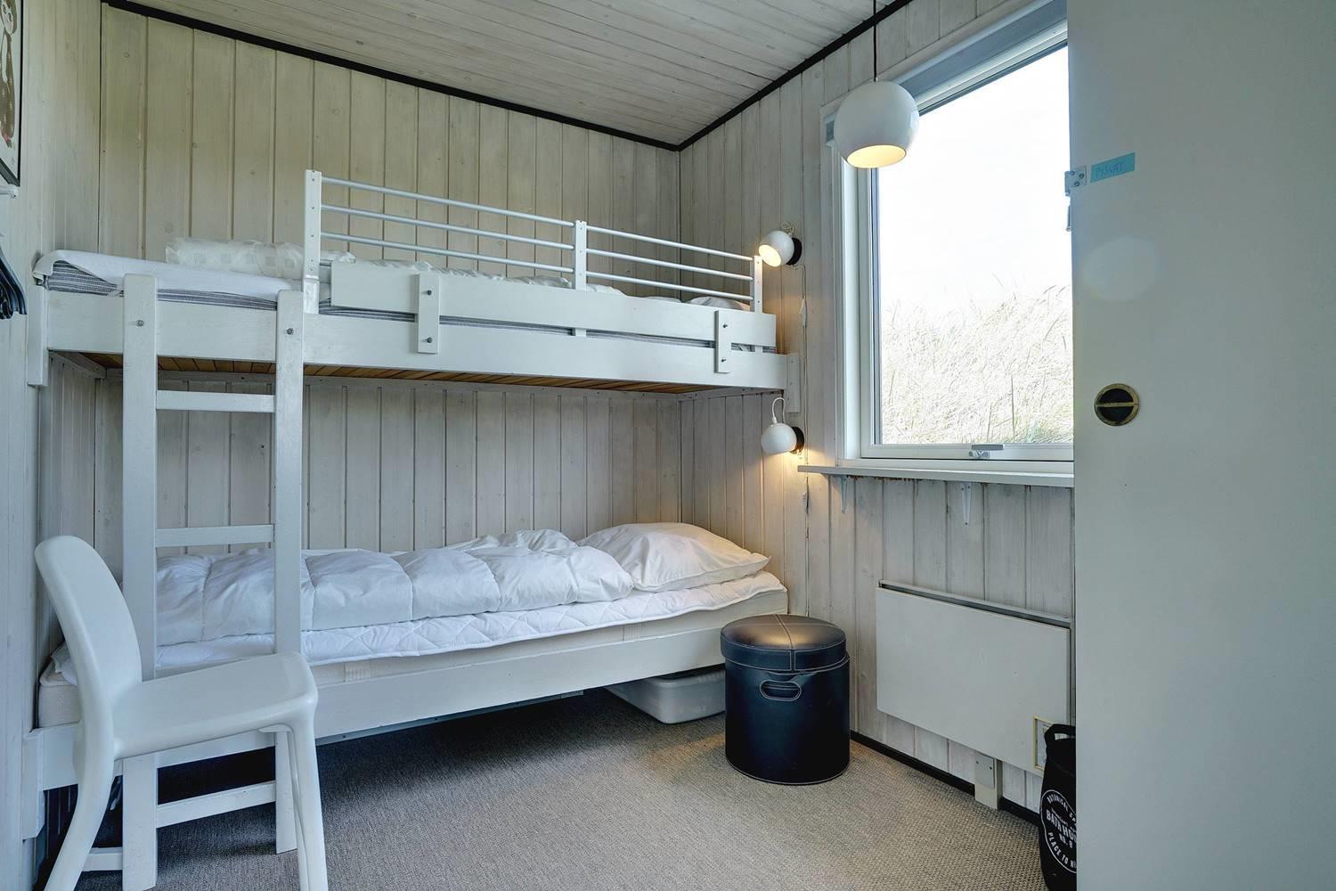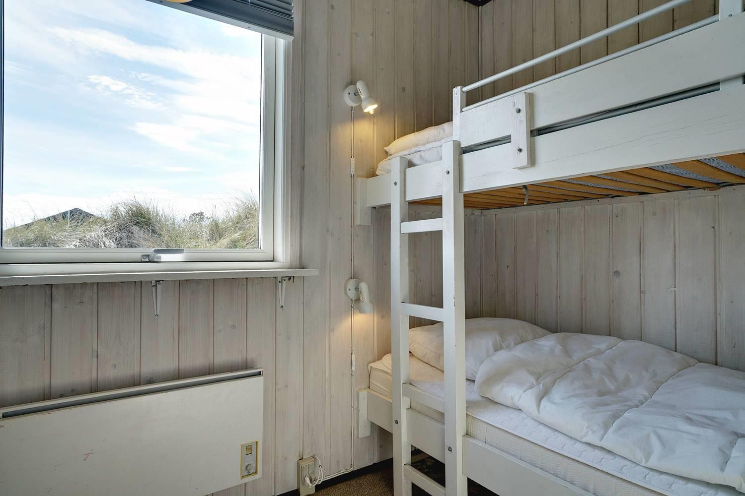 Bettengrösse: 2 Doppelbetten 140 x 200 cm + 1 Etagenbett 70 x 195 cm + 1 Etagenbett, wobei das obere Bett 70 x 200 cm und das untere Bett 90 x 200 cm groß ist.