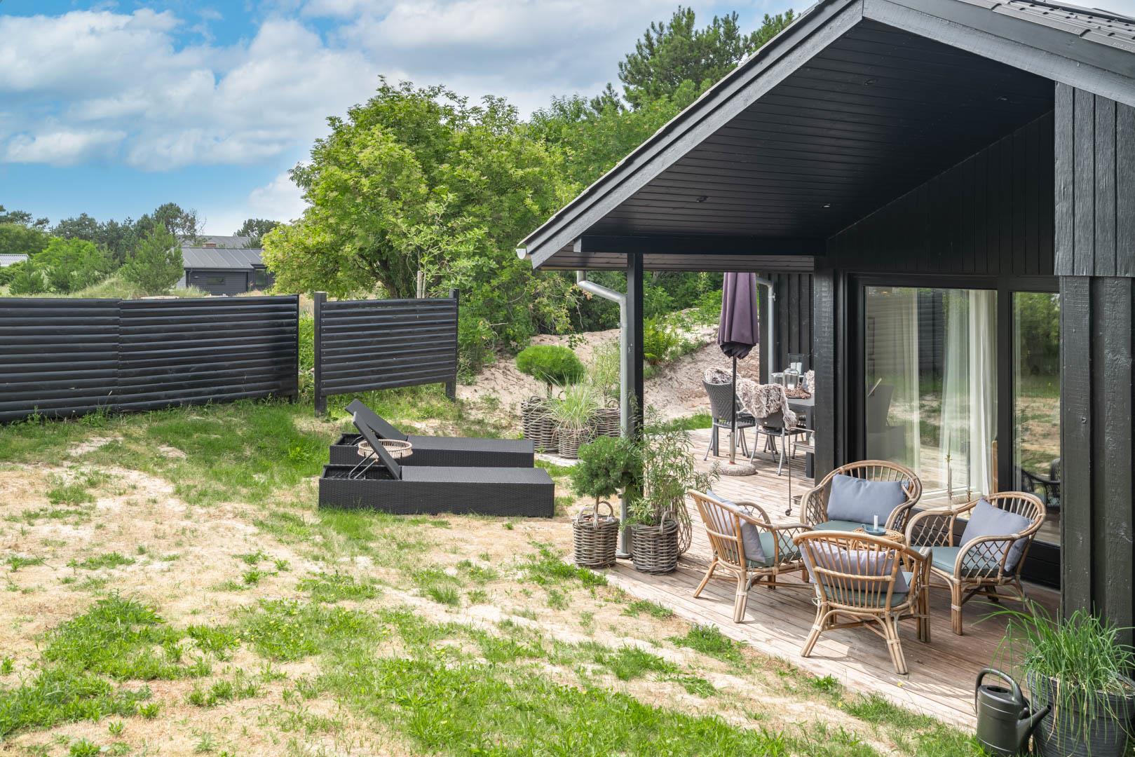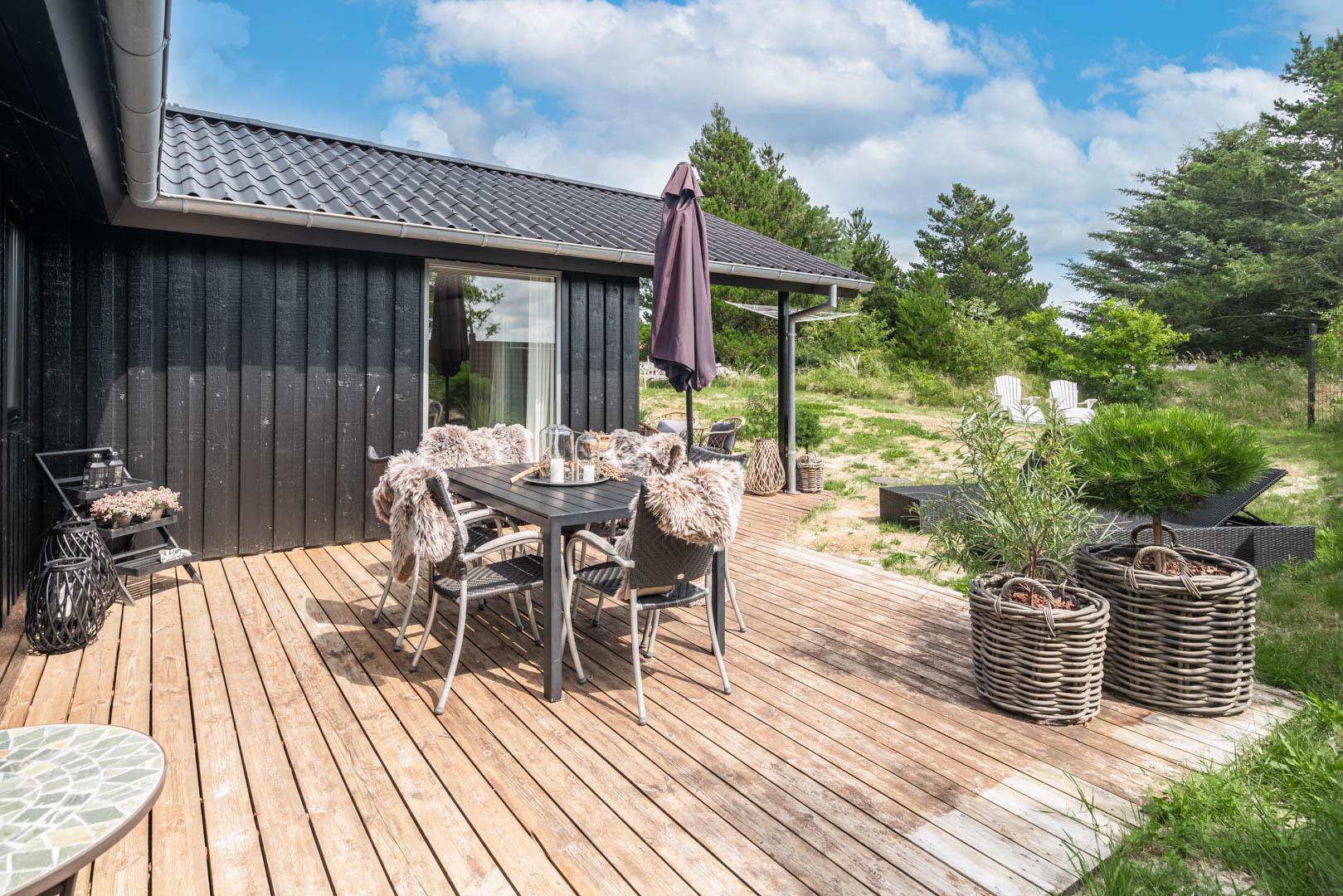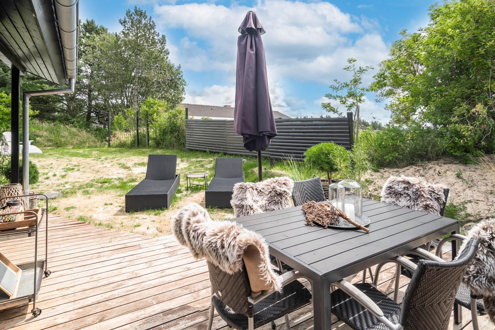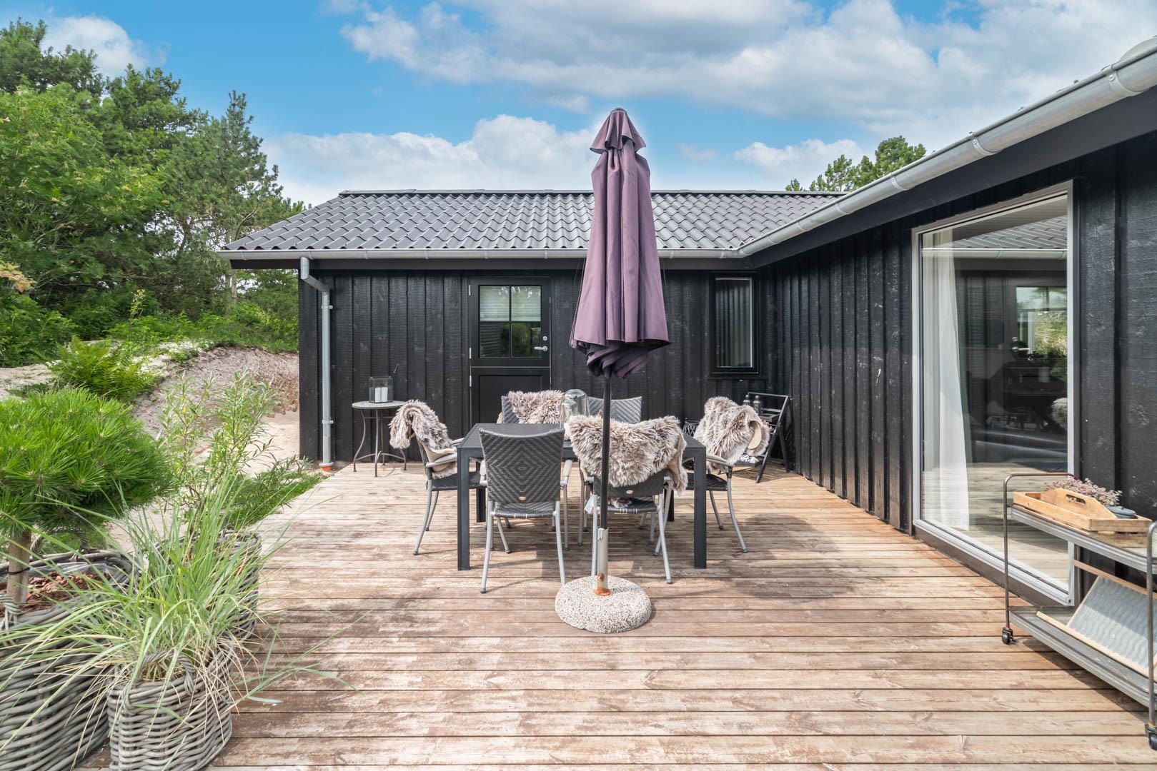 Vom Wohnzimmer aus haben Sie direkten Zugang zu einer teilweise überdachten Terrasse, auf der Sie den Morgenkaffee, das Mittagessen oder das Abendessen windgeschützt genießen können, ganz gleich, wie das Wetter ist. Die Terrasse ist mit Blick auf Gemütlichkeit und Komfort eingerichtet, und hier kann die ganze Familie zusammenkommen und die ruhigen Sommerabende genießen, während die Sonne über den Dünen untergeht.