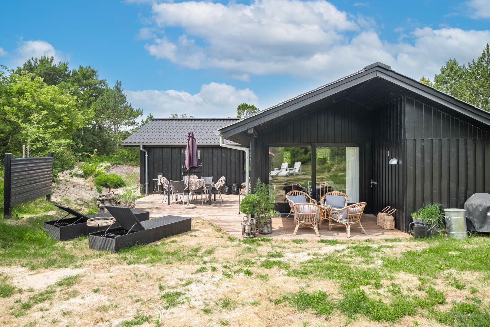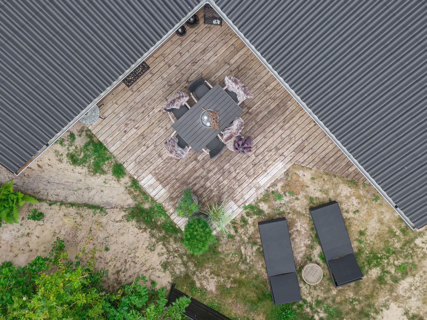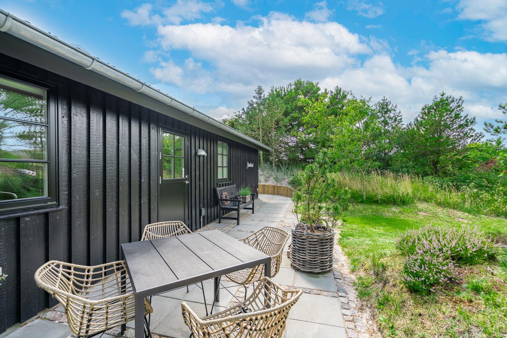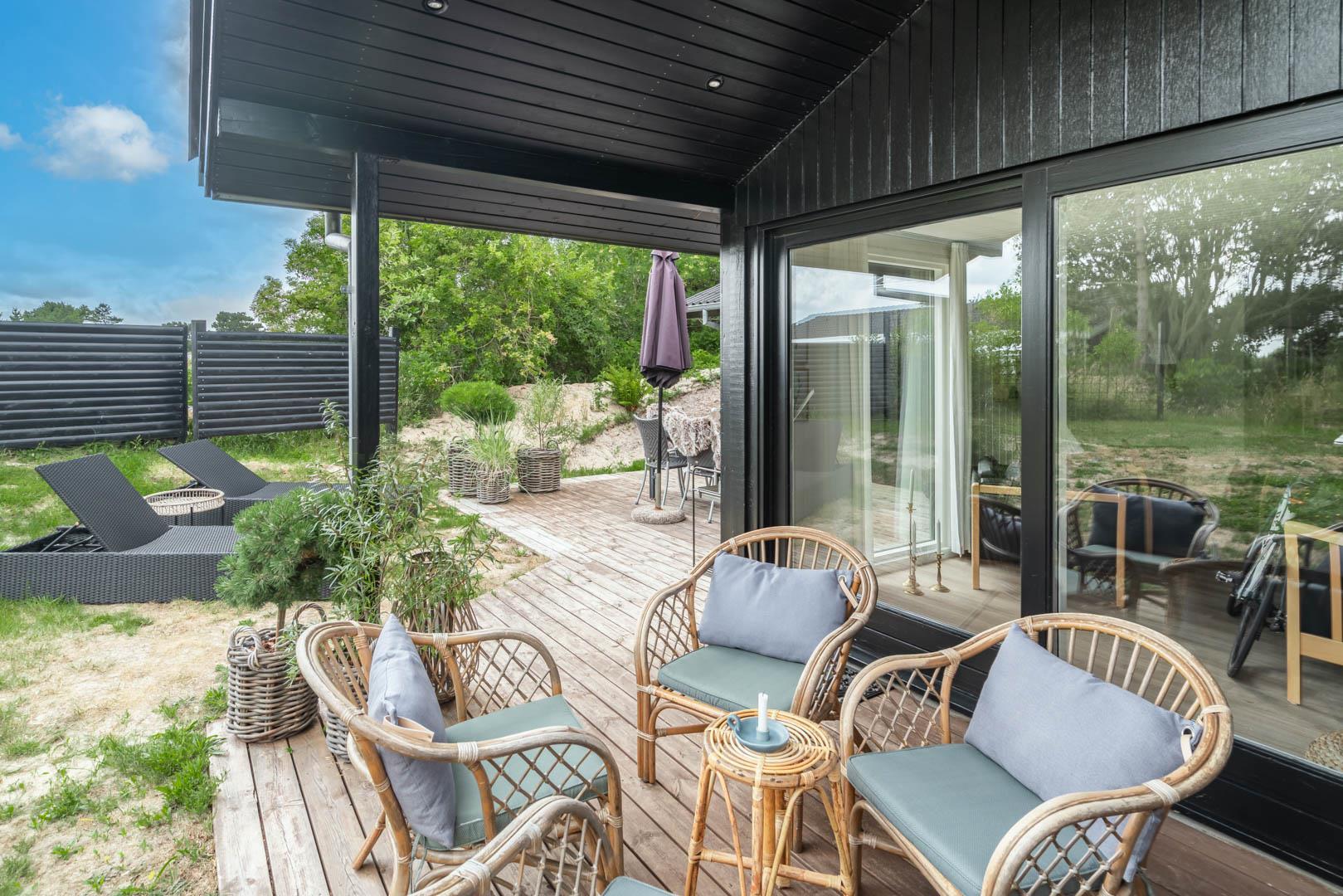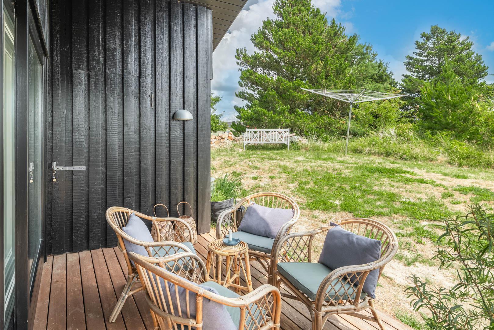 Vom Wohnzimmer aus haben Sie direkten Zugang zu einer teilweise überdachten Terrasse, auf der Sie den Morgenkaffee, das Mittagessen oder das Abendessen windgeschützt genießen können, ganz gleich, wie das Wetter ist. Die Terrasse ist mit Blick auf Gemütlichkeit und Komfort eingerichtet, und hier kann die ganze Familie zusammenkommen und die ruhigen Sommerabende genießen, während die Sonne über den Dünen untergeht.
