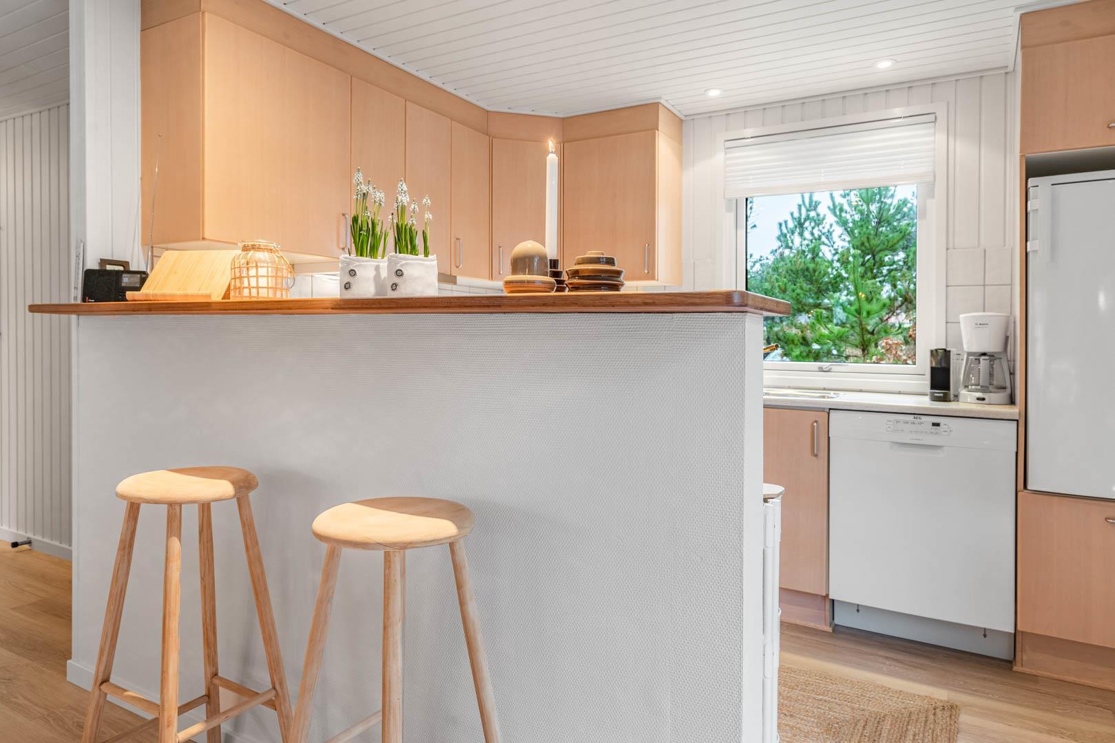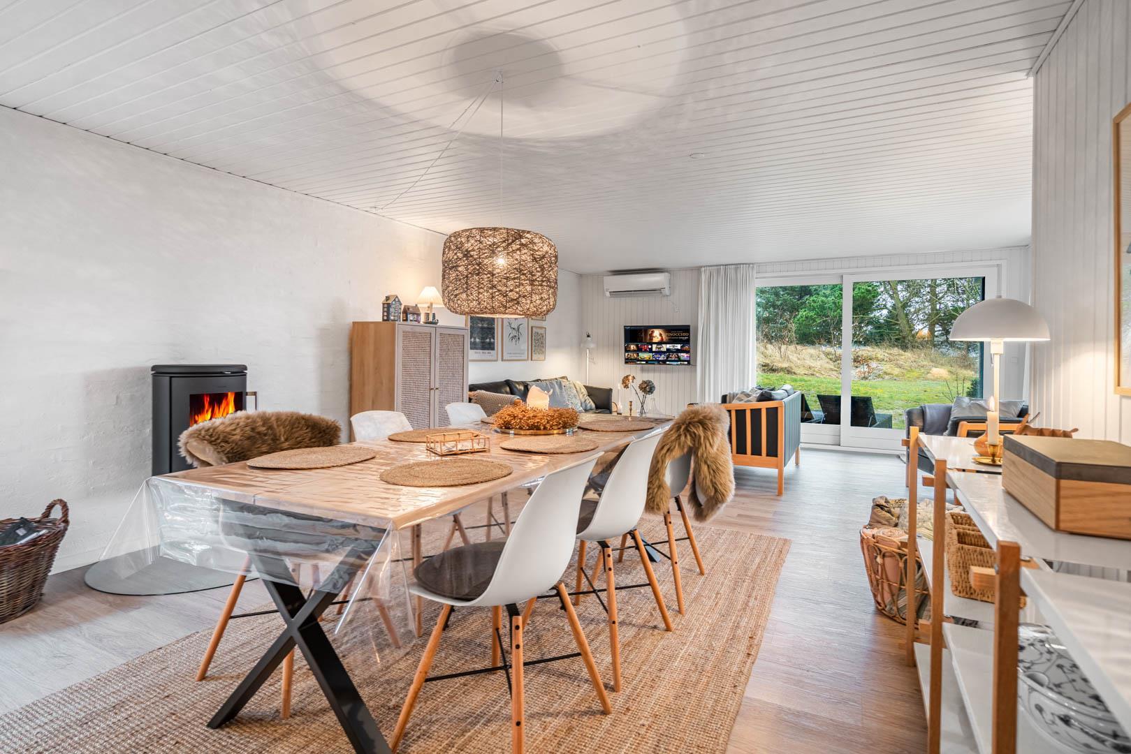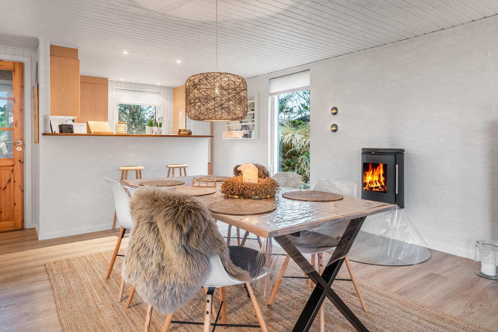 Im Inneren bietet das Ferienhaus einen schönen, offenen Wohnbereich, in dem eine gut ausgestattete Küche in offener Verbindung mit einem geschmackvoll eingerichteten Wohnzimmer steht. Hier finden Sie komfortable und schöne Möbel, einen Kaminofen und eine effiziente Wärmepumpe, die zusammen das perfekte Ambiente für das ganze Jahr schaffen. Der Kaminofen knistert gemütlich an kühleren Abenden und wärmt das Haus auf, sodass Sie sich in einer heimeligen und angenehmen Atmosphäre entspannen können. Das Ferienhaus ist geschmackvoll eingerichtet und darauf ausgelegt, dass Sie sich vom Moment des Betretens wie zu Hause fühlen.