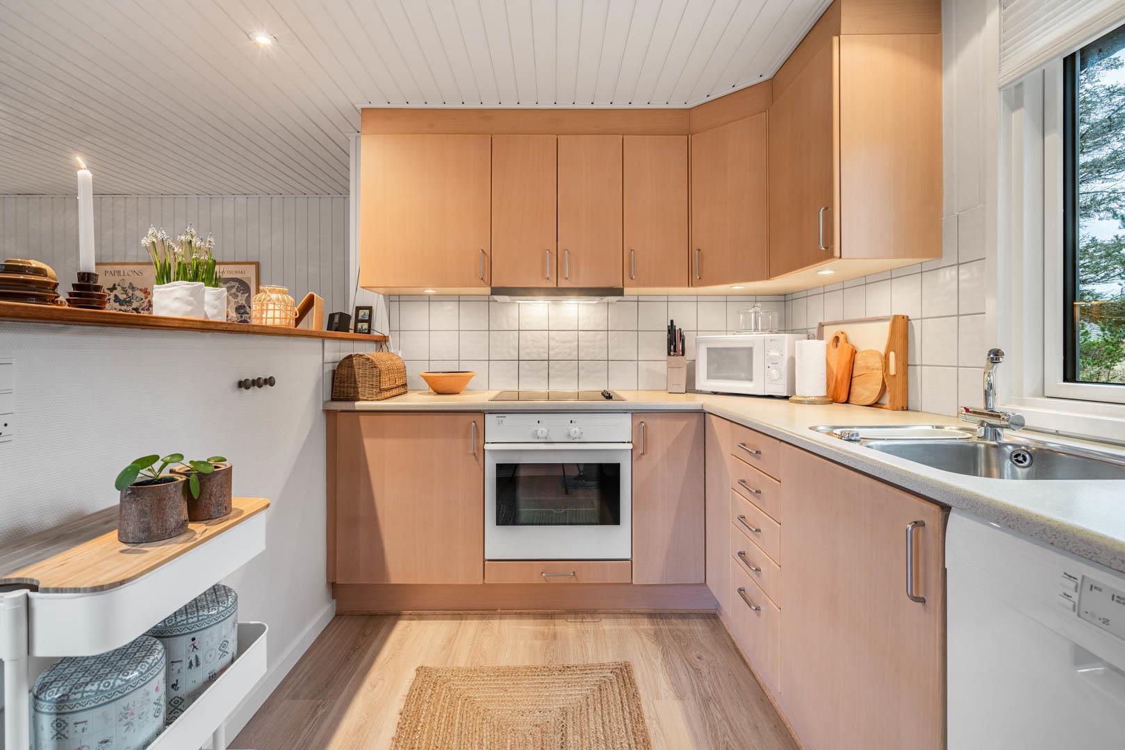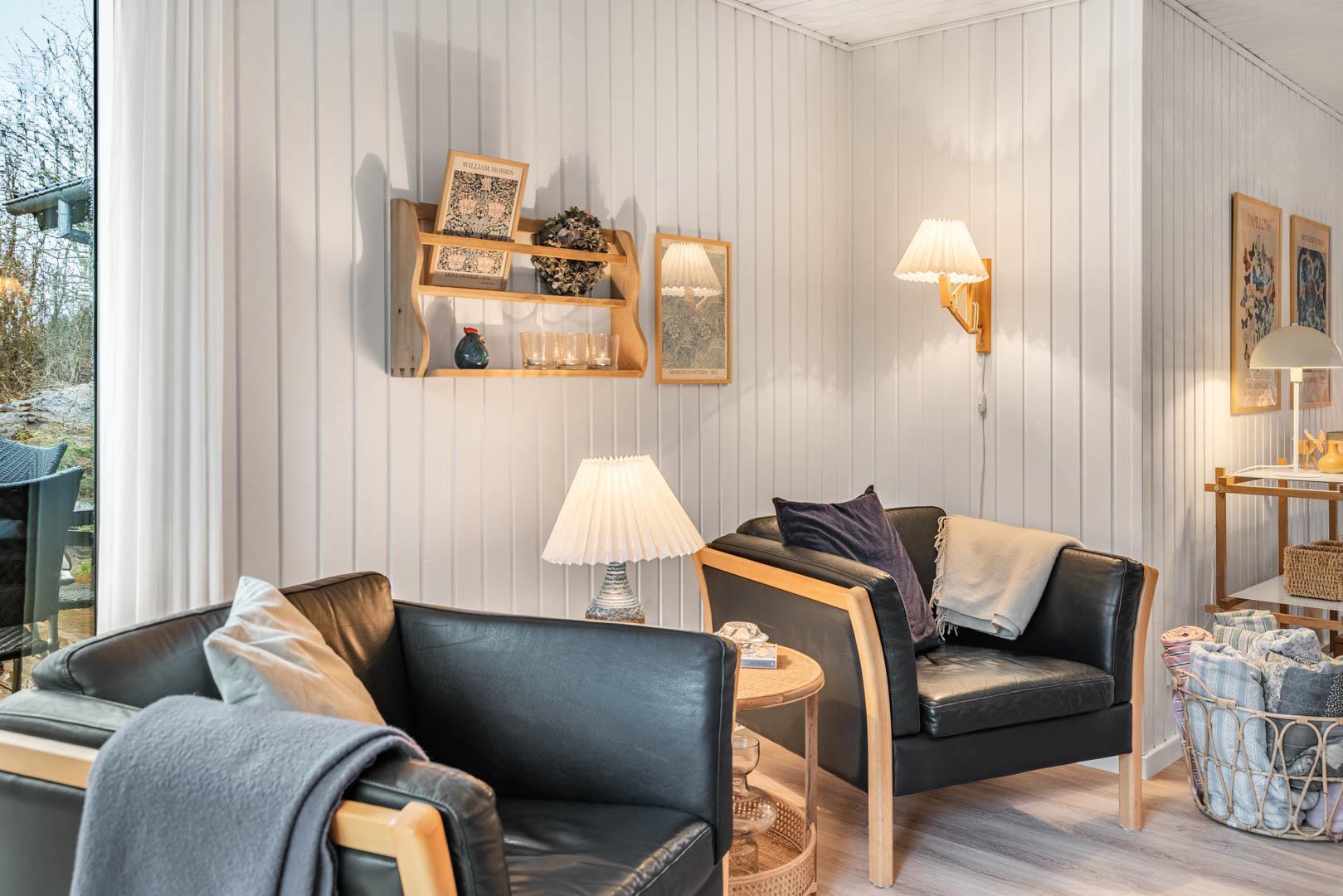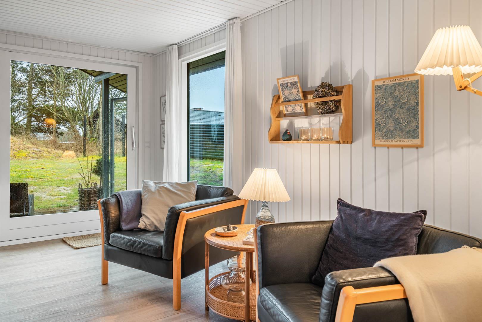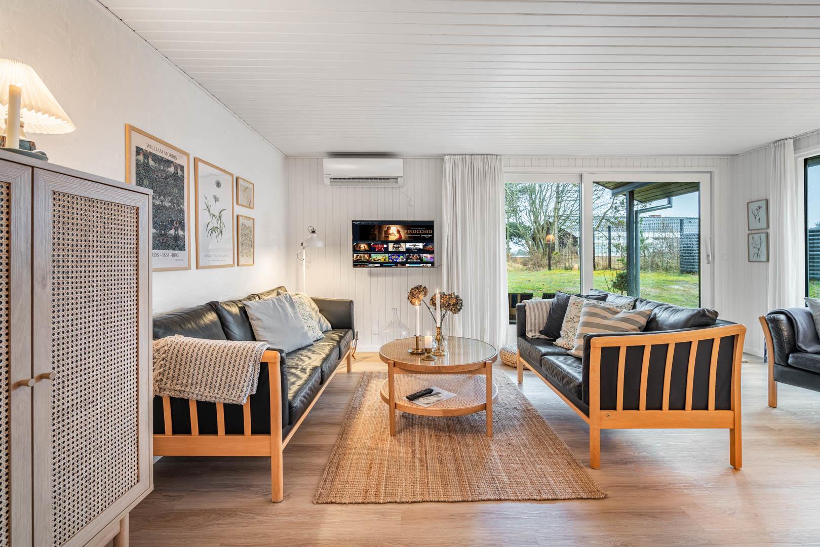 Im Inneren bietet das Ferienhaus einen schönen, offenen Wohnbereich, in dem eine gut ausgestattete Küche in offener Verbindung mit einem geschmackvoll eingerichteten Wohnzimmer steht. Hier finden Sie komfortable und schöne Möbel, einen Kaminofen und eine effiziente Wärmepumpe, die zusammen das perfekte Ambiente für das ganze Jahr schaffen. Der Kaminofen knistert gemütlich an kühleren Abenden und wärmt das Haus auf, sodass Sie sich in einer heimeligen und angenehmen Atmosphäre entspannen können. Das Ferienhaus ist geschmackvoll eingerichtet und darauf ausgelegt, dass Sie sich vom Moment des Betretens wie zu Hause fühlen.