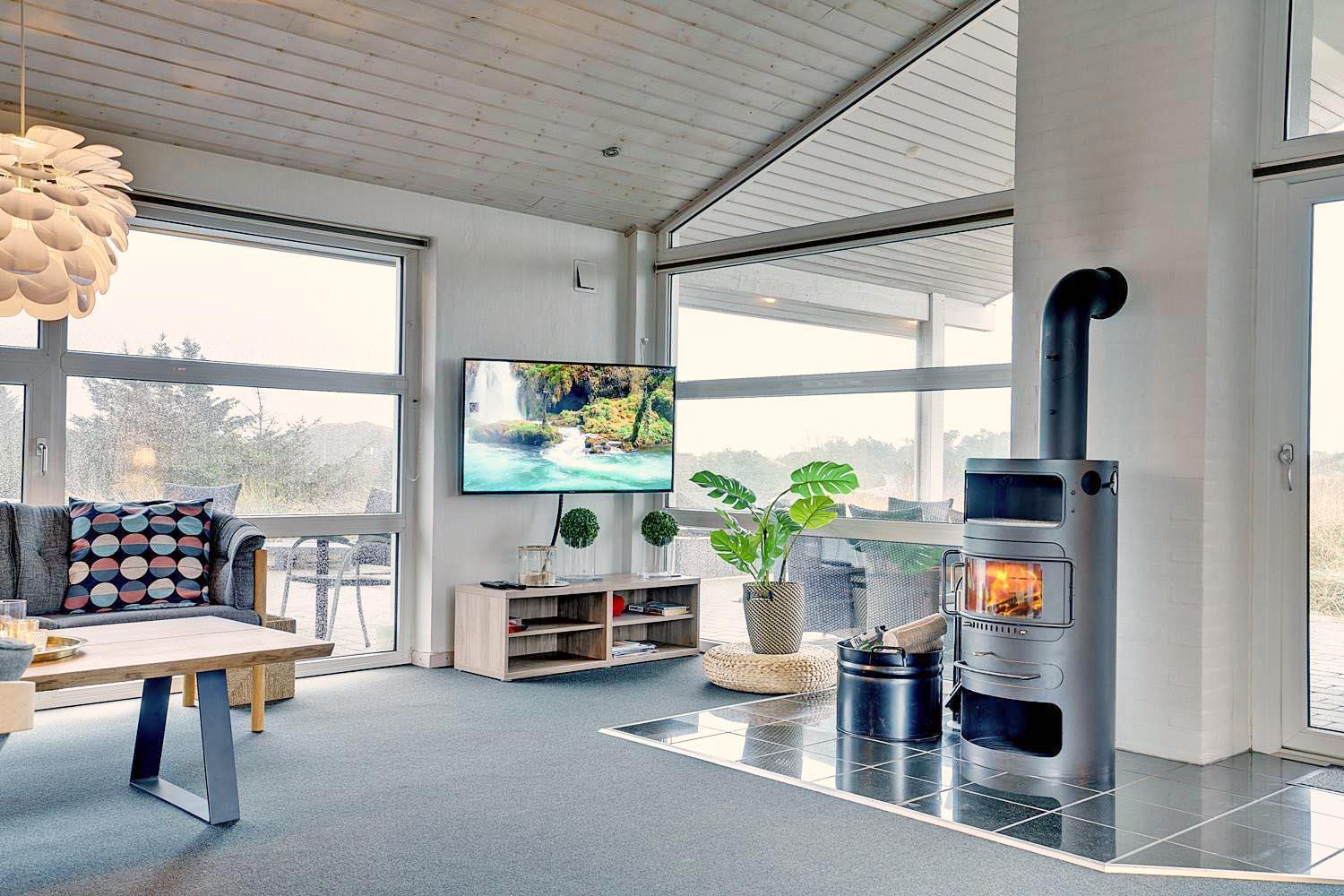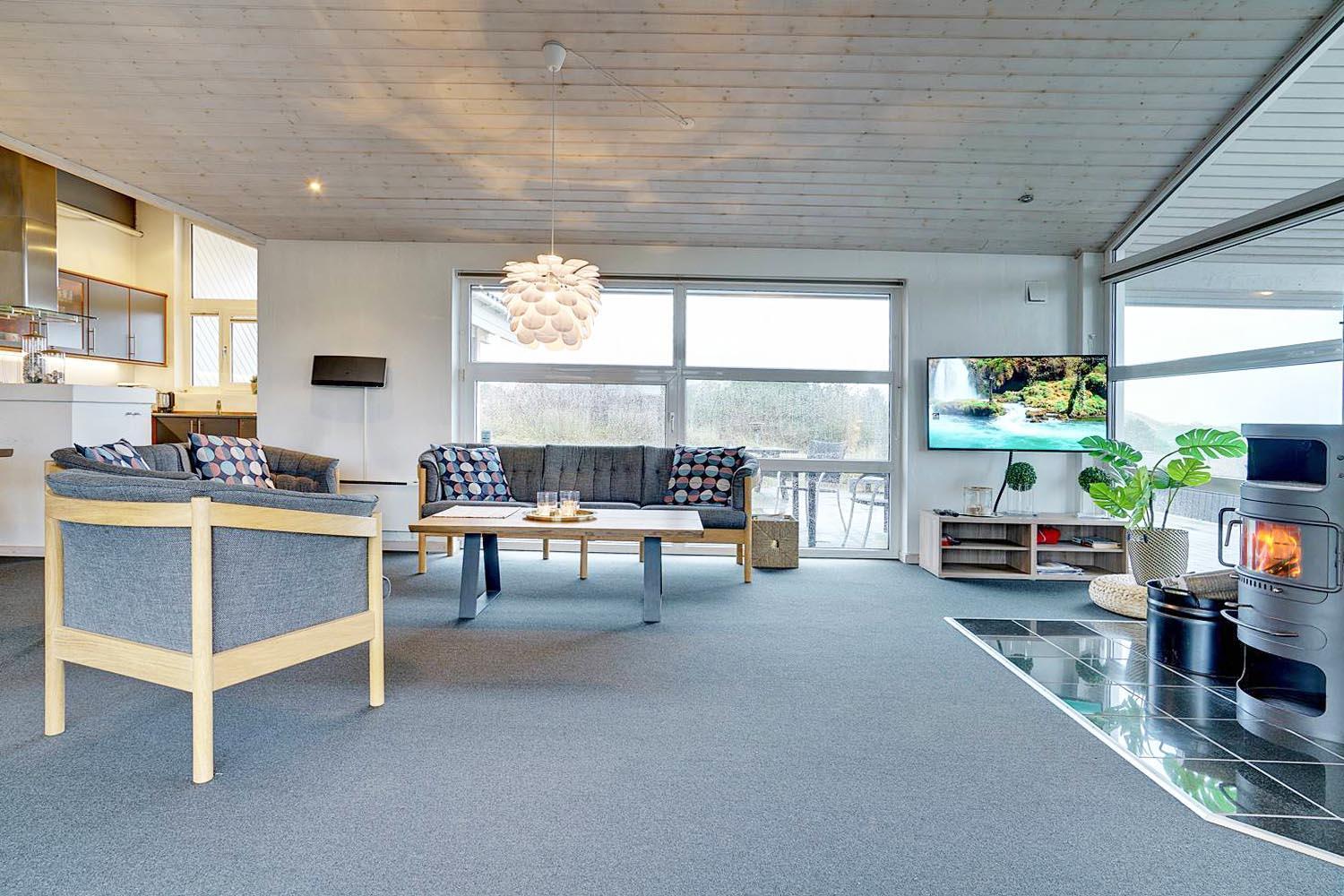 Schöne, moderne Küche in offener Verbindung mit dem großen Wohnzimmer, das mit hochwertigen Möbeln und Holzofen eingerichtet ist. Das Wohnzimmer verfügt über einen großen Fensterbereich, so dass das Wohnzimmer hell und freundlich erscheint.