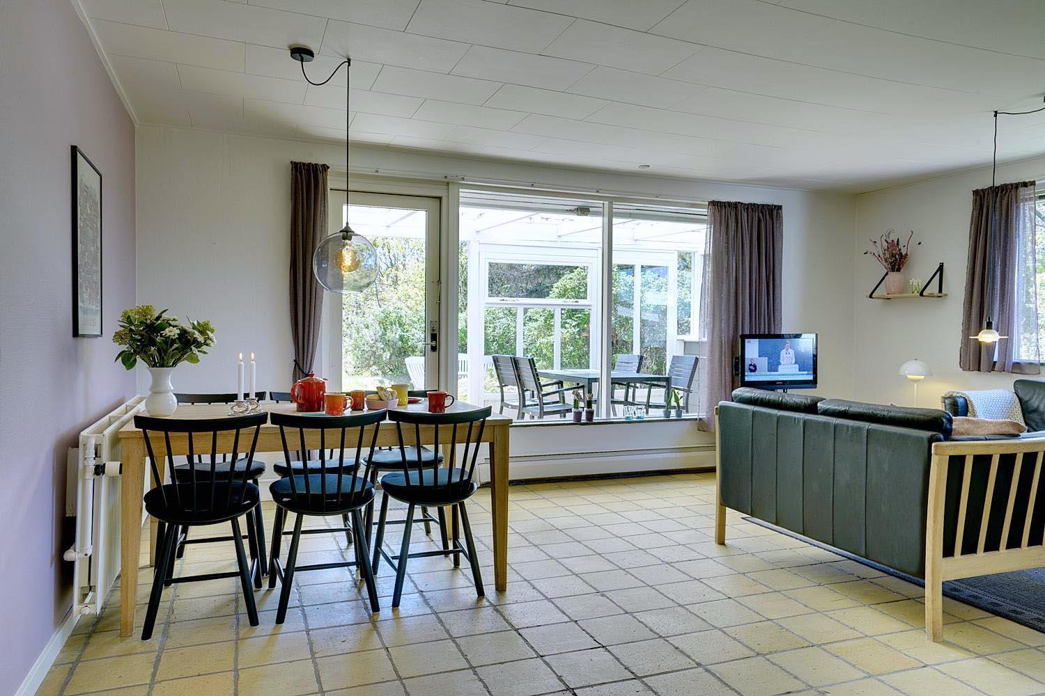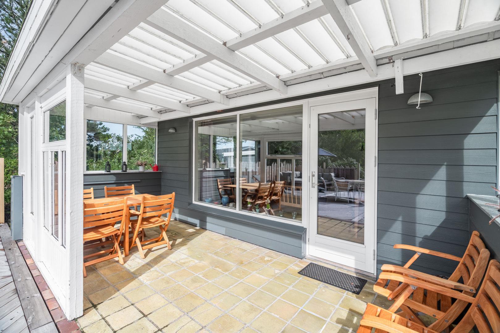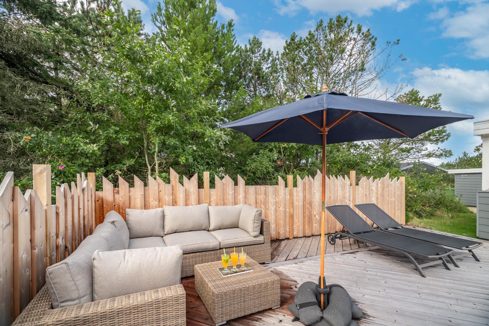 Das gemütliche Wohnzimmer ist geschmackvoll eingerichtet und führt auf eine überdachte Terrasse, wo Sie Ihren Morgenkaffee unabhängig vom Wetter genießen können. Die Terrasse erstreckt sich weiter zu einer charmanten Holzterrasse mit Windschutz, die eine gemütliche Ecke mit Sofa und Liegestühlen bietet. Hier können Sie in der Hängematte entspannen oder zu Vogelgezwitscher in ein gutes Buch eintauchen.