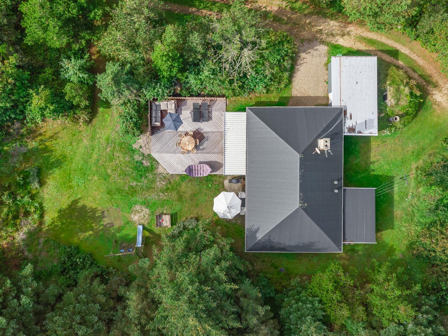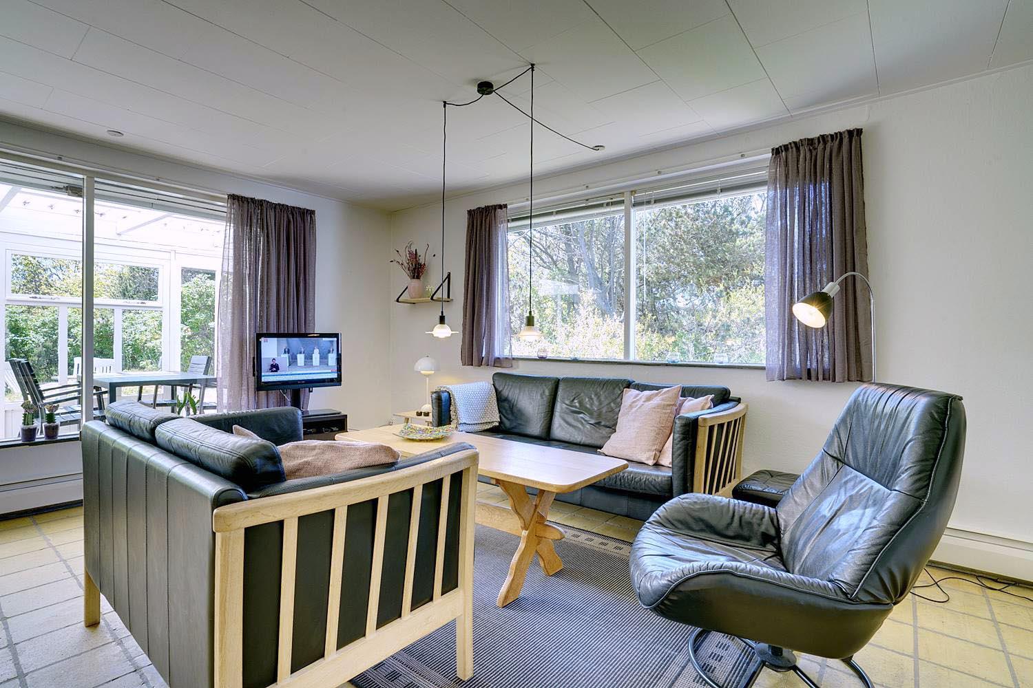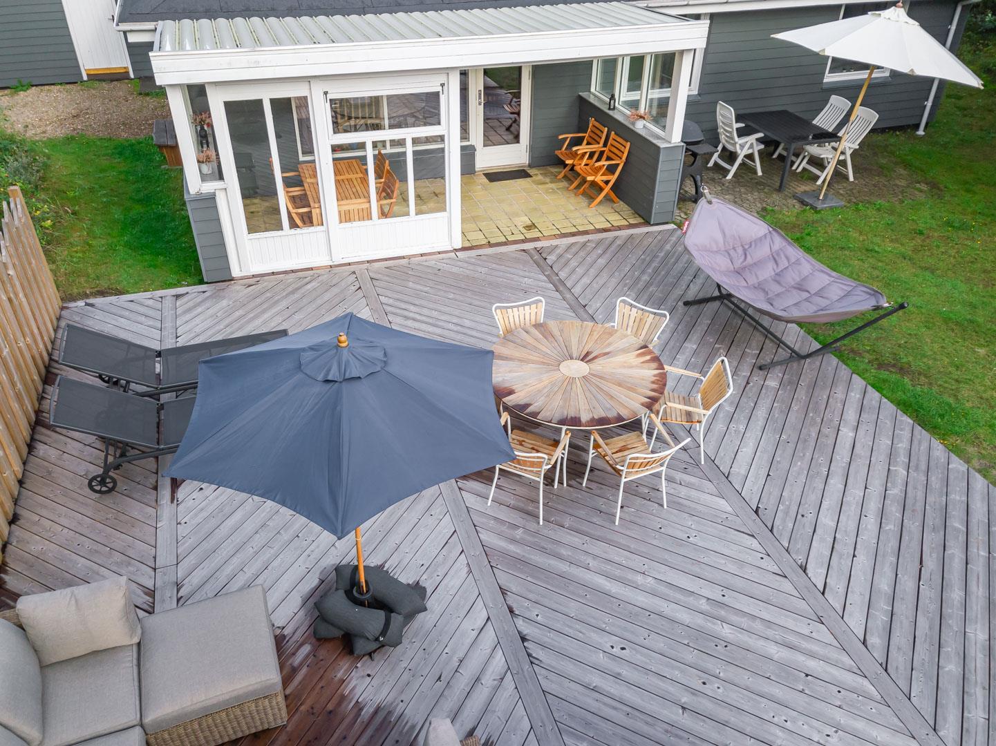 Das gemütliche Wohnzimmer ist geschmackvoll eingerichtet und führt auf eine überdachte Terrasse, wo Sie Ihren Morgenkaffee unabhängig vom Wetter genießen können. Die Terrasse erstreckt sich weiter zu einer charmanten Holzterrasse mit Windschutz, die eine gemütliche Ecke mit Sofa und Liegestühlen bietet. Hier können Sie in der Hängematte entspannen oder zu Vogelgezwitscher in ein gutes Buch eintauchen.