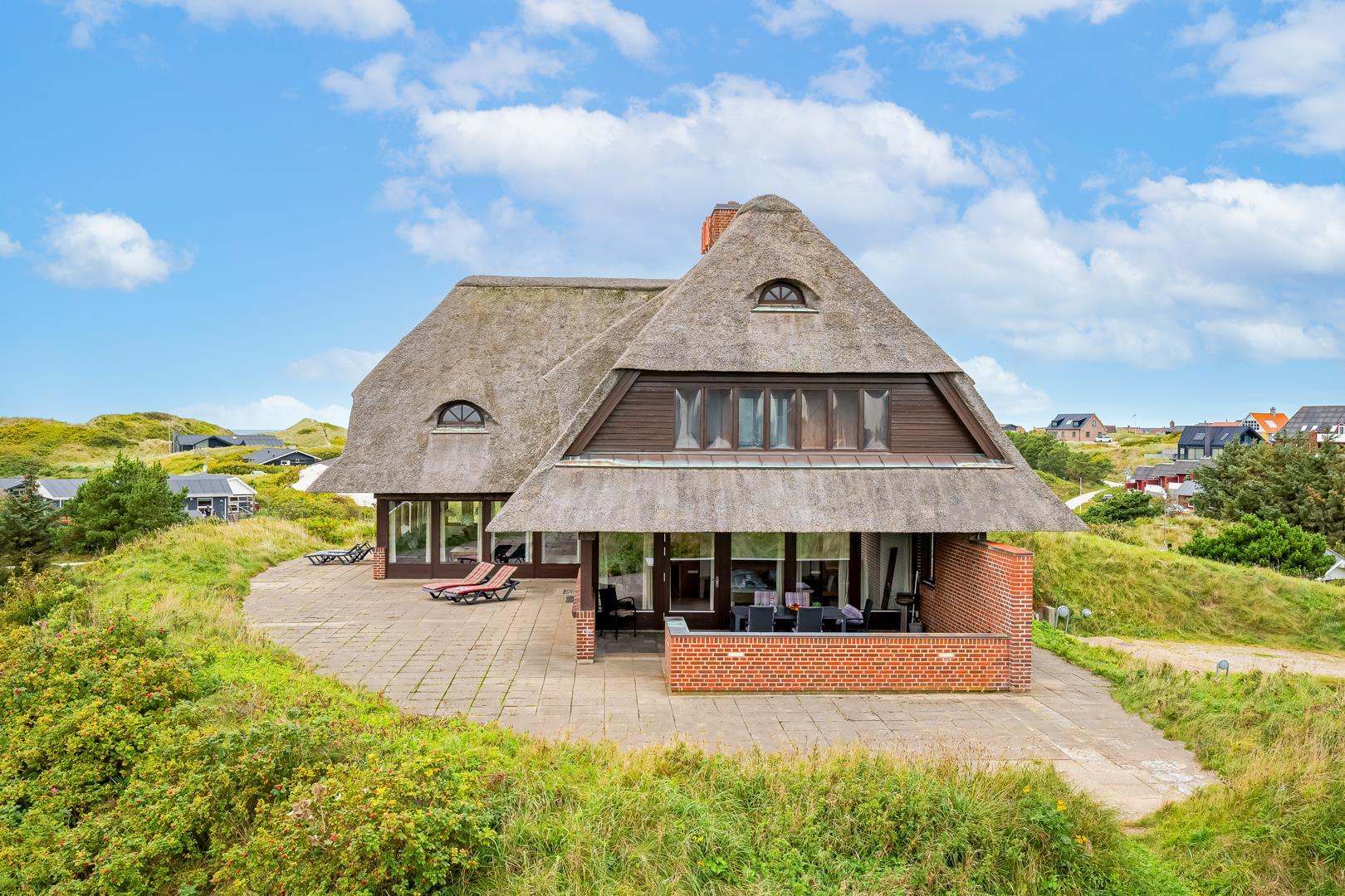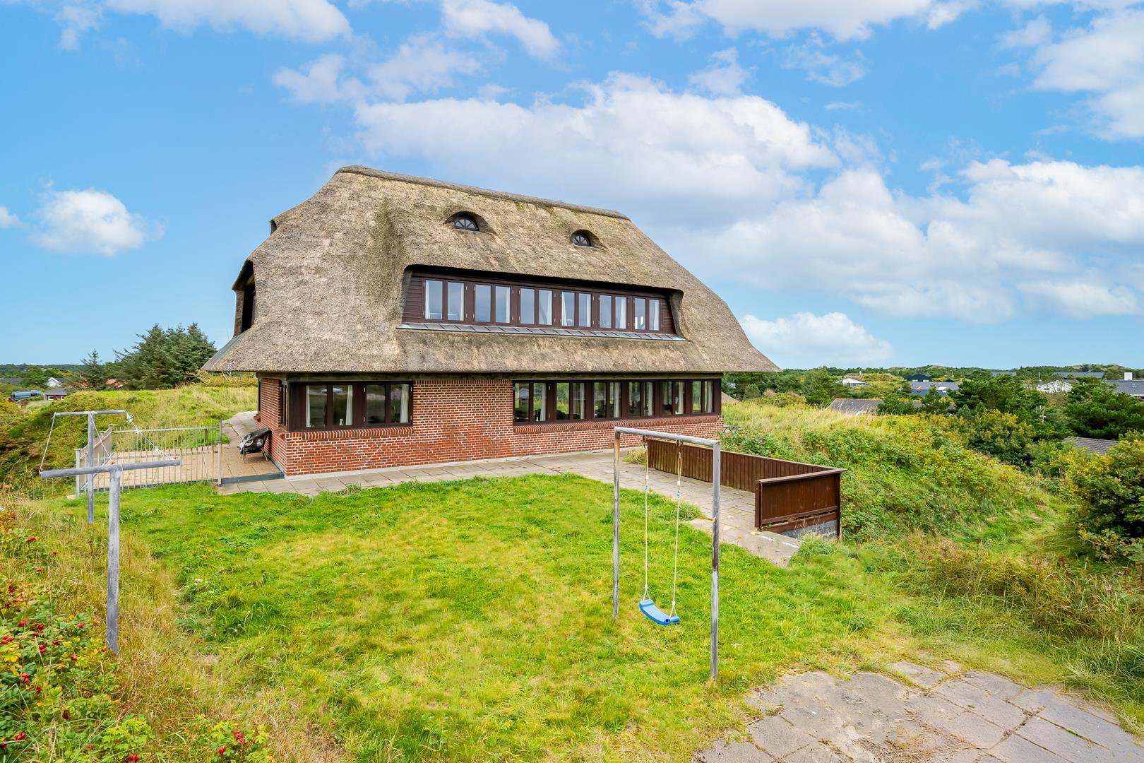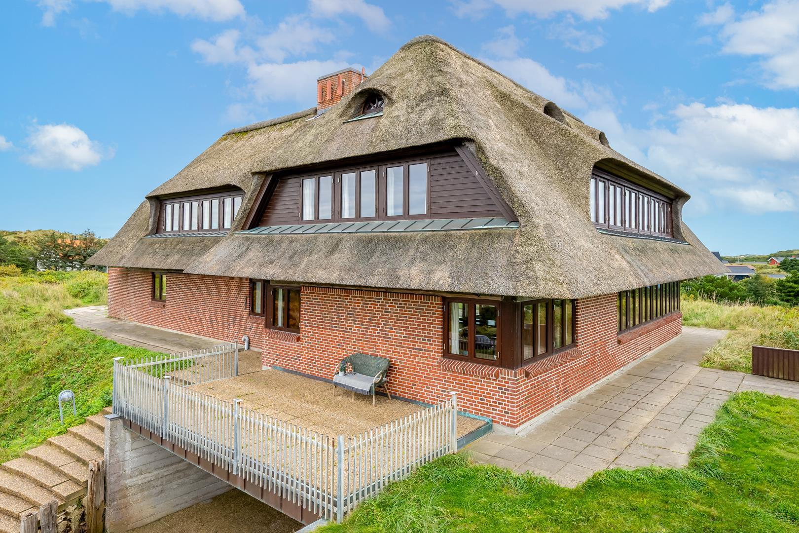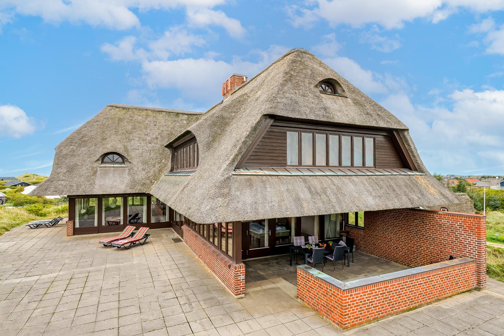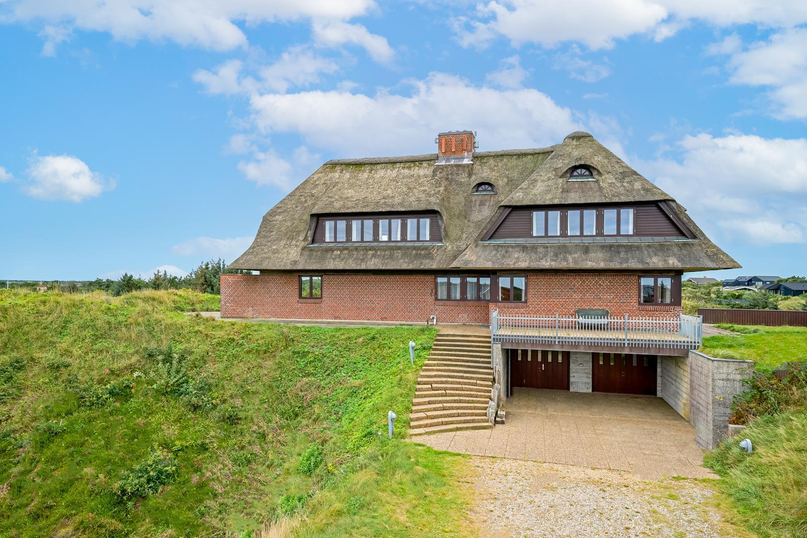 Dieses einzigartige Luxusferienhaus liegt auf einer Düne mit fantastischer Panoramaaussicht über Henne Strand und Blåbjerg Plantage. Im Erdgeschoss gibt es eine große tolle Küche (2017), die in offener Verbindung zur Stube liegt, die mit guten Möbeln ausgestattet ist. Es gibt ein großes Master Schlafzimmer mit eigenem Badezimmer mit Dusche und Ausgang zur schönen überdachten Terrasse. Auf der 1.Etage hat man ein schönes Badezimmer mit Whirlpool und eine große Stube mit Sicht zum Wasser, die eingerichtet ist mit schönen Möbeln, Billardtisch und Tischfußball. Auf der 1.Etage befinden sich auch die restlichen Schlafzimmer, die alle sehr geräumig sind und gute Betten haben. Es gibt mehrere fantastische Terrassen, wo man die Ruhe, Sonne und super Aussicht genießen kann. Ein Ferienhaus, das in der Lage und Ausstattung sehr selten ist.
