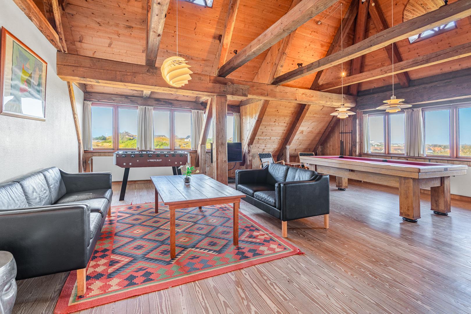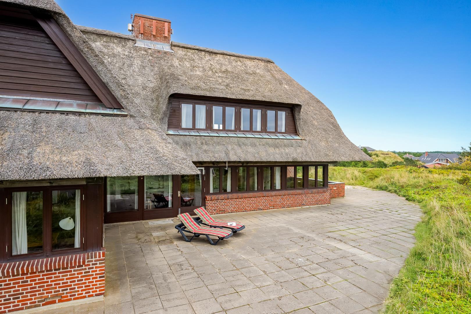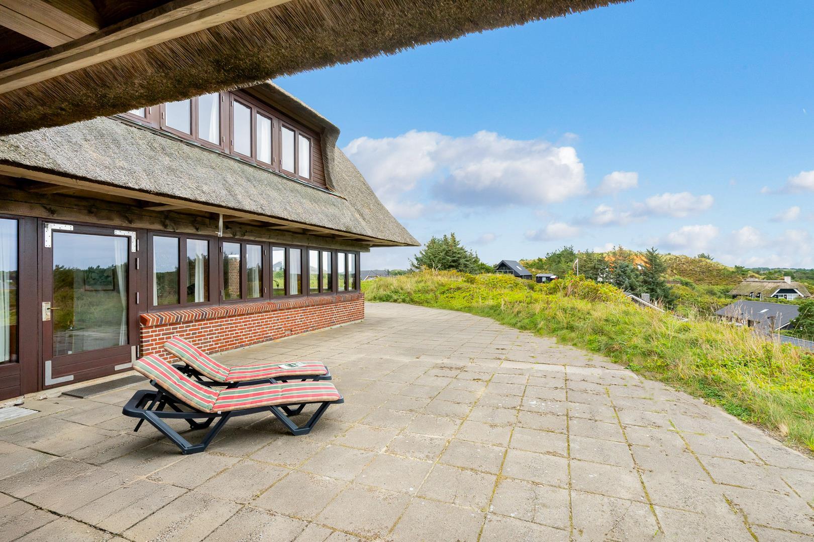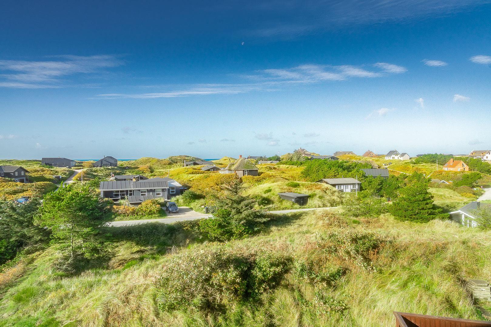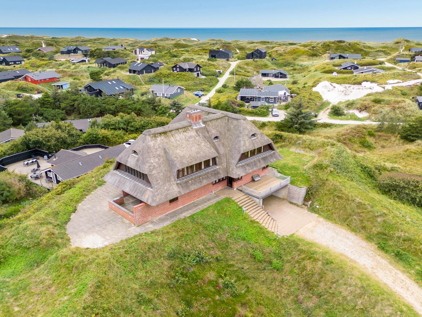 Dieses einzigartige Luxusferienhaus liegt auf einer Düne mit fantastischer Panoramaaussicht über Henne Strand und Blåbjerg Plantage. Im Erdgeschoss gibt es eine große tolle Küche (2017), die in offener Verbindung zur Stube liegt, die mit guten Möbeln ausgestattet ist. Es gibt ein großes Master Schlafzimmer mit eigenem Badezimmer mit Dusche und Ausgang zur schönen überdachten Terrasse. Auf der 1.Etage hat man ein schönes Badezimmer mit Whirlpool und eine große Stube mit Sicht zum Wasser, die eingerichtet ist mit schönen Möbeln, Billardtisch und Tischfußball. Auf der 1.Etage befinden sich auch die restlichen Schlafzimmer, die alle sehr geräumig sind und gute Betten haben. Es gibt mehrere fantastische Terrassen, wo man die Ruhe, Sonne und super Aussicht genießen kann. Ein Ferienhaus, das in der Lage und Ausstattung sehr selten ist.