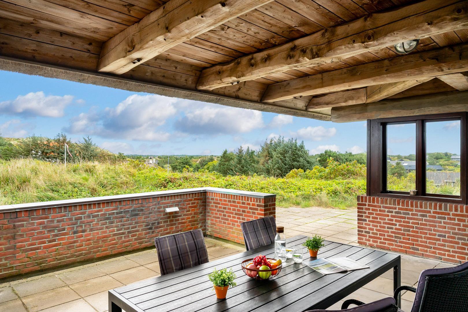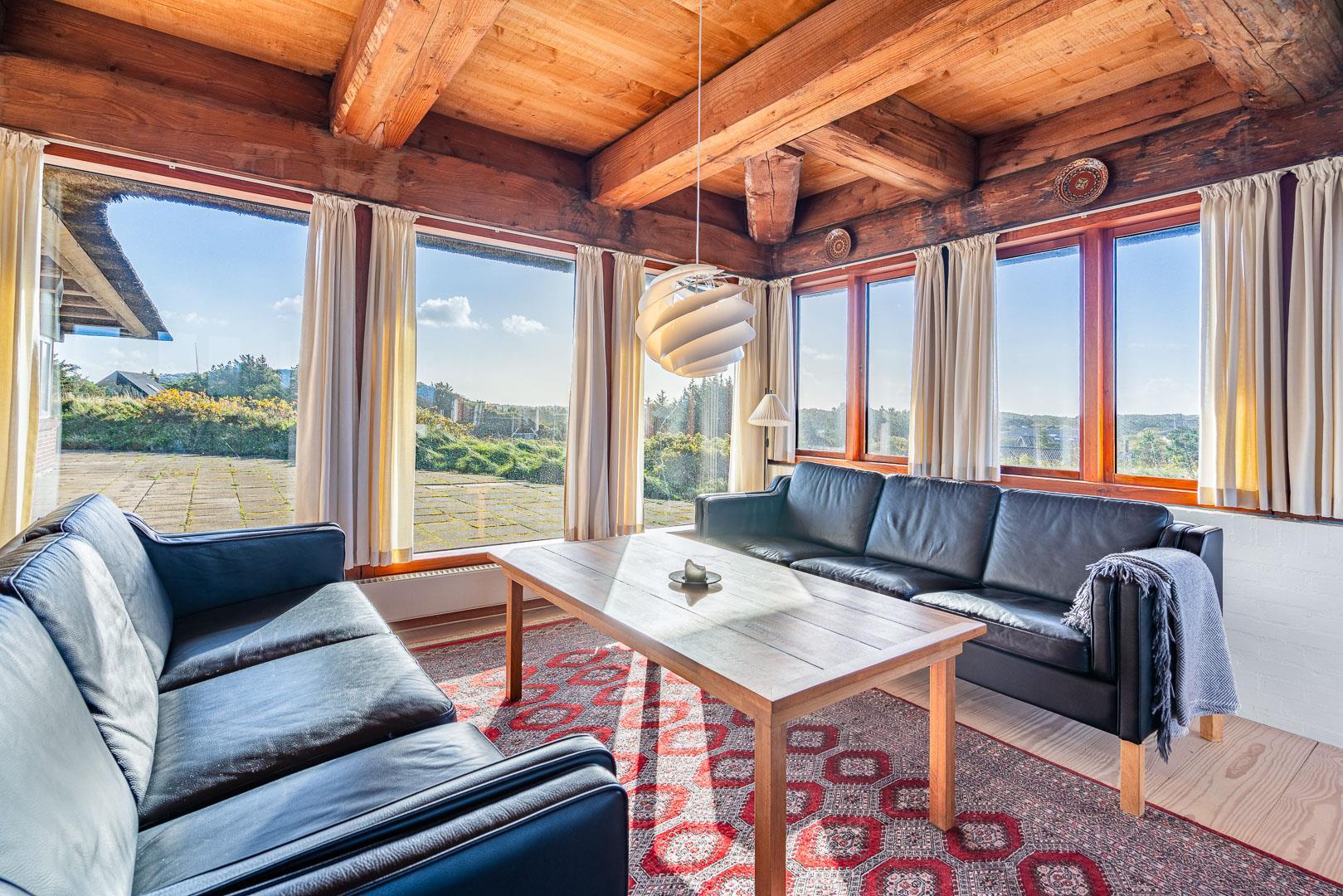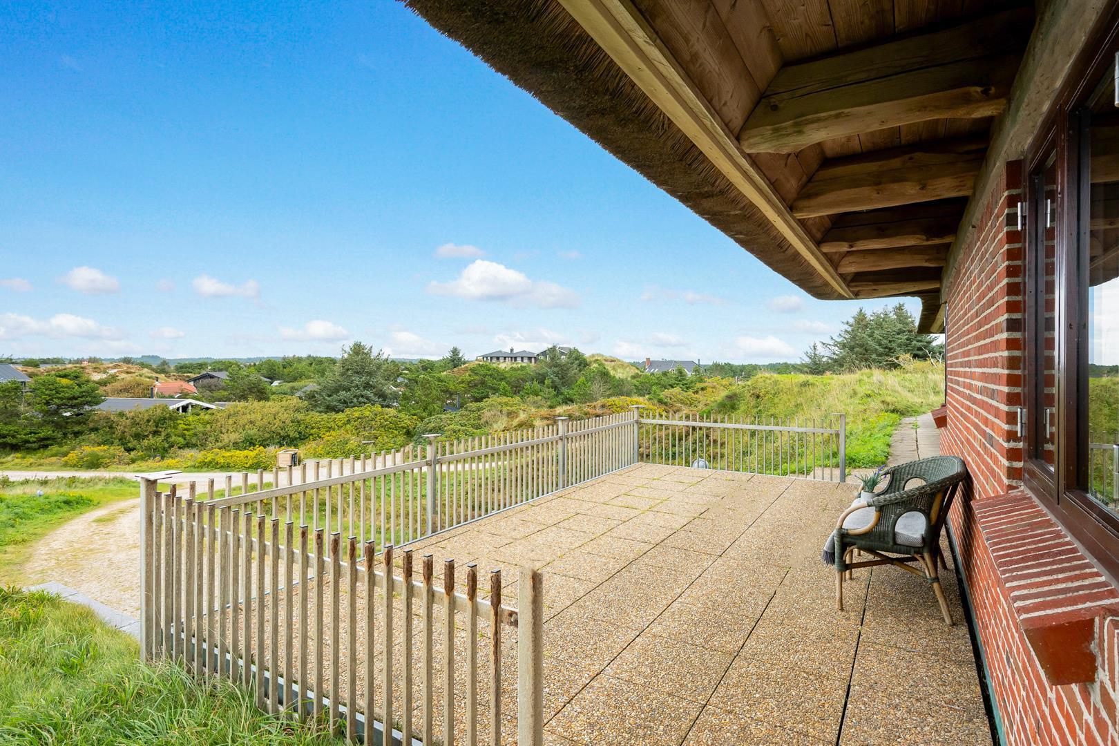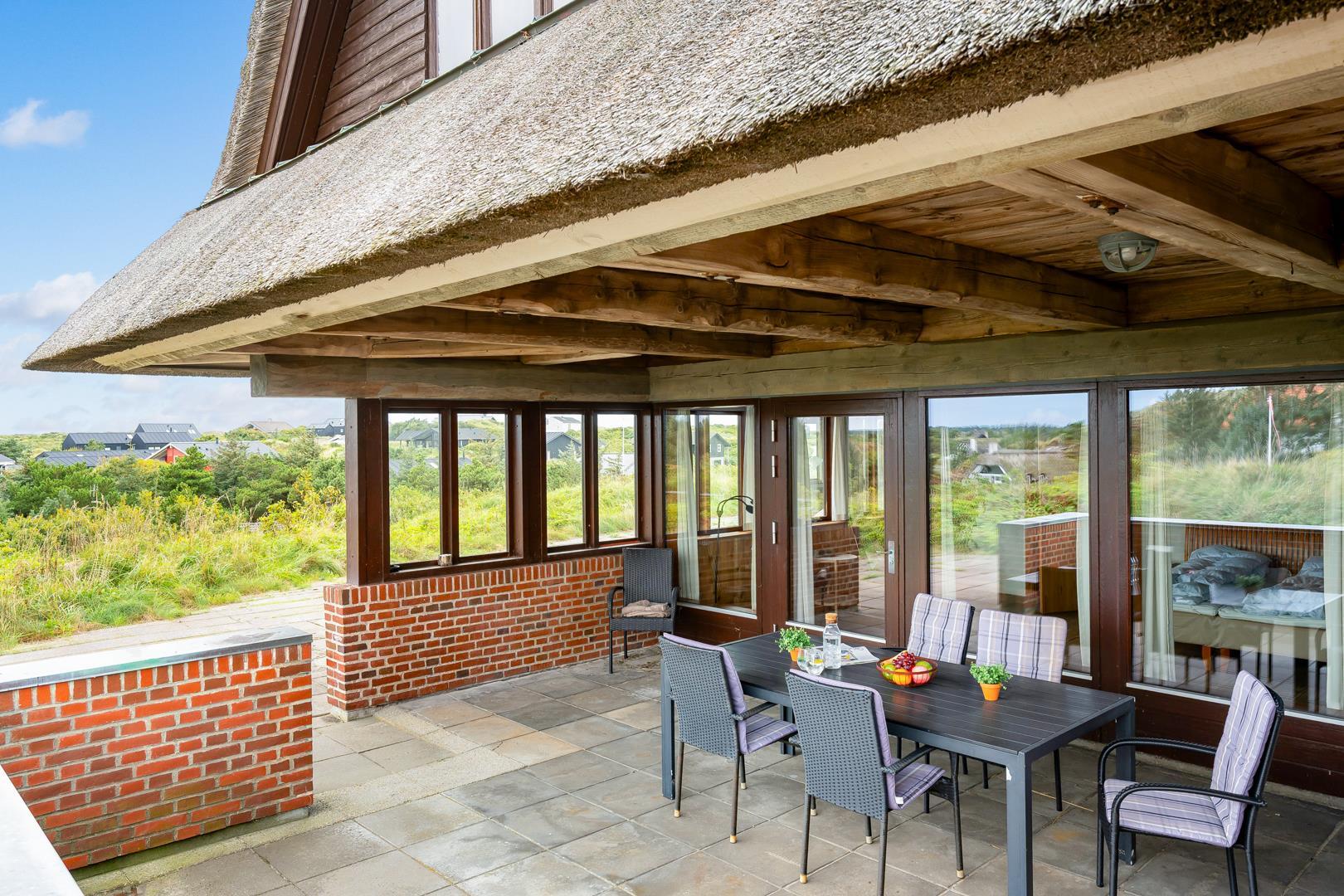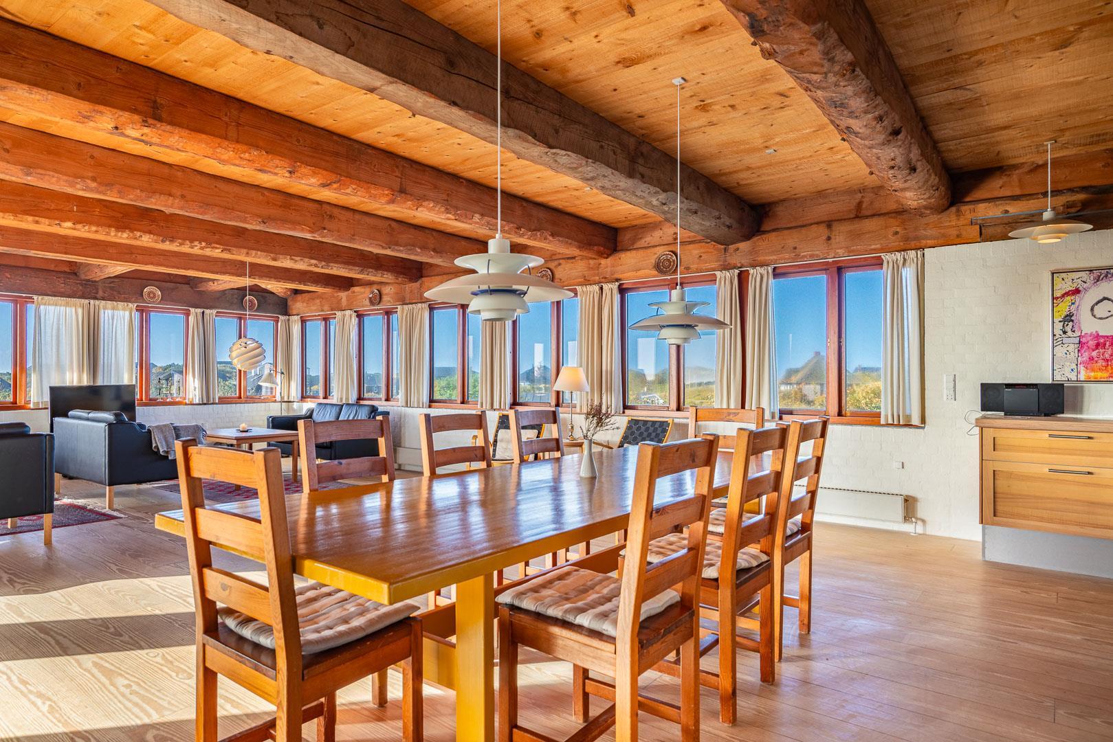 Dieses einzigartige Luxusferienhaus liegt auf einer Düne mit fantastischer Panoramaaussicht über Henne Strand und Blåbjerg Plantage. Im Erdgeschoss gibt es eine große tolle Küche (2017), die in offener Verbindung zur Stube liegt, die mit guten Möbeln ausgestattet ist. Es gibt ein großes Master Schlafzimmer mit eigenem Badezimmer mit Dusche und Ausgang zur schönen überdachten Terrasse. Auf der 1.Etage hat man ein schönes Badezimmer mit Whirlpool und eine große Stube mit Sicht zum Wasser, die eingerichtet ist mit schönen Möbeln, Billardtisch und Tischfußball. Auf der 1.Etage befinden sich auch die restlichen Schlafzimmer, die alle sehr geräumig sind und gute Betten haben. Es gibt mehrere fantastische Terrassen, wo man die Ruhe, Sonne und super Aussicht genießen kann. Ein Ferienhaus, das in der Lage und Ausstattung sehr selten ist.