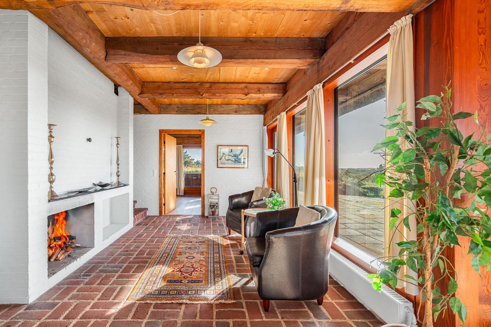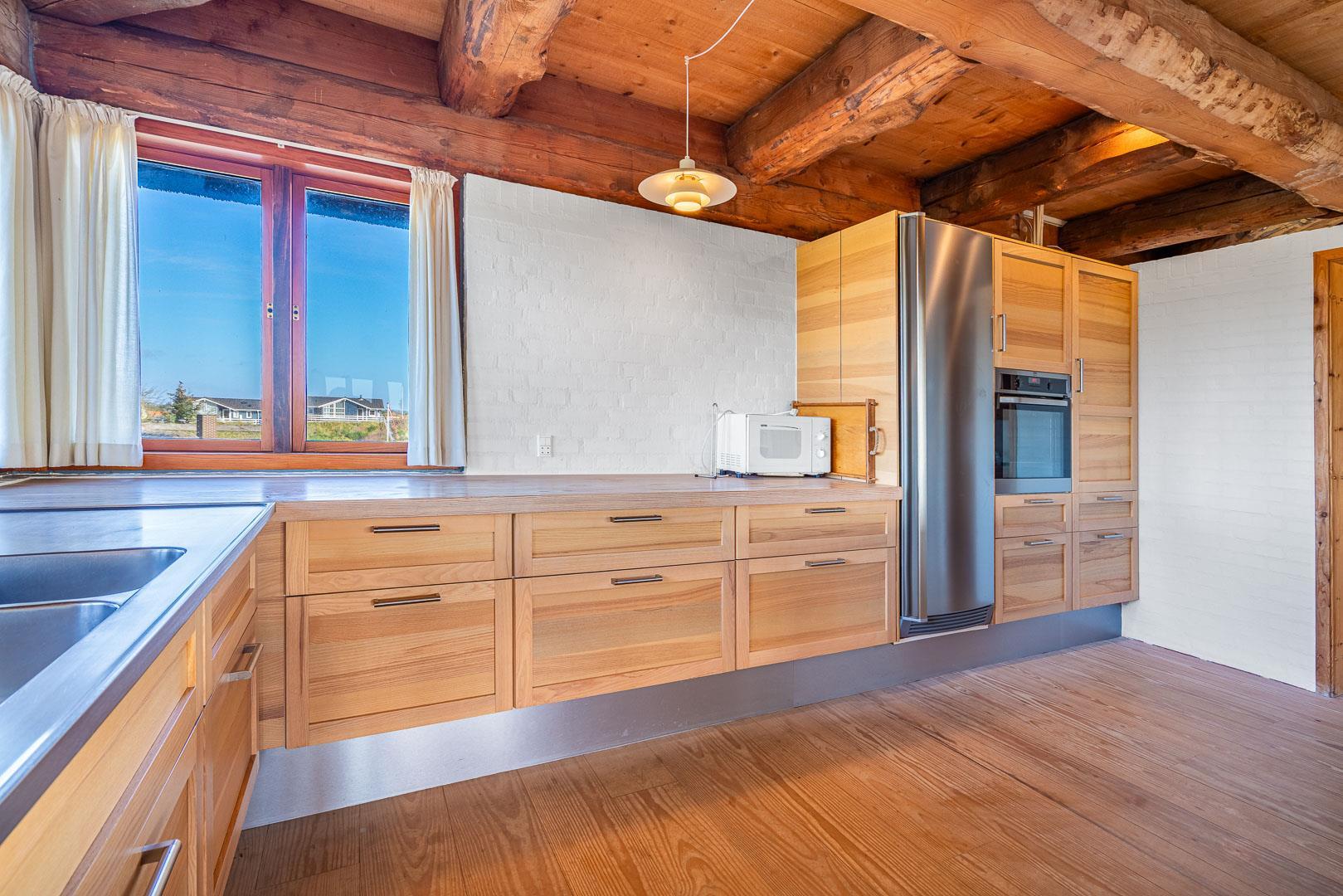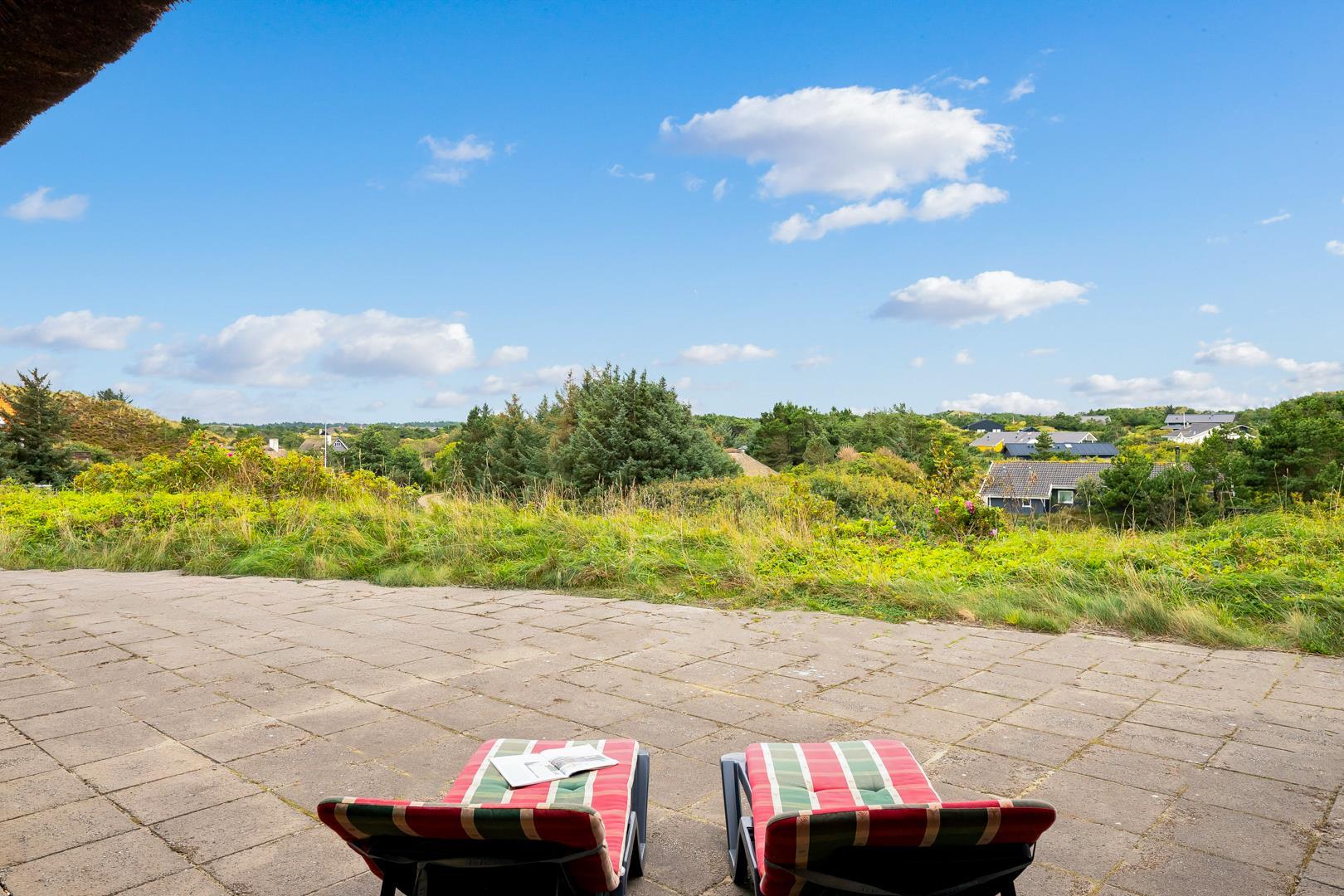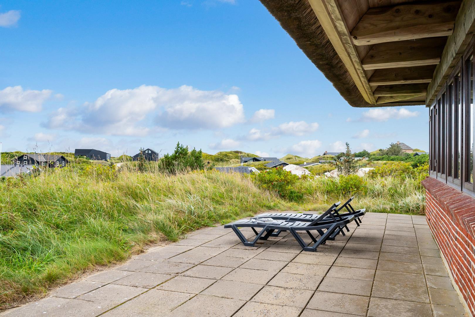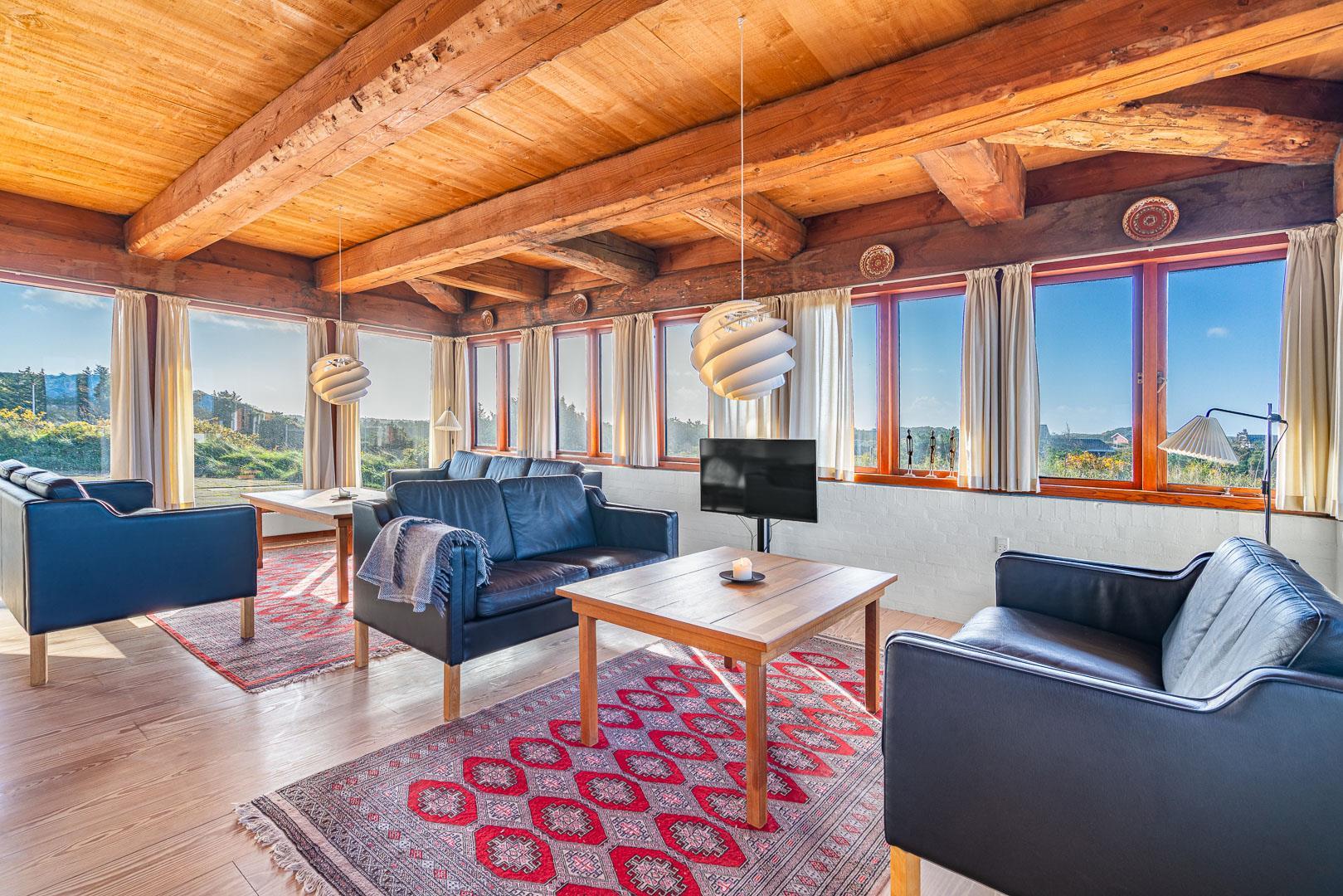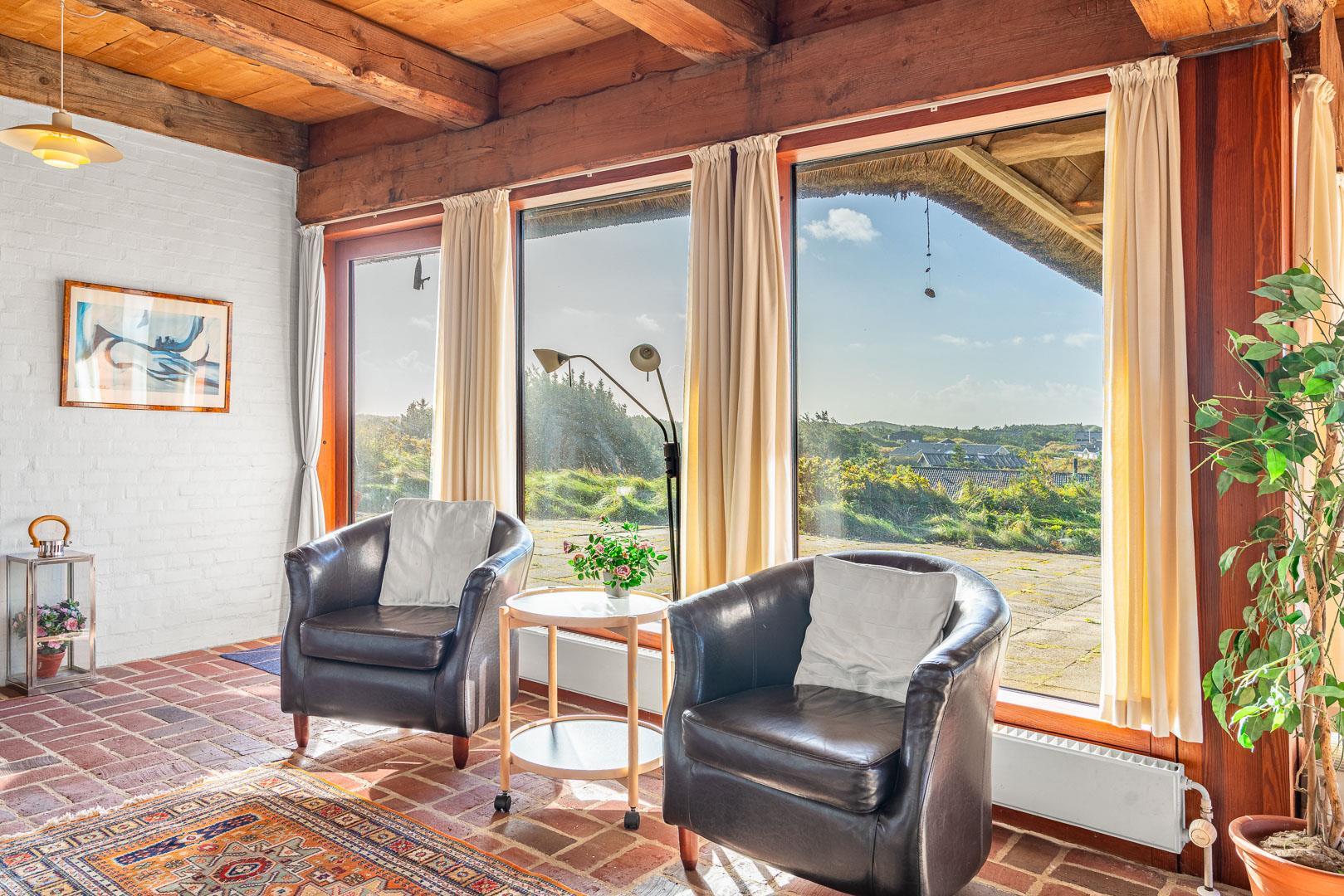 Dieses einzigartige Luxusferienhaus liegt auf einer Düne mit fantastischer Panoramaaussicht über Henne Strand und Blåbjerg Plantage. Im Erdgeschoss gibt es eine große tolle Küche (2017), die in offener Verbindung zur Stube liegt, die mit guten Möbeln ausgestattet ist. Es gibt ein großes Master Schlafzimmer mit eigenem Badezimmer mit Dusche und Ausgang zur schönen überdachten Terrasse. Auf der 1.Etage hat man ein schönes Badezimmer mit Whirlpool und eine große Stube mit Sicht zum Wasser, die eingerichtet ist mit schönen Möbeln, Billardtisch und Tischfußball. Auf der 1.Etage befinden sich auch die restlichen Schlafzimmer, die alle sehr geräumig sind und gute Betten haben. Es gibt mehrere fantastische Terrassen, wo man die Ruhe, Sonne und super Aussicht genießen kann. Ein Ferienhaus, das in der Lage und Ausstattung sehr selten ist.