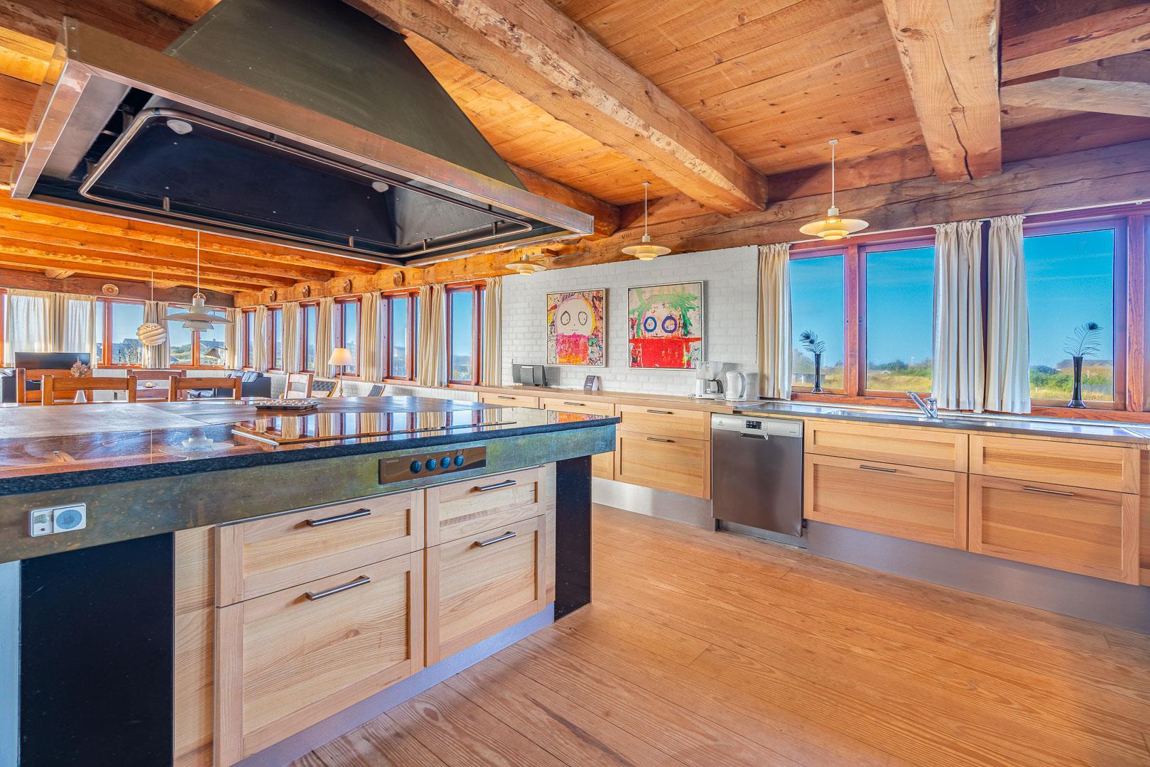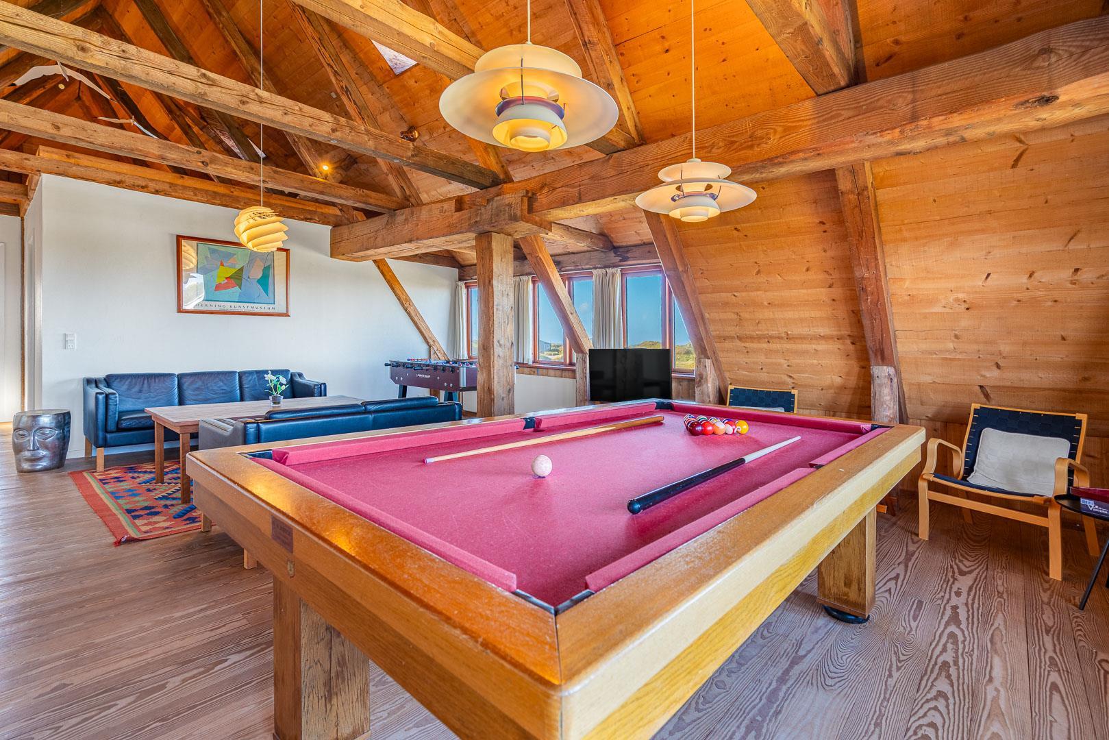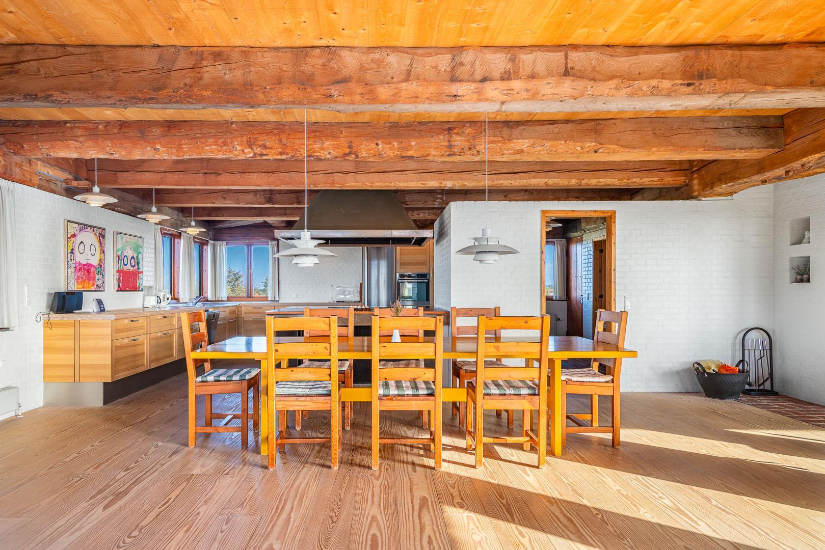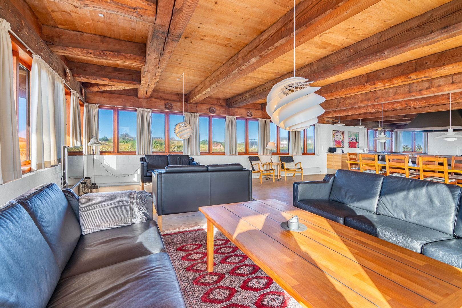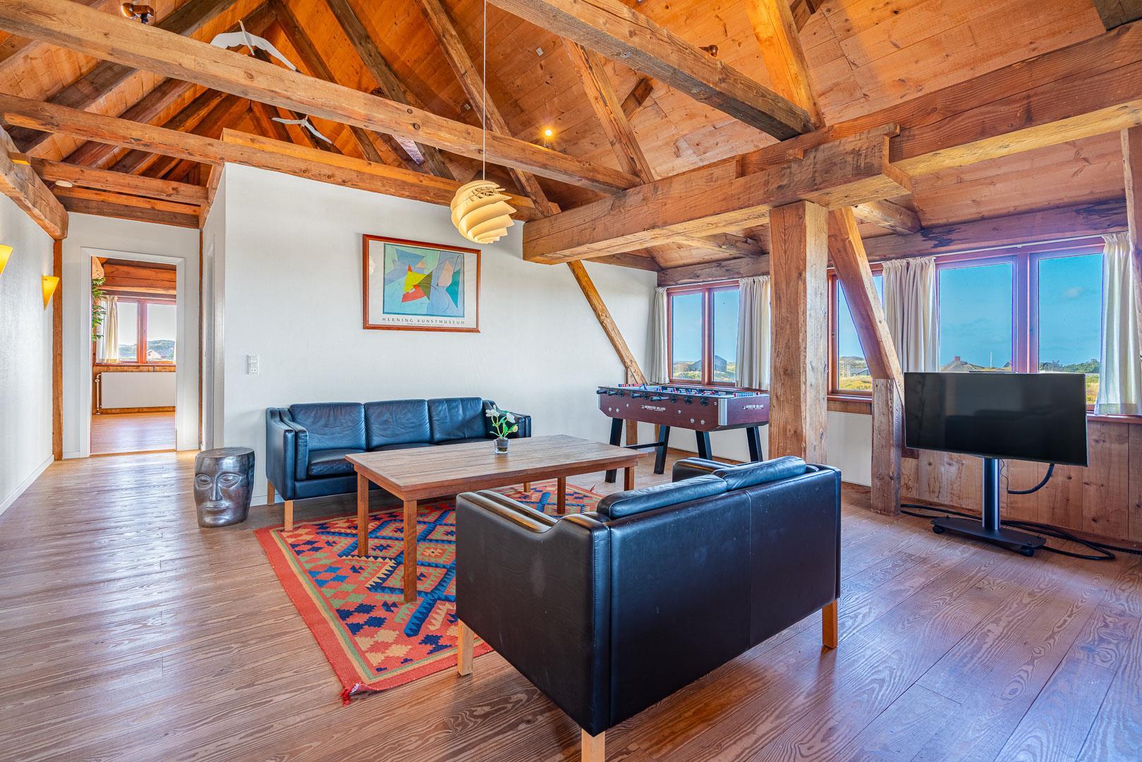 Dieses einzigartige Luxusferienhaus liegt auf einer Düne mit fantastischer Panoramaaussicht über Henne Strand und Blåbjerg Plantage. Im Erdgeschoss gibt es eine große tolle Küche (2017), die in offener Verbindung zur Stube liegt, die mit guten Möbeln ausgestattet ist. Es gibt ein großes Master Schlafzimmer mit eigenem Badezimmer mit Dusche und Ausgang zur schönen überdachten Terrasse. Auf der 1.Etage hat man ein schönes Badezimmer mit Whirlpool und eine große Stube mit Sicht zum Wasser, die eingerichtet ist mit schönen Möbeln, Billardtisch und Tischfußball. Auf der 1.Etage befinden sich auch die restlichen Schlafzimmer, die alle sehr geräumig sind und gute Betten haben. Es gibt mehrere fantastische Terrassen, wo man die Ruhe, Sonne und super Aussicht genießen kann. Ein Ferienhaus, das in der Lage und Ausstattung sehr selten ist.
