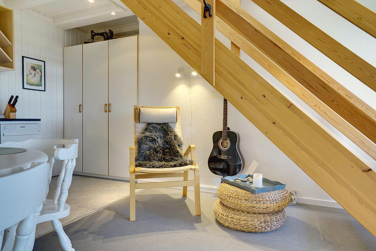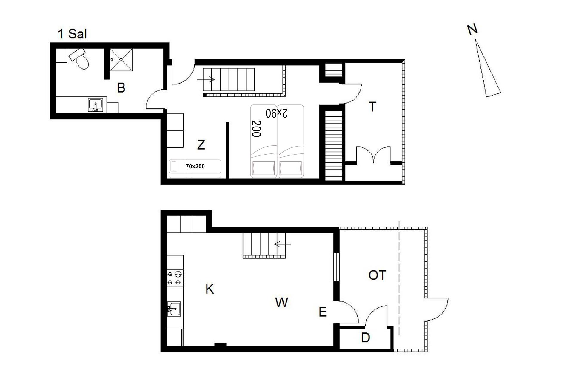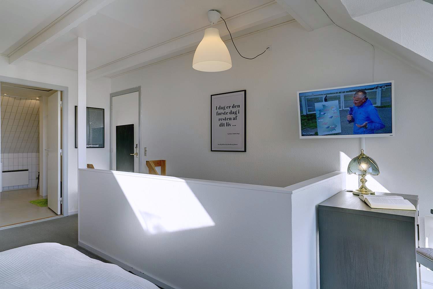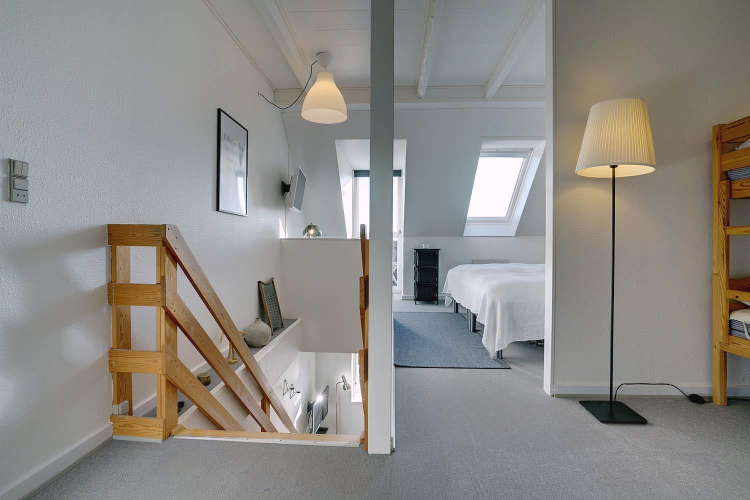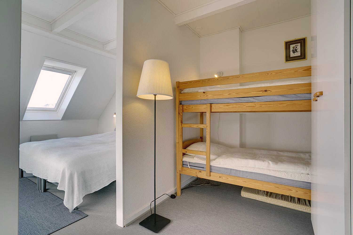 Im Obergeschoss befinden sich sowohl das Schlafzimmer als auch das Kinderzimmer, die offen miteinander verbunden sind – ideal für Familien mit kleineren Kindern. Ebenfalls auf dieser Etage befindet sich das Badezimmer sowie ein zusätzliches TV-Gerät, sodass die ganze Familie Ruhe und Unterhaltung finden kann.