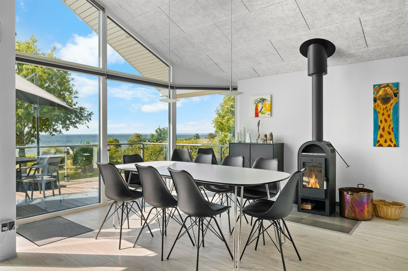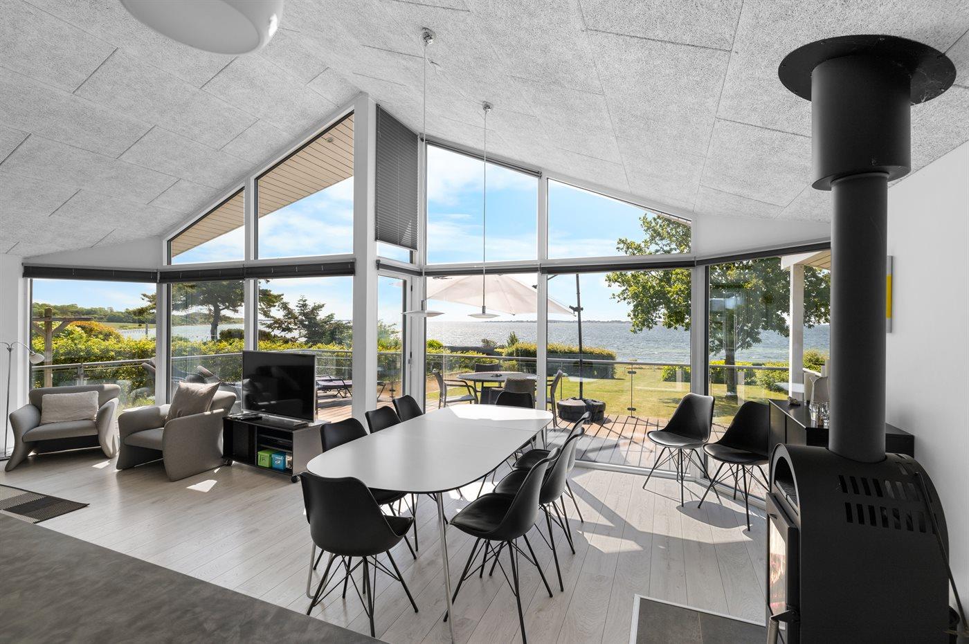 Vom Haus und von der schönen Terrasse davor hast du einen Panoramablick über das Wasser. Das Haus ist modern und hell eingerichtet. Im Garten findest du unter anderem eine Boulebahn und eine Feuerstelle – von hier aus kannst du direkt zum Strand gehen, wo in der Sommersaison ein gemeinsamer Badesteg aufgebaut ist.