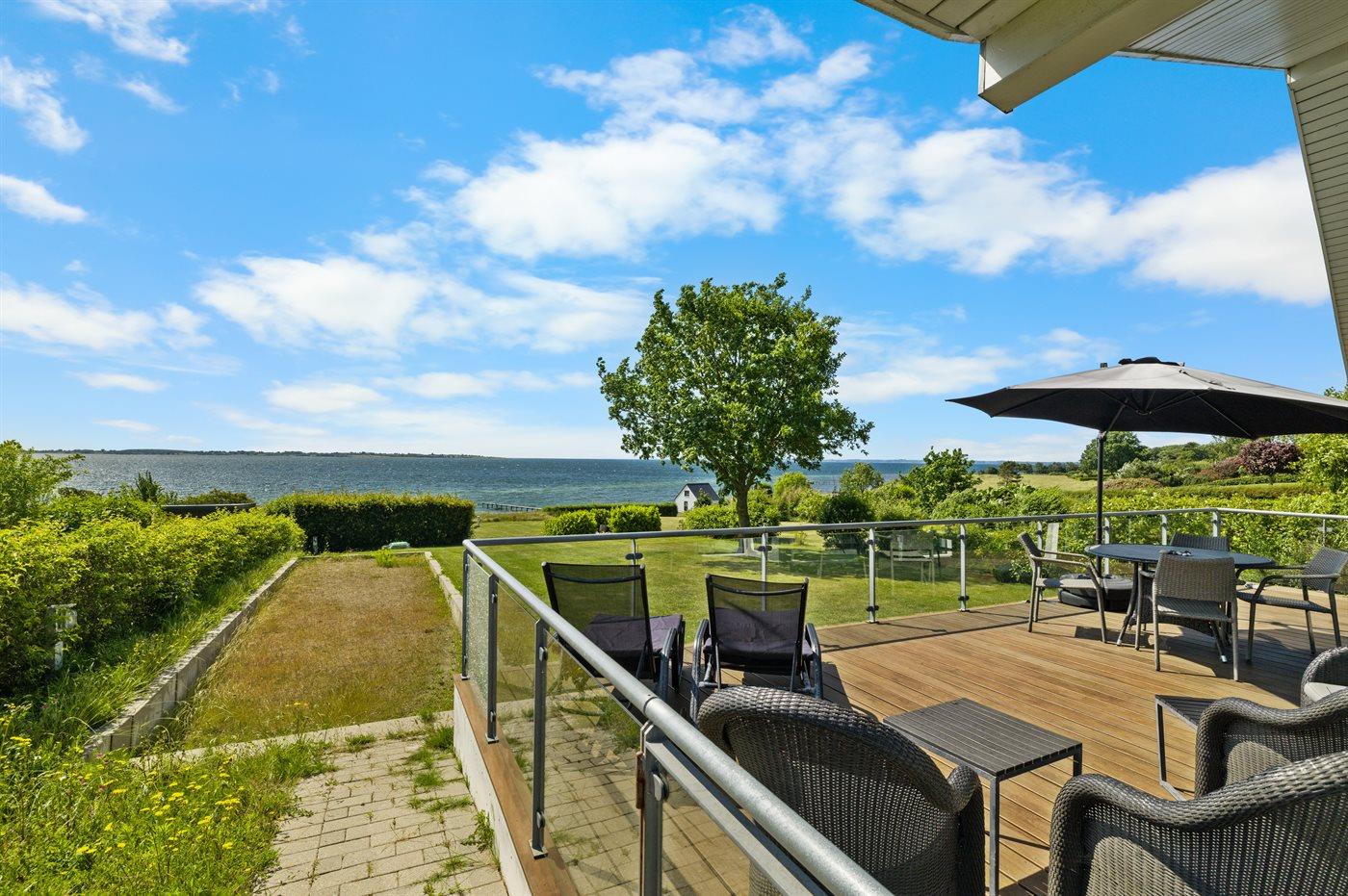 Modernes Ferienhaus mit Meerblick, Sauna und Whirlpool in erster Reihe zum Strand in Faaborg, Dänemark.