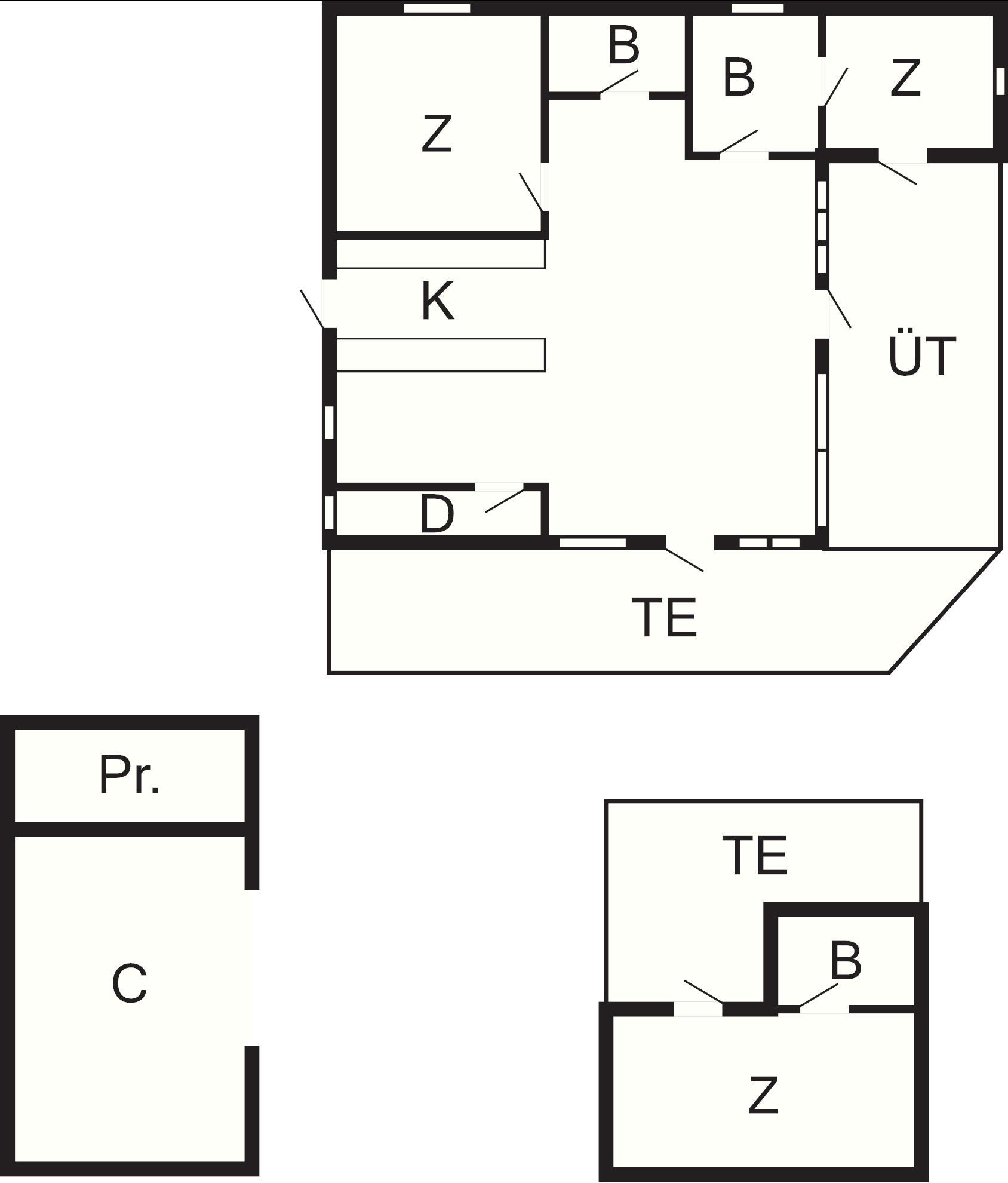 Das Ferienhaus verfügt über ein großes Schlafzimmer mit Doppelbett, ein kleineres Zimmer mit zwei Kojen im Etagenbett sowie über einen separaten Annex mit drei weiteren Schlafplätzen, eigenem WC, Waschmaschine und Trockner. Im Haupthaus gibt es ein zusätzliches WC und ein großes Badezimmer mit Dusche.