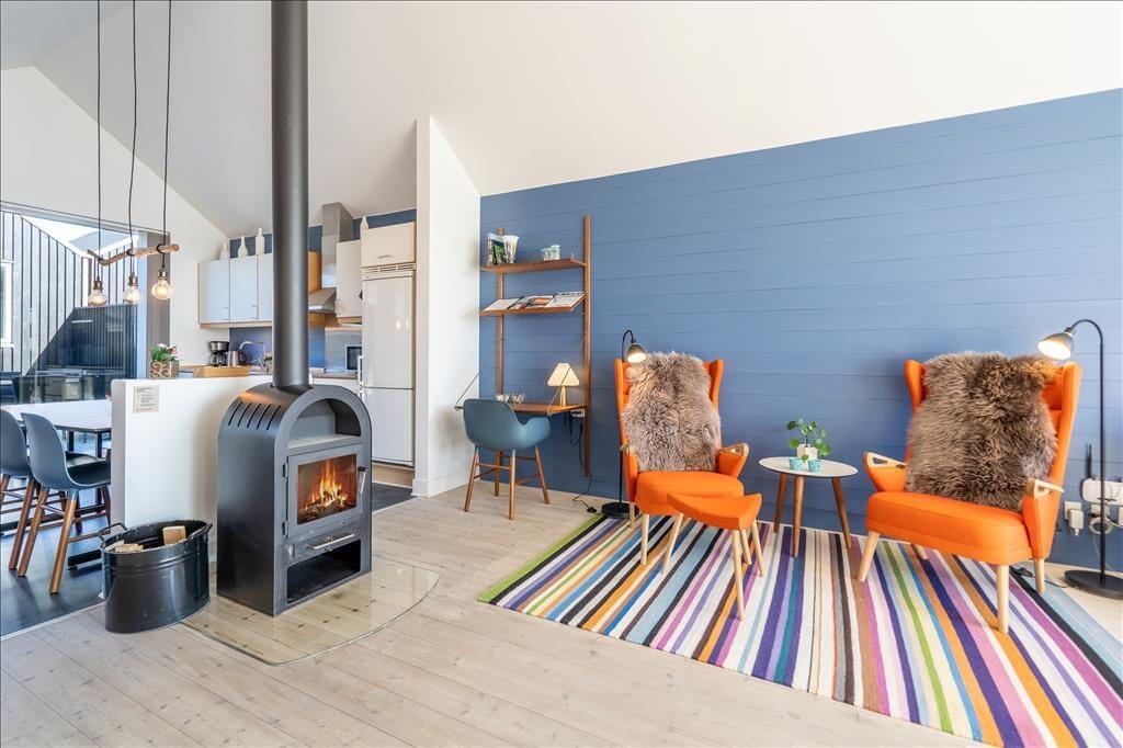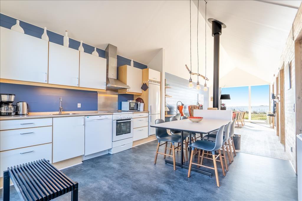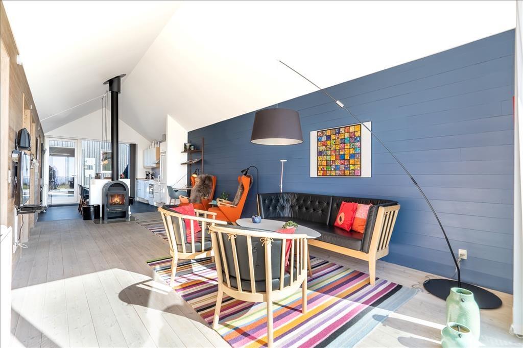 Das komfortabel eingerichtete Hausinnere besticht aufgrund der hohen Decken und der großen Fensterfronten mit einer hellen, luftigen Wohnatmosphäre. Die beiden Schlafzimmer beinhalten jeweils zwei Schlafplätze. Von einem der Zimmer können Sie direkt hinaus in den Innenhof treten. Das andere Zimmer begeistert mit Fjordblick und einem eigenen Ausgang auf die Terrasse. Ihnen stehen zwei Badezimmer zur Verfügung. Während eines mit einer Sauna und einer Duschnische überzeugt, verwöhnt das andere mit einem guten Whirlpool. Die gut ausgestattete Küche und der Wohnraum bilden zusammen einen großen, offenen Aufenthaltsraum. Neben einem durchströmenden Tageslichteinfall genießen Sie am Esstisch und auf den Polstermöbeln einen reizvollen Blick auf den Fjord. Für angenehme Wärme und ein Maximum an Gemütlichkeit sorgt der Kaminofen. Ein Fernseher und Wi-Fi laden zu entspannten Abenden ein.
