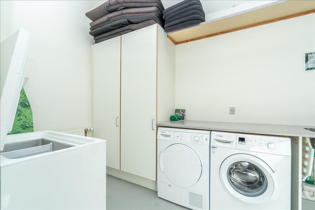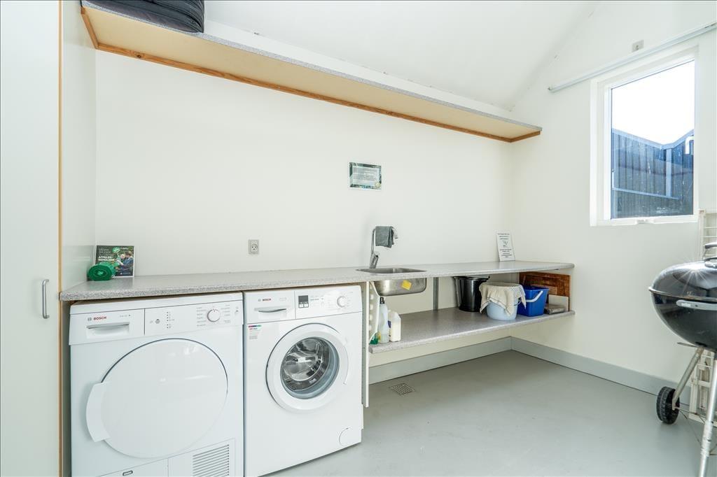 Neben der Garage steht Ihnen ein Hauswirtschaftsraum zur Verfügung, der eine Waschmaschine, einen Wäschetrockner, eine Gefriermöglichkeit und eine Arbeitsfläche mit Spüle beinhaltet. Spüle und Arbeitsfläche können Hobbyangler gut zum Reinigen Ihres täglichen Fangs nutzen. Den Fisch grillen Sie im Anschluss im komplett geschlossenen Innenhof, der gut abgeschirmt und nicht von außen einsehbar ist. Die Südterrasse lädt zu schönen Nachmittagen auf den Sonnenliegen ein. Während Sie sich hier bestens erholen, genießen Sie einen prachtvollen Ausblick auf das ruhige Wasser des Fjords und auf das maritime Leben im Hafen.