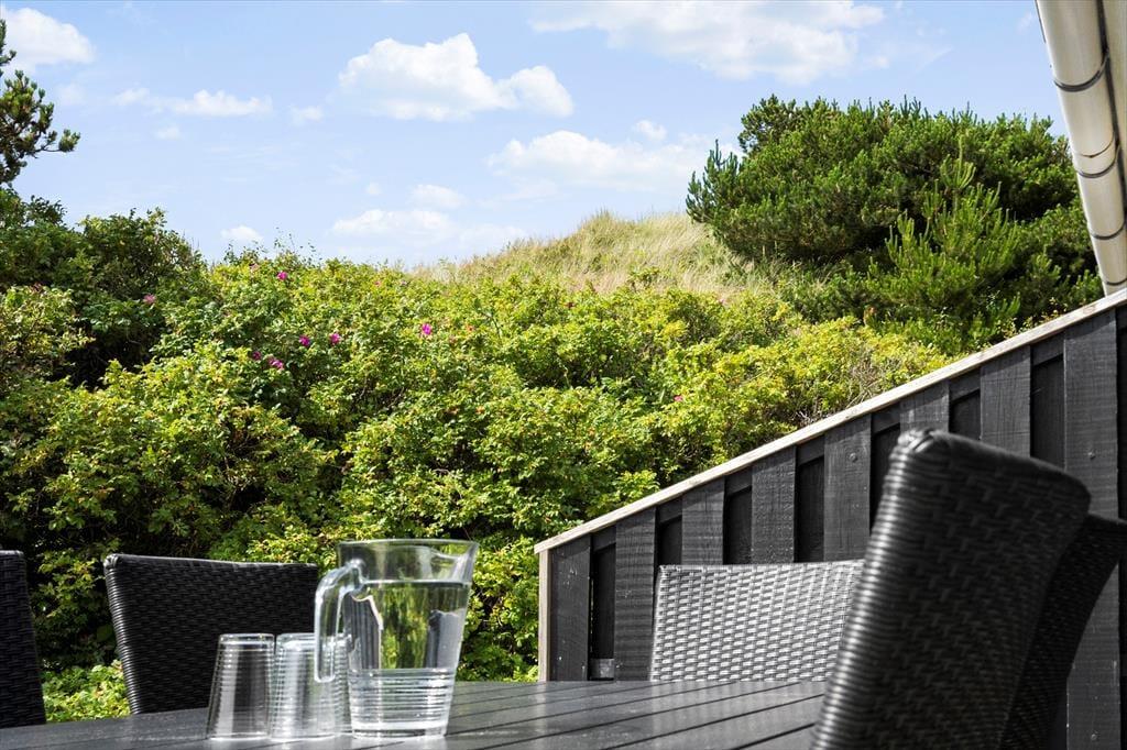 Überdachte und offene Terrassen rund um das Haus ermöglichen Ihnen, die Sommertage von morgens bis abends im Freien zu genießen. Ringsum erstreckt sich ein Naturgrundstück, das durch eine Düne und üppigen Bewuchs gut vor Wind abschirmt. Ein Parkplatz ist vorhanden.