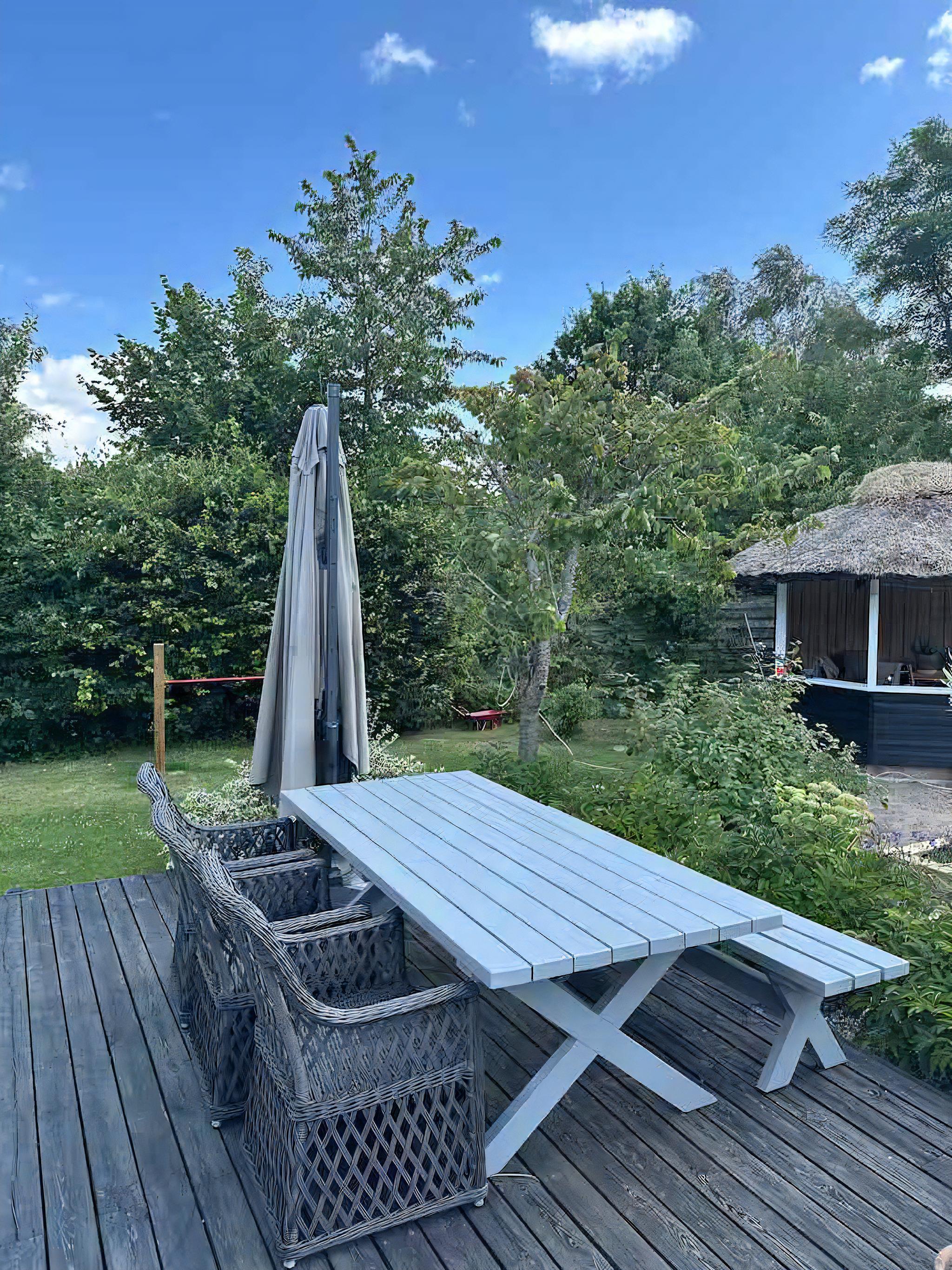 Das 120 m² große Ferienhaus liegt zwischen dem Roskilde Fjord und dem Isefjord und bietet eine ruhige Grundlage in der Nähe von Wasser und Natur. Acht Gäste finden in vier Schlafzimmern bequem Platz. Im Erdgeschoss befindet sich ein heller Wohn- und Küchenbereich. Das Wohnzimmer eignet sich für gemeinsame Mahlzeiten. Im Obergeschoss lädt ein separater TV-Raum zum Entspannen ein. Die drei Schlafzimmer im Erdgeschoss verfügen über Doppelbetten. Ein vierter Schlafbereich liegt im Obergeschoss. Die Einrichtung ist schlicht und funktional, ideal für Familien und Gruppen. Das Badezimmer ist geräumig, und eine Außendusche mit Warmwasser sorgt für echtes Urlaubsgefühl. Die Außendusche ist im Winter geschlossen. Der Pool ist im Sommer geöffnet und vom 1. Oktober bis 15. Mai geschlossen. Wärmepumpe und Kaminofen sorgen für angenehme Temperaturen außerhalb der Saison. Die Umgebung prägt das Ferienerlebnis. Am Ende der Straße liegt ein kinderfreundlicher Strand, zudem gibt es Waldwege, Häfen und zwei Fjorde zum Baden, Spazieren und Radfahren. Kopenhagen ist eine Stunde entfernt, Frederikssund Bahnhof 20 Minuten. Ein Supermarkt liegt einen Kilometer entfernt, und am Hafen gibt es Eis, Kaffee und Croissants. Größere Einkäufe können in Jægerspris oder Frederikssund erledigt werden. Vom Hafen Kulhuse bringt die Fähre Columbus Besucher nach Sølager. Von dort sind Lynæs und Hundested leicht erreichbar, mit Restaurants, Geschäften und Surfspots. Von Hundested fährt eine Fähre nach Rørvig mit Märkten, Minigolf und Sommerleben. Eine Ladestation für Elektroautos steht gegen Gebühr bereit. Keine Vermietung an Jugendgruppen; Partys sind nicht erlaubt. Rauchen ist verboten. Achtung: Wird nicht für gewerbliche Nutzung vermietet.