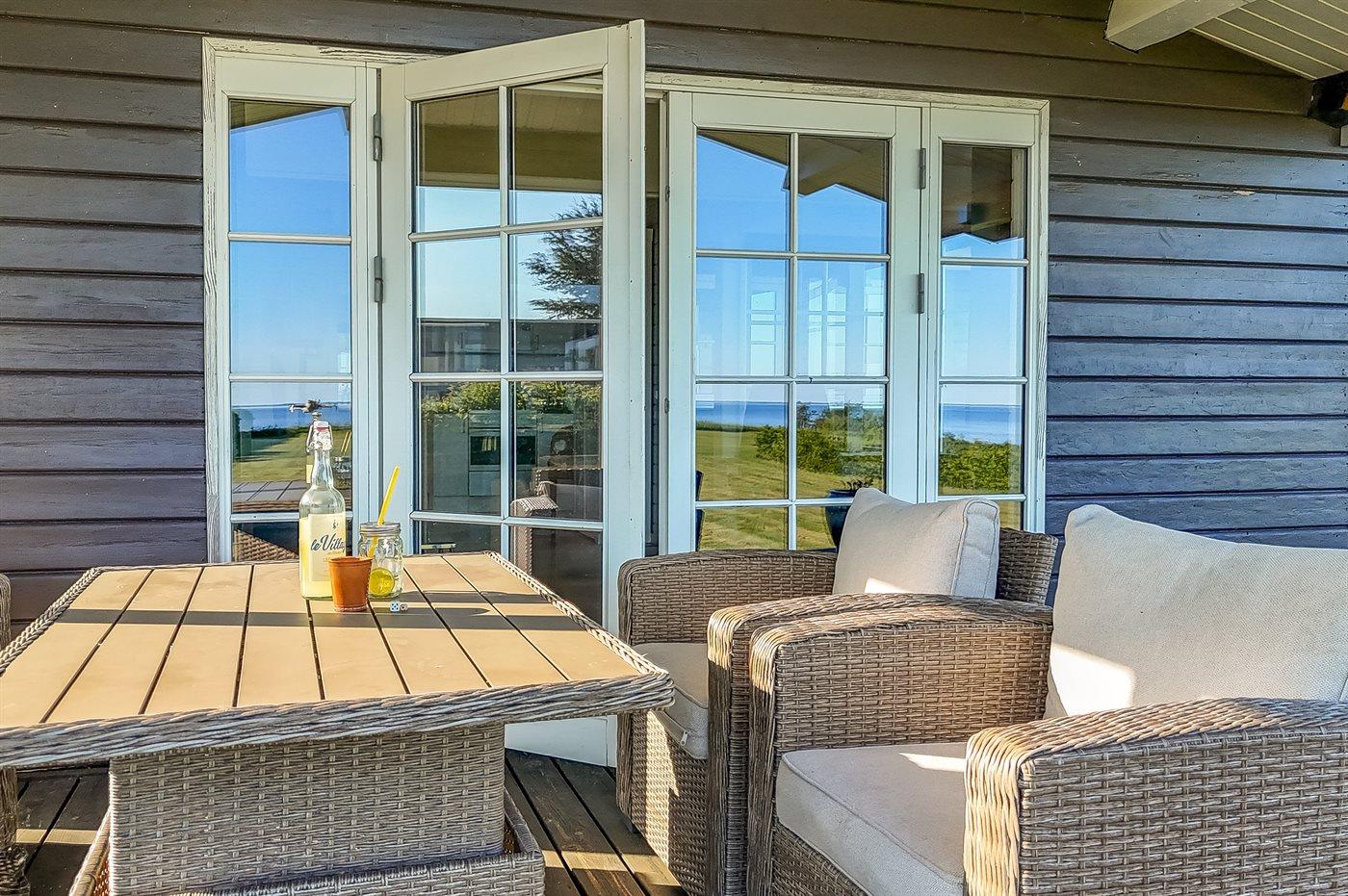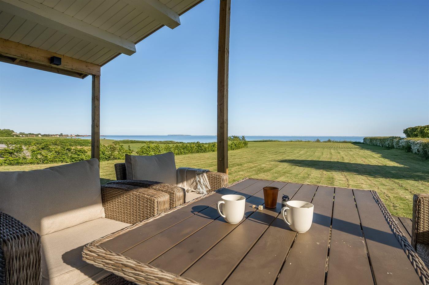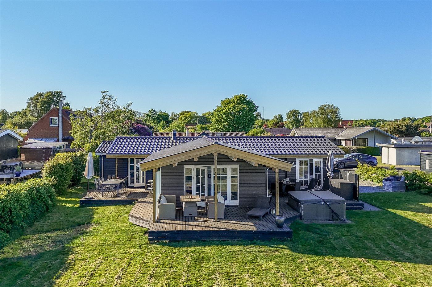 Gemütliches Sommerhaus in Juelsminde mit Meerblick, großem Grundstück und Whirlpool für entspannte Ferien am Wasser.