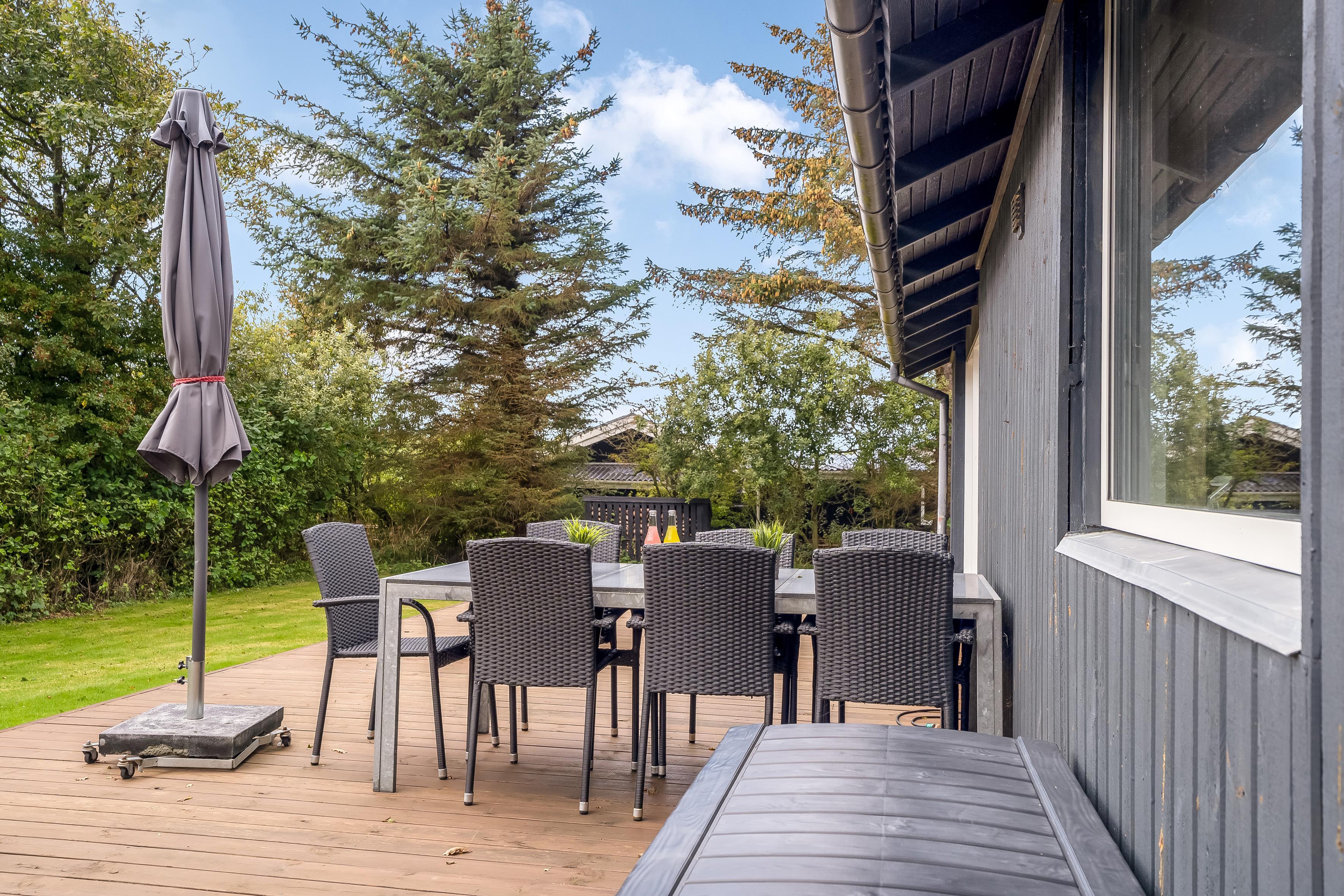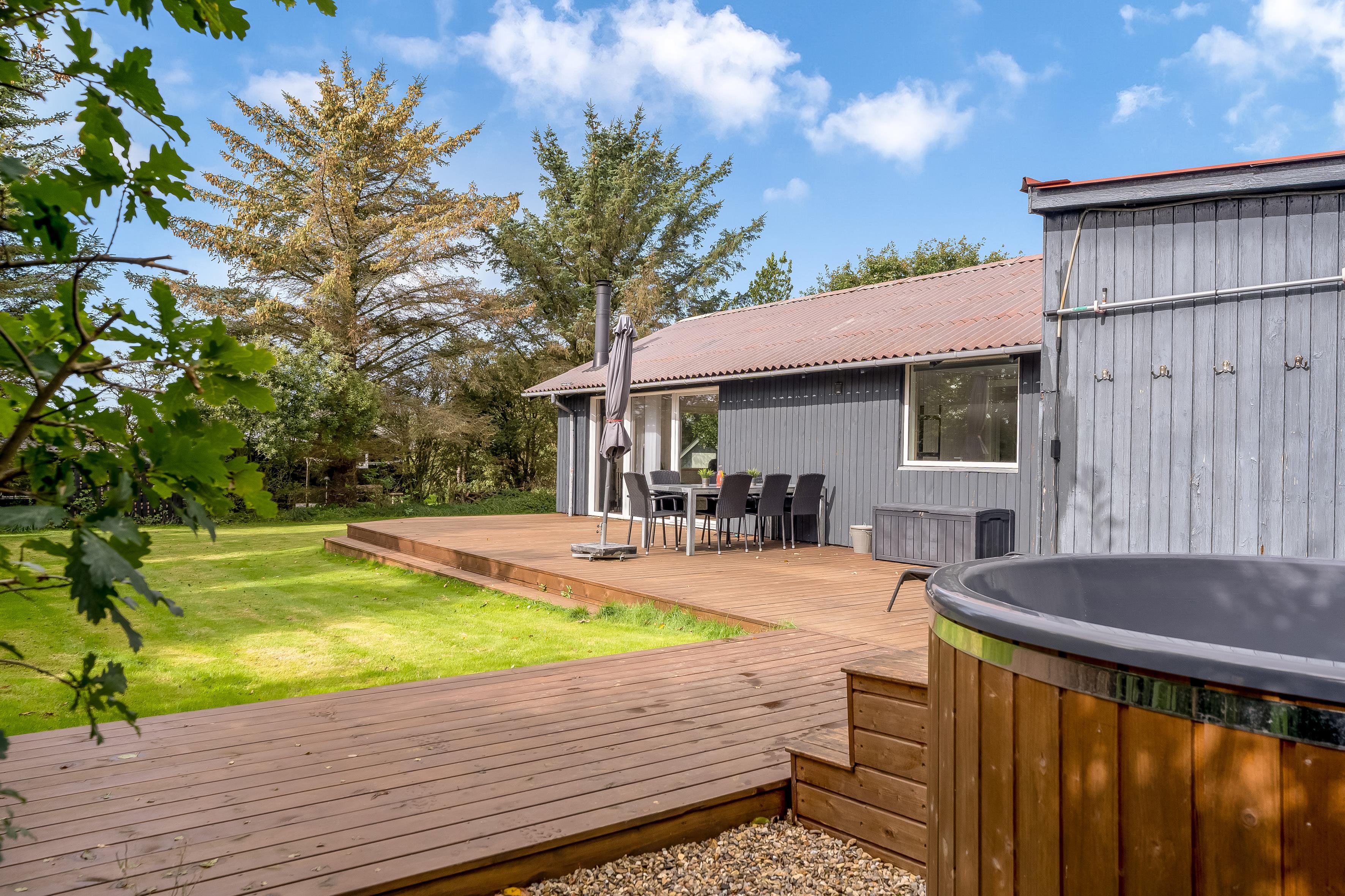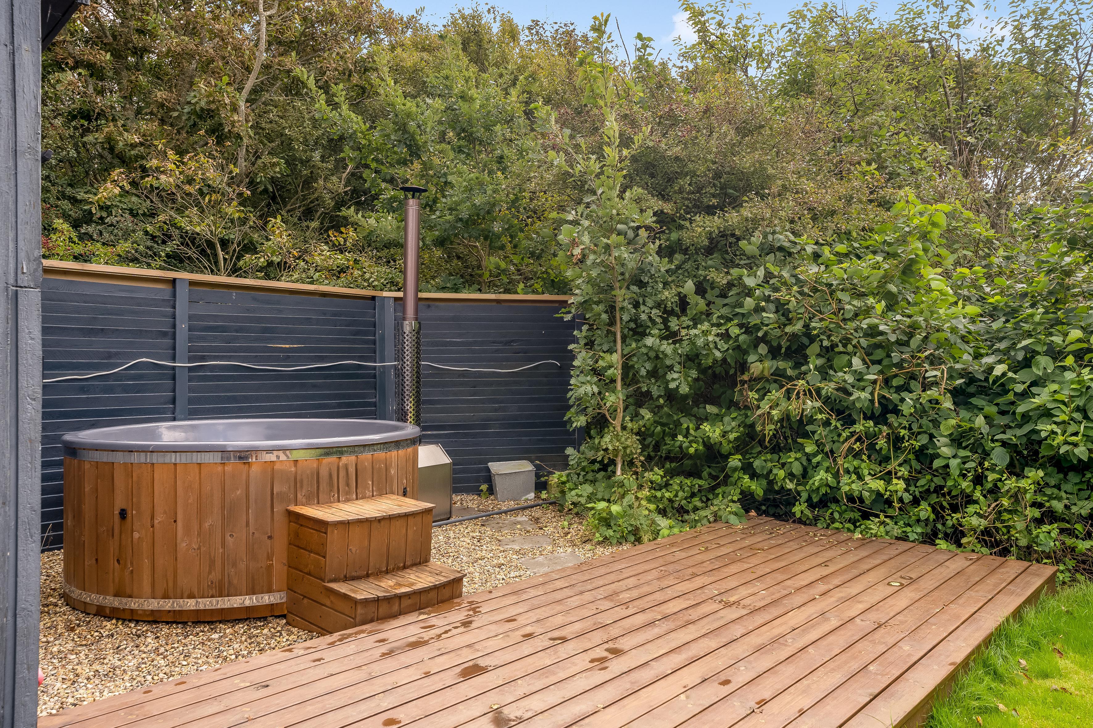 Im Außenbereich können Sie die große Terrasse genießen, auf der sich ein Grill für gemütliche Grillabende befindet. Für alle, die sich verwöhnen lassen möchten, gibt es ein Wildbad für bis zu 5 Personen – perfekt zum Entspannen unter dem Sternenhimmel. Der nahegelegene Strand ist nur 400 Meter entfernt und lädt zu Sonne, Sand und Wassersportaktivitäten ein.