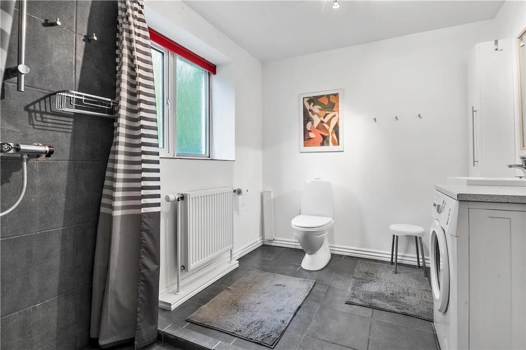 Badezimmer mit Toilette und Duschnische. Außerdem Waschmaschine vorhanden.