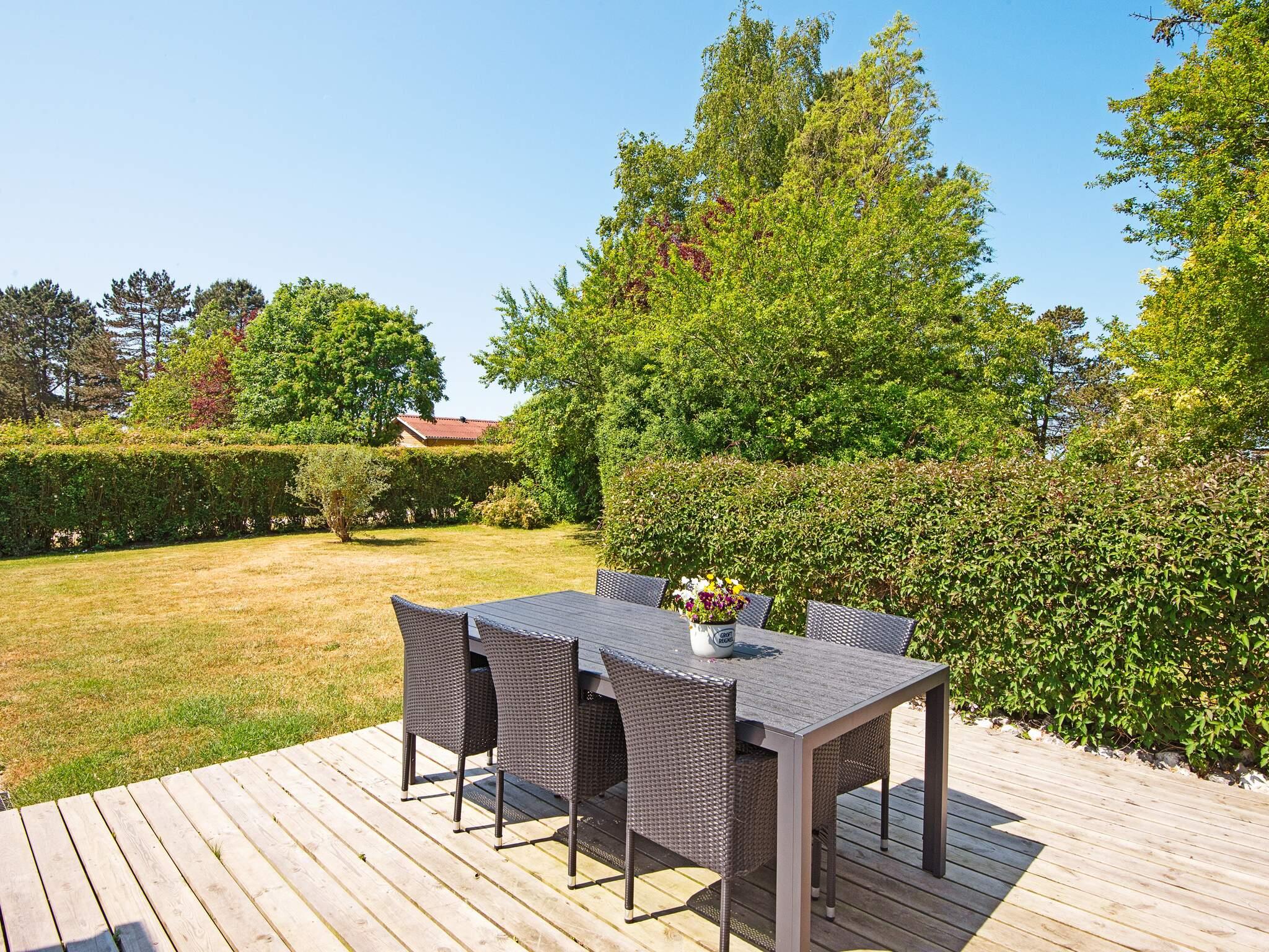 Vom Wohnbereich aus gelangen Sie direkt auf eine große, teilweise überdachte Holzterrasse mit Gartenmöbeln und Grill. Der Garten bietet viel Platz für Spiele und Aktivitäten im Freien.