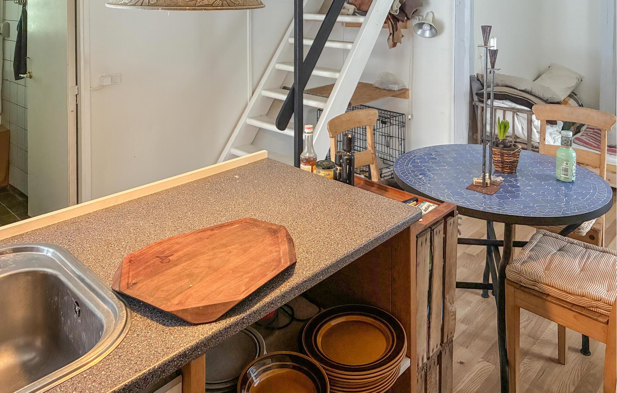 In diesem gemütlich eingerichteten Ferienhaus erleben Sie entspannte Tage in ländlicher Umgebung. Im Inneren erwartet Sie eine einfache, funktionale Einrichtung mit Holzböden und offenem Grundriss. Nehmen Sie am runden Esstisch Platz und nutzen Sie den kombinierten Wohn- und Küchenbereich als zentralen Treffpunkt. Bereiten Sie in der kompakt gestalteten Küche Ihre Mahlzeiten selbst zu und organisieren Sie den Tagesablauf.