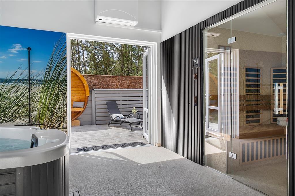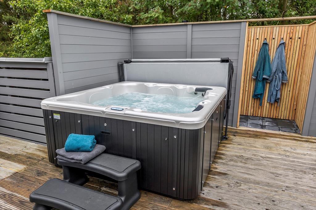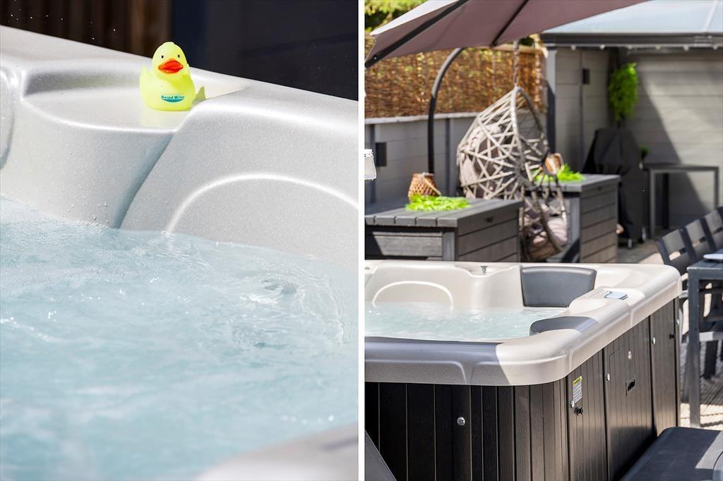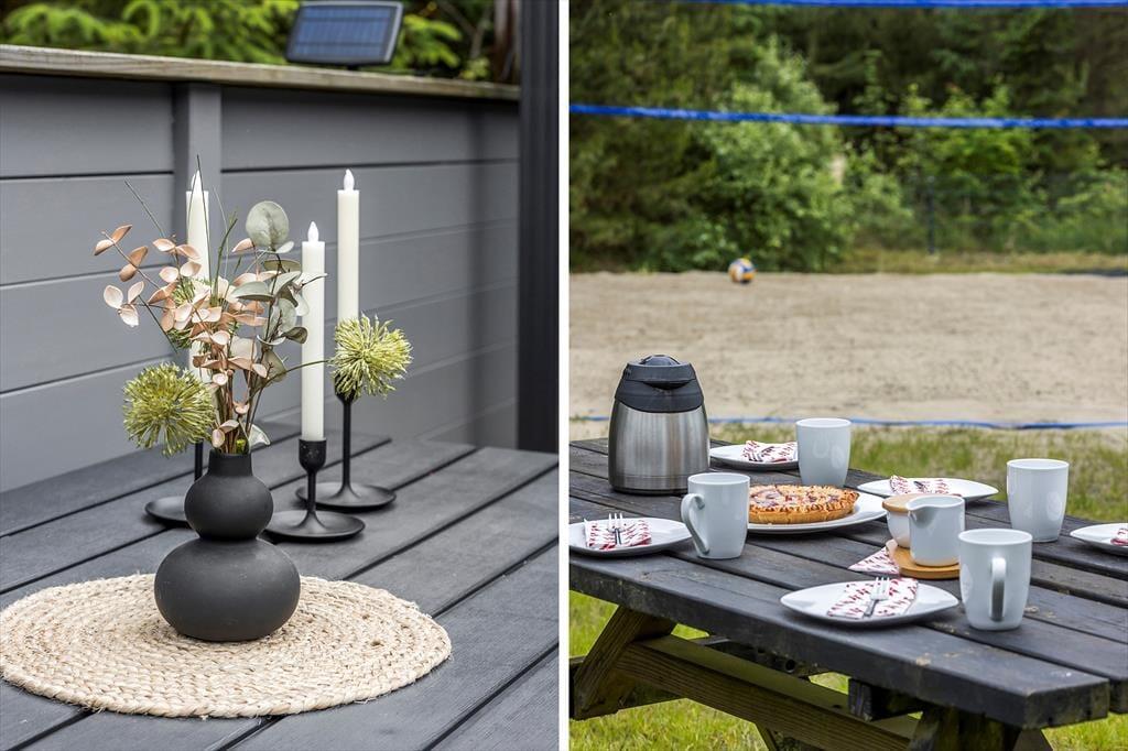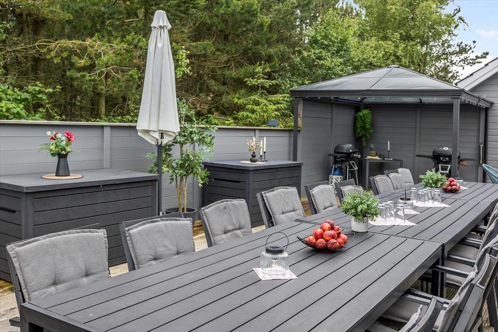 Auch im Freien gab es kürzlich Verbesserungen in Form einer großen, sonnigen Holzterrasse, die sich südlich des Ferienhauses befindet. Sie haben Zugang von sowohl dem Wohnbereich als auch dem Poolbereich, und es ist eine schöne, teilweise geschützte Oase, die mit Grill, Liegestühlen und hochwertigen Gartenmöbeln sowie einer Außendusche, einer Fasssauna und einem wunderbaren Outdoor-Whirlpool ausgestattet ist. Das Grundstück ist 2.350 m² groß, sodass Sie auch viel Platz zum Parken und für Aktivitäten auf dem Rasen haben, der mit Spielgeräten für Kinder ausgestattet ist. Der Garten ist außerdem eingezäunt, welches sicherstellt, dass niemand verloren geht, während sie herumtollen und viel Energie verbrennen.