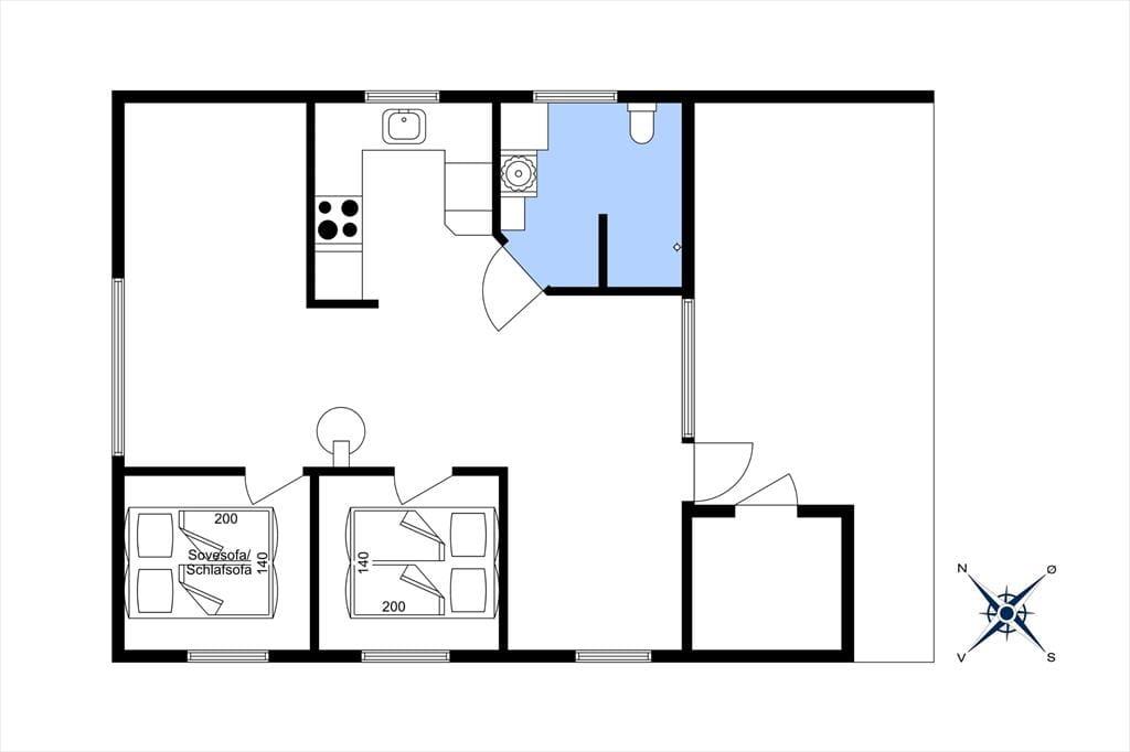 Das Urlaubsdomizil beinhaltet einen kombinierten Küchen- und Wohnbereich. In der schönen, hellen Küche treffen Sie auf einen Ceranfeldherd, einen Miniofen, einen Geschirrspüler, eine Mikrowelle und einen Kühlschrank mit Gefriermöglichkeit. Im gemütlichen, hellen Wohnraum dürfen Sie sich auf eine dekorative offene Balkenlage, einen Ausgang auf die teilweise überdachte Terrasse, ein Chaiselongue-Sofa, Lehnstühle, einen guten Essplatz, einem Kamin, einen Fernseher mit dänischen und zwei deutschen Programmen (RTL und ZDF) und einen DVD-Player freuen. Im Badezimmer sind eine Duschnische und eine Waschmaschine untergebracht. Ihnen stehen ein Schlafraum mit einem Doppelbett und ein Schlafraum mit einem doppelten Schlafsofa (140 x 200 Zentimeter) zur Verfügung. Zwei Kunderstühlen ist auch vorhanden. Beheizt wird dieses Objekt mittels des Kamins und mittels Elektroheizungen.