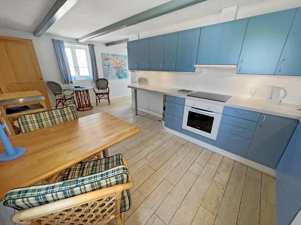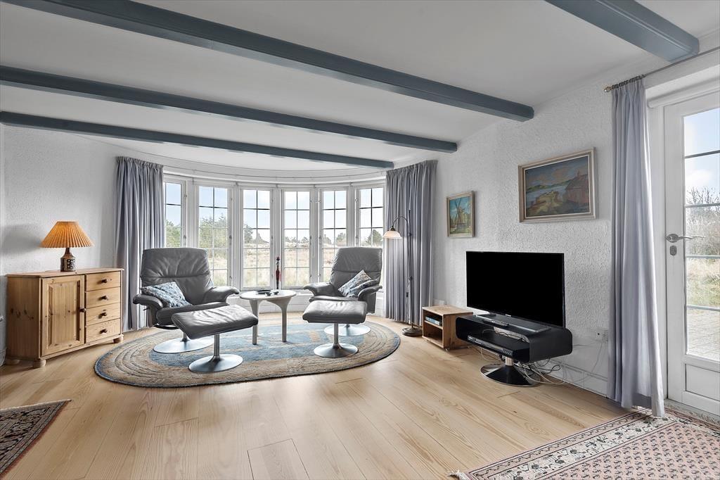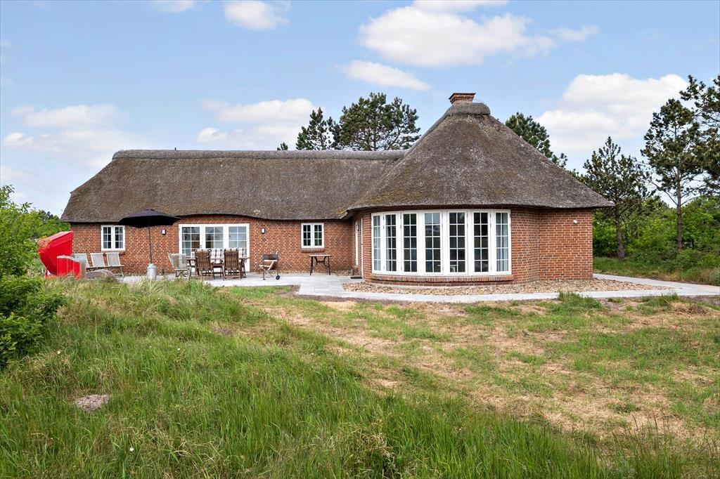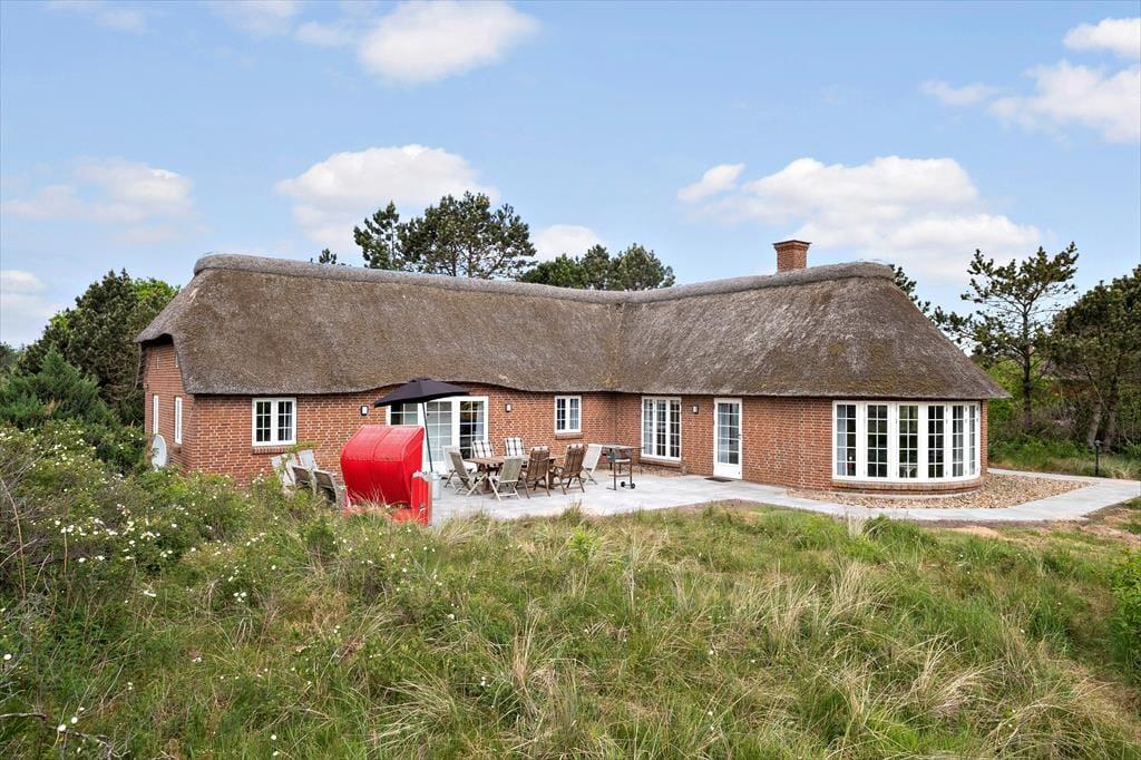 Das Ferienhaus schmückt die natürliche Wattenmeerumgebung mit seiner rotbraunen Backsteinfassade, seinen weißen Sprossenfenstern und seinem schönen Reetdach. Im Innenbereich ist die Atmosphäre mindestens genauso charmant, denn hier gibt es bemalte Holzbalken an der Decke, und die Möbel wurden sorgfältig ausgewählt, um die gemütliche Stimmung in den Räumen zu unterstreichen. Insgesamt kannst du dich auf 156 m² ausbreiten, die sich unter anderem in drei gute Schlafzimmer mit i alt seks sovepladser. Es gibt zwei Badezimmer, von denen das größte geschmackvoll mit Whirlpool und Sauna ausgestattet ist – so kannst du dich auch im Urlaub problemlos auf den ein oder anderen Wellness-Abend freuen. Die Küche des Ferienhauses ist hell, einladend und gut ausgestattet, inklusive Geschirrspüler und Mikrowelle. Darüber hinaus gibt es eine kleine Essecke, falls du deinen Frühstückskaffee lieber dort zu dir nehmen möchtest. Die restlichen Mahlzeiten des Tages können im Wohnzimmer serviert werden, das komfortabel mit einem Esstisch, weichen Sitzmöbeln, einem Brennofen und großen Fenstern ausgestattet ist, die Tageslicht und eine schöne Aussicht ins Innere des Hauses einladen.