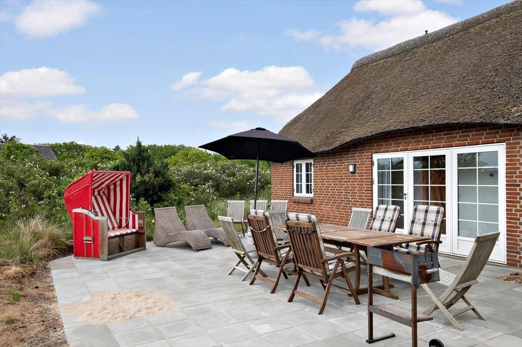Sowohl vom Wohnzimmer als auch von der Küche aus hast du direkten Zugang zu einer großen, nach Süden ausgerichteten Terrasse. Dort kannst du sitzen und den Blick über die Küstenlandschaft bis zum Wattenmeer schweifen lassen. Ein wunderbarer Ort, um die Sonne und den Sommer zu genießen, und zur Abwechslung kannst du auf die nach Westen ausgerichtete Terrasse umziehen. An einem sonnigen Frühlingstag oder einem ruhigen Sommerabend lässt es sich auch schön im reetgedeckten Gartenpavillon sitzen, der auf dem großen Naturgrundstück steht.