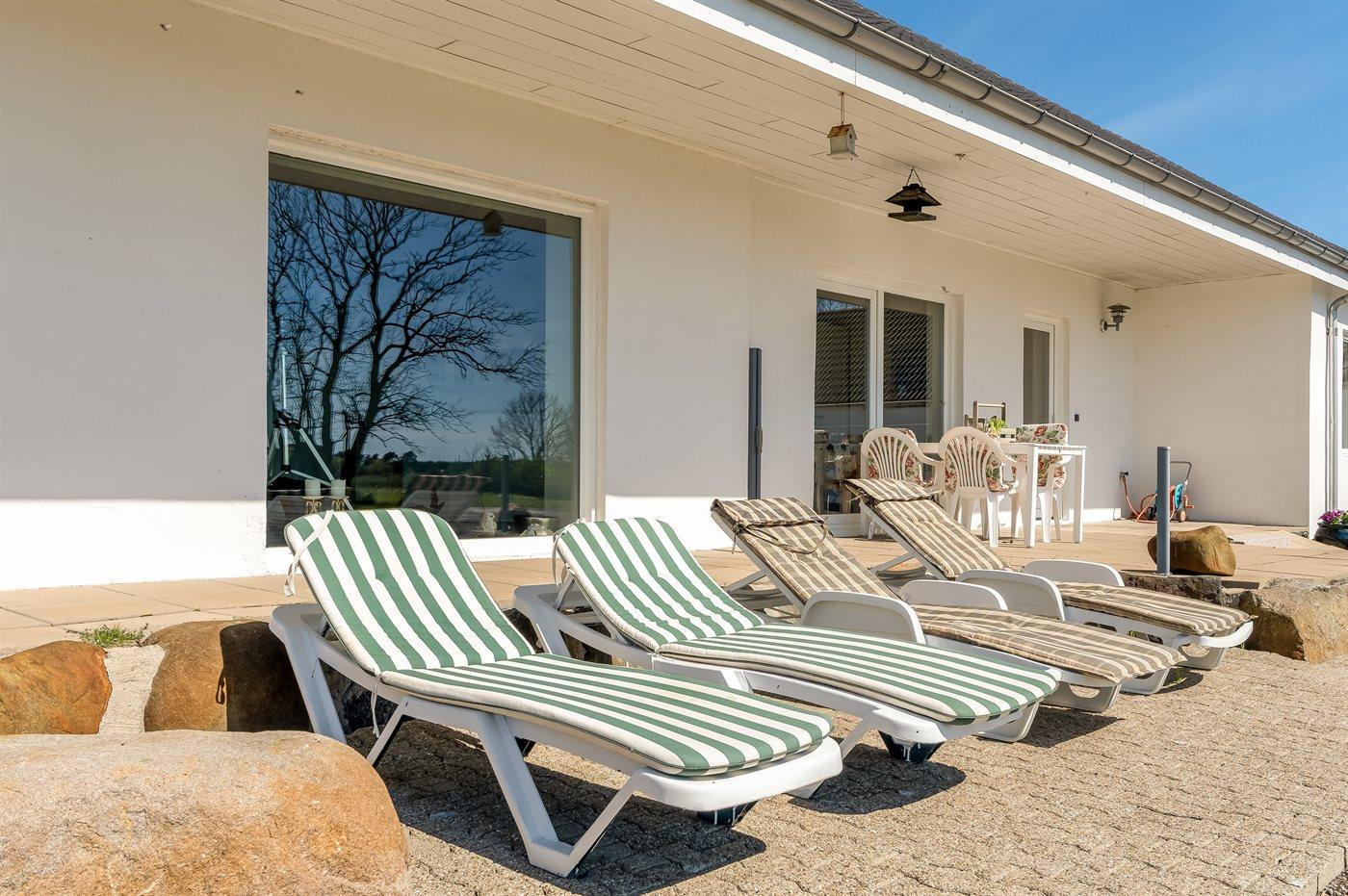 Große, teilweise überdachte, südlich ausgerichtete Terrasse, auf der du die fantastische Aussicht über Rønnerne in Richtung der berühmten Salzsiederei von Læsø genießen kannst