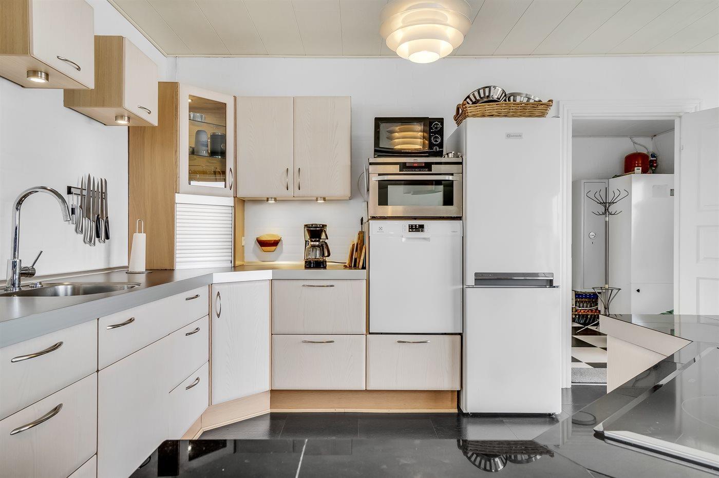 Die Küche ist mit Kühlschrank ausgestattet. Außerdem gibt es 4 Keramik-Kochfelder, Umluftofen, Mikrowelle sowie Geschirrspüler.