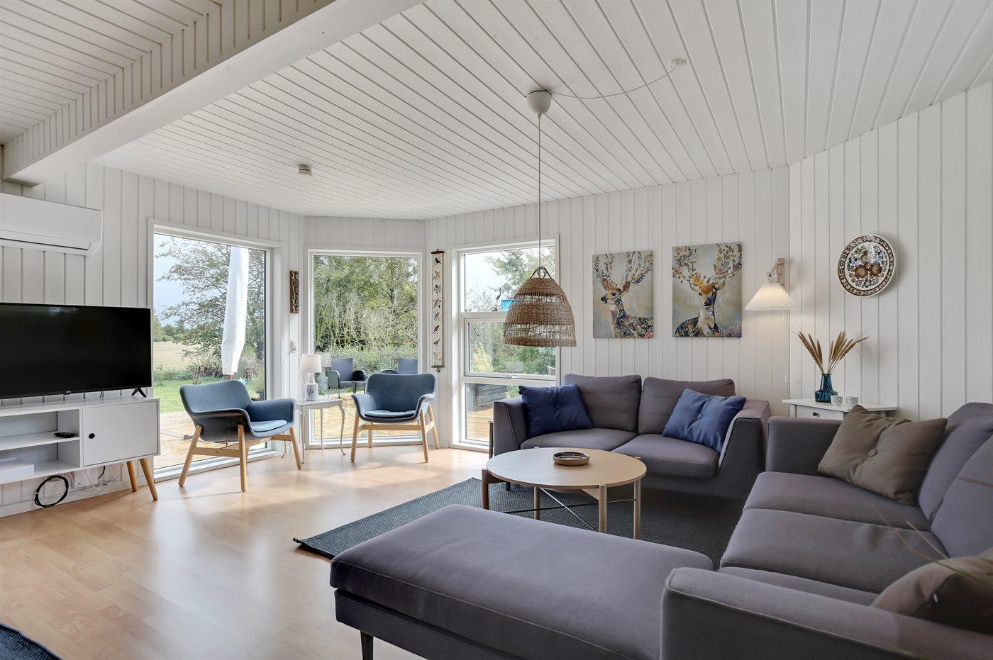 Auf einem besonders schönen Grundstück, wo Sie sowohl vom Haus als auch von der Terrasse aus die Aussicht auf die Umgebung und auf das offene Feld, das an das Grundstück angrenzt genießen können, liegt dieses Ferienhaus. Das Haus ist neu modernisiert und tritt hell und freundlich hervor. Nur etwa 600 m vom Haus entfernt finden Sie einen kinderfreundlichen Badestrand.