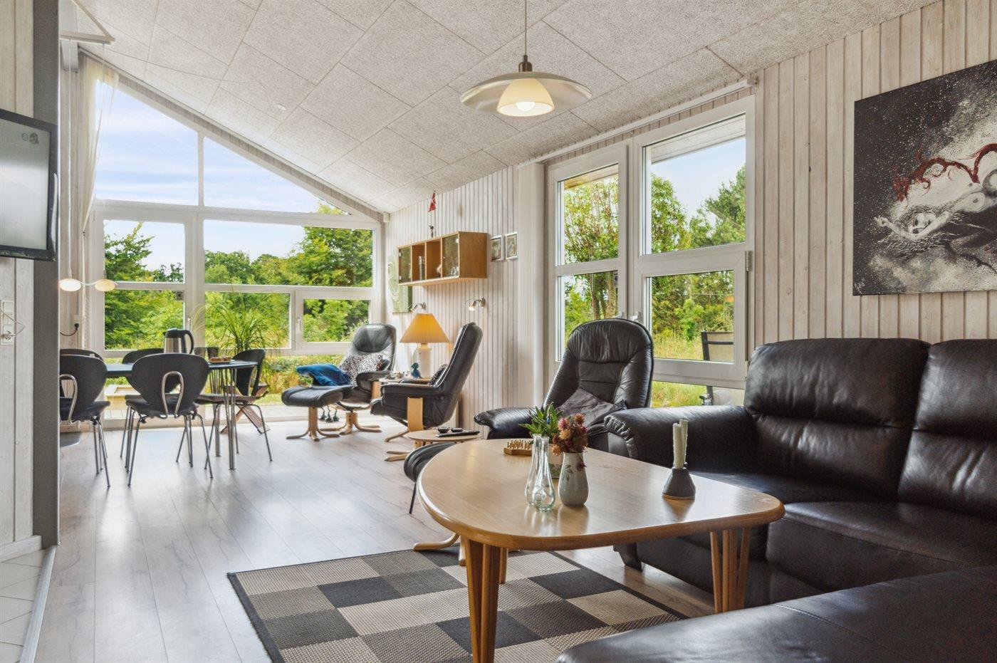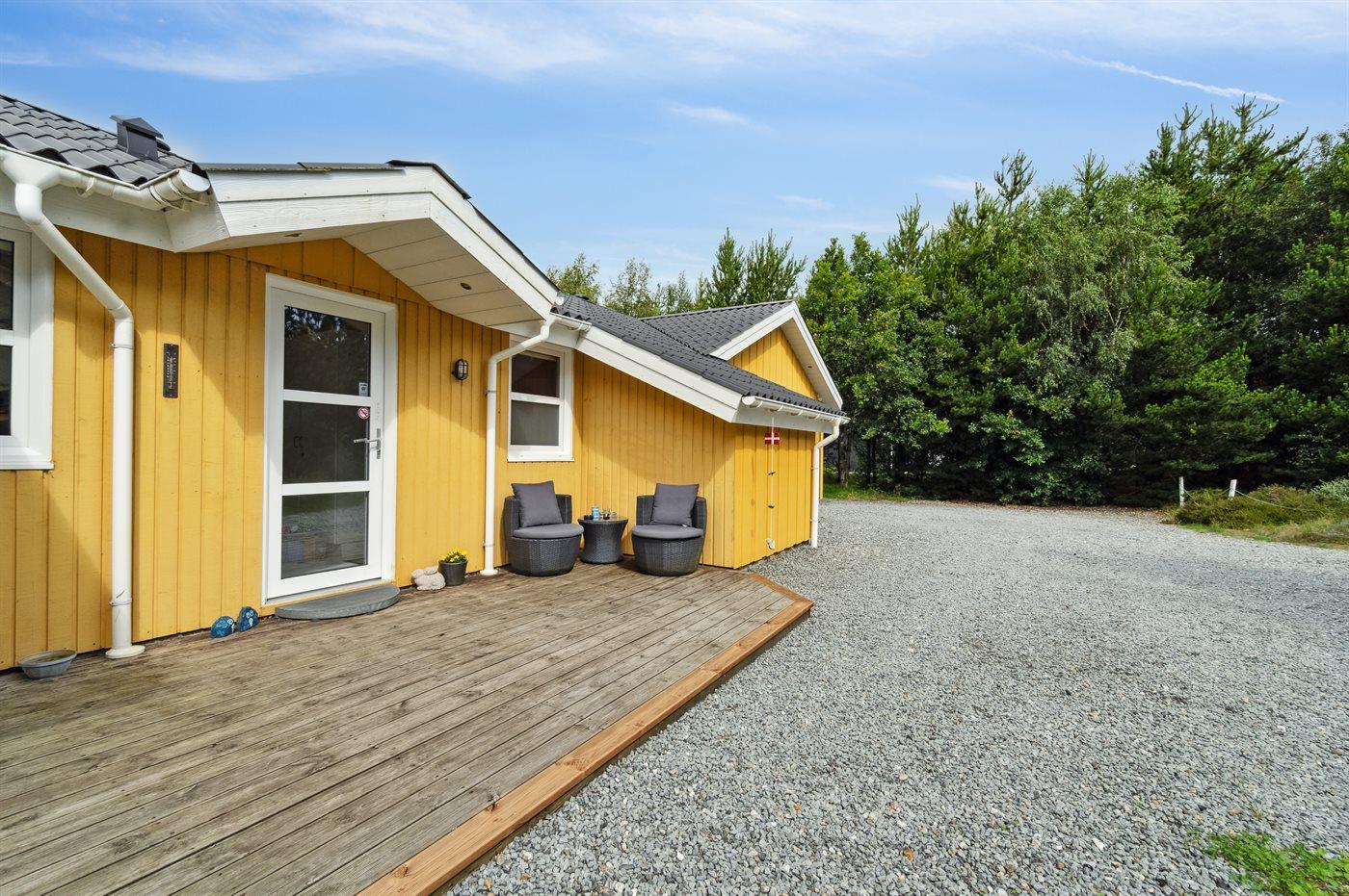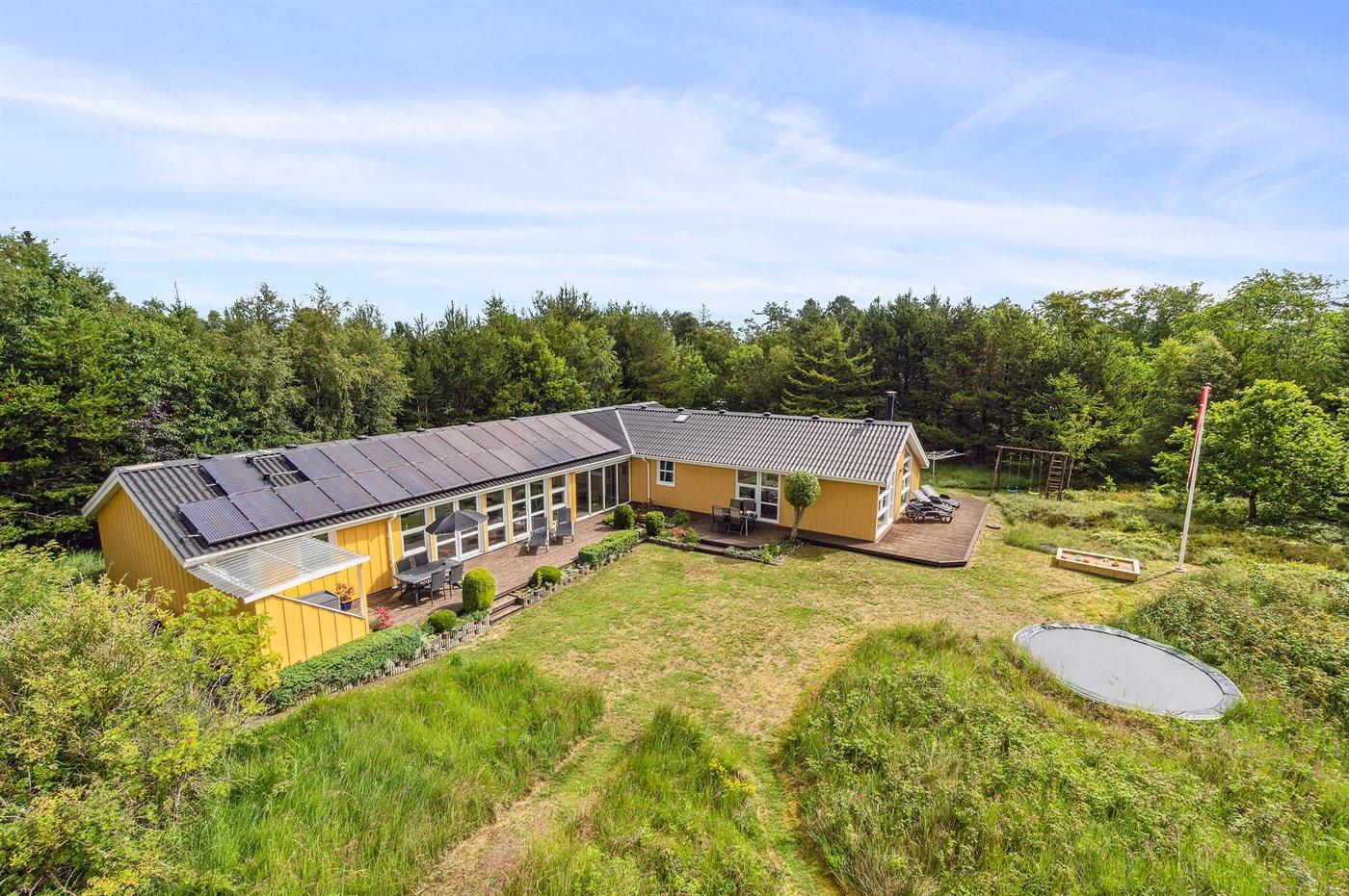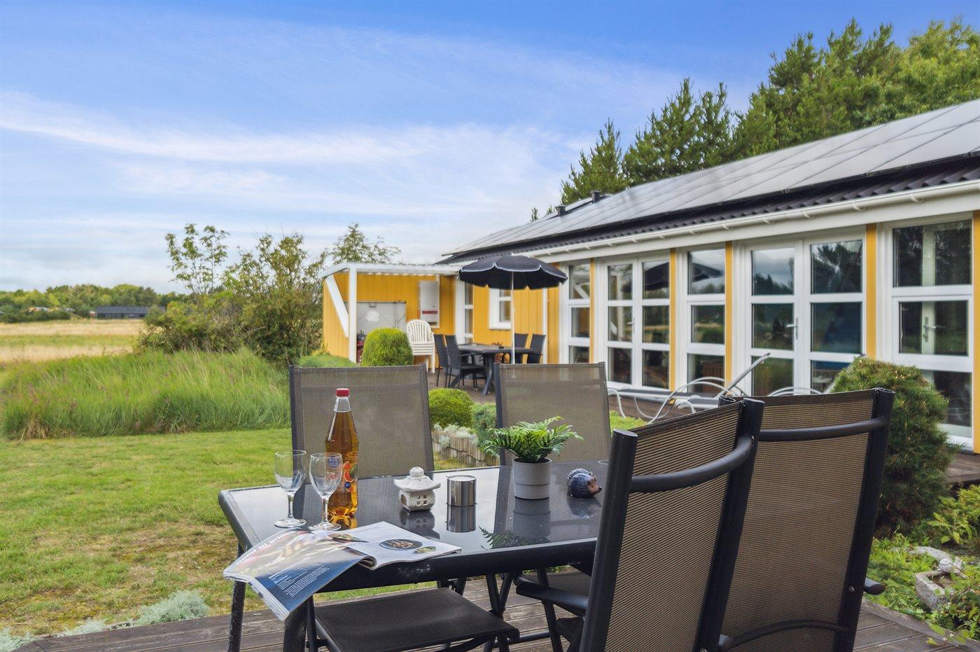 Das Ferienhaus hat eine große offene Küche, Ess- und Wohnbereich, in dem viel Platz für die ganze Familie ist. Von hier aus gelangt man auf die große, schöne Terrasse, auf der man den ganzen Tag über die Sonne und die Stille genießen kann. Das Grundstück ist fantastisch mit einer Kombination aus gepflegtem Rasen und einem wilderen Naturgrundstück, das gut in die Umgebung passt. Nur etwa 350 Meter entfernt liegt das Meer und der Strand ist besonders schön mit weichem und feinem Sand.