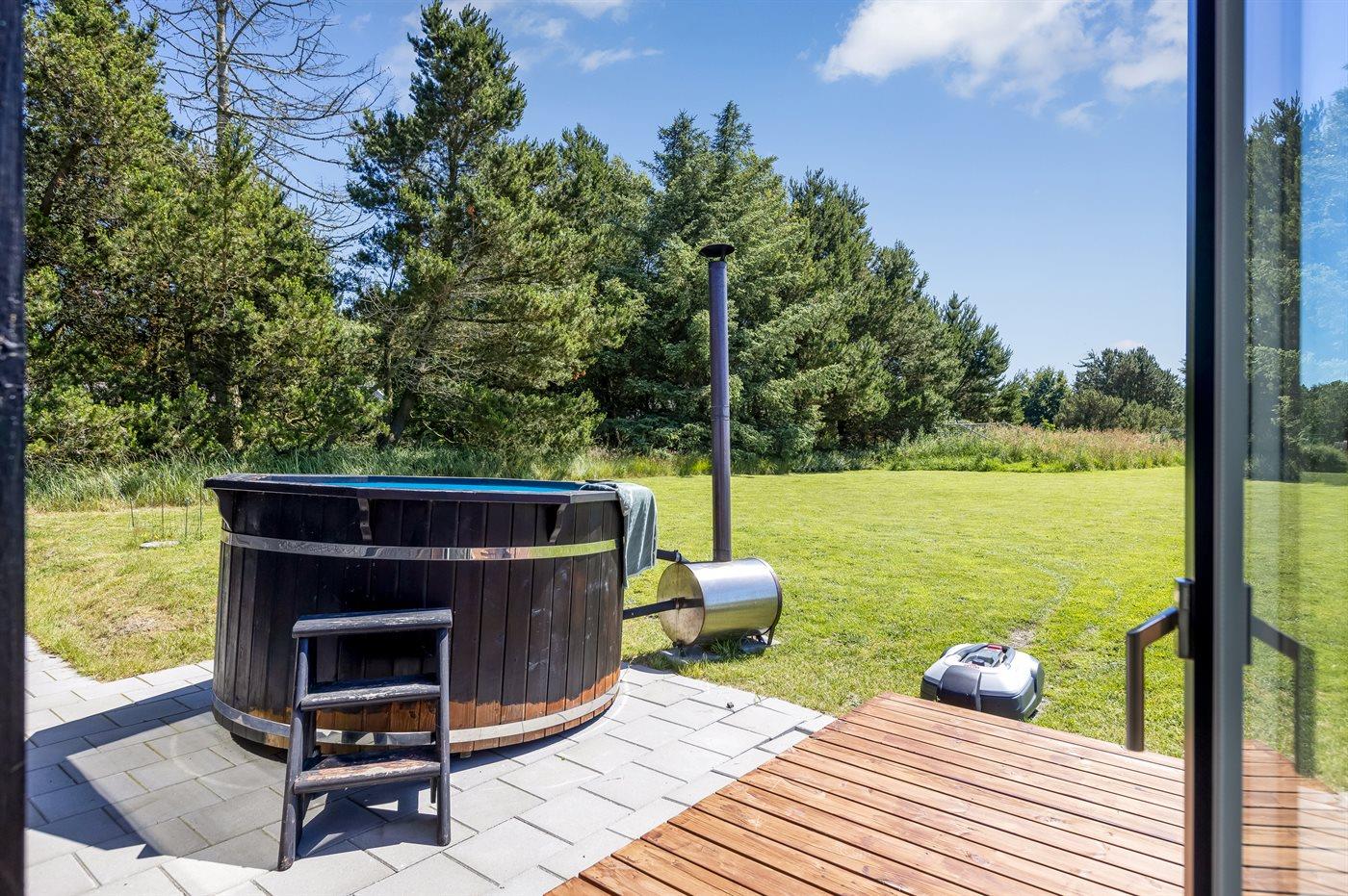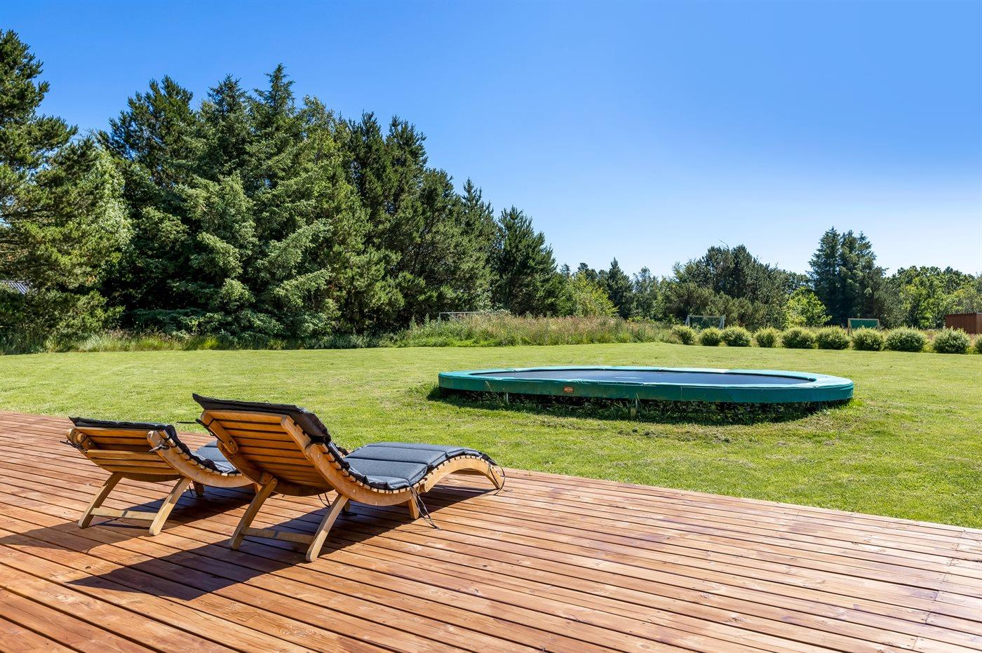 Die Ferienunterkunft liegt auf einem 1979 m² großen Gartengrundstück. Die Entfernung zum Meer beträgt 450 m. Die nächste Einkaufsmöglichkeit liegt 6500 m entfernt. In einem Abstand von 8000 m gibt es einen Golfplatz. Außerdem gibt es 10 m² überdachte Terrasse. Es steht ein offenes Terrassenareal zur Verfügung. Trampolin. Fußballtor. Außensauna. Gasgrill steht zur Verfügung. Es ist ein Ladestecker für Elektroautos installiert. Ladestecker Typ 2. Parkplatz auf dem Grundstück.