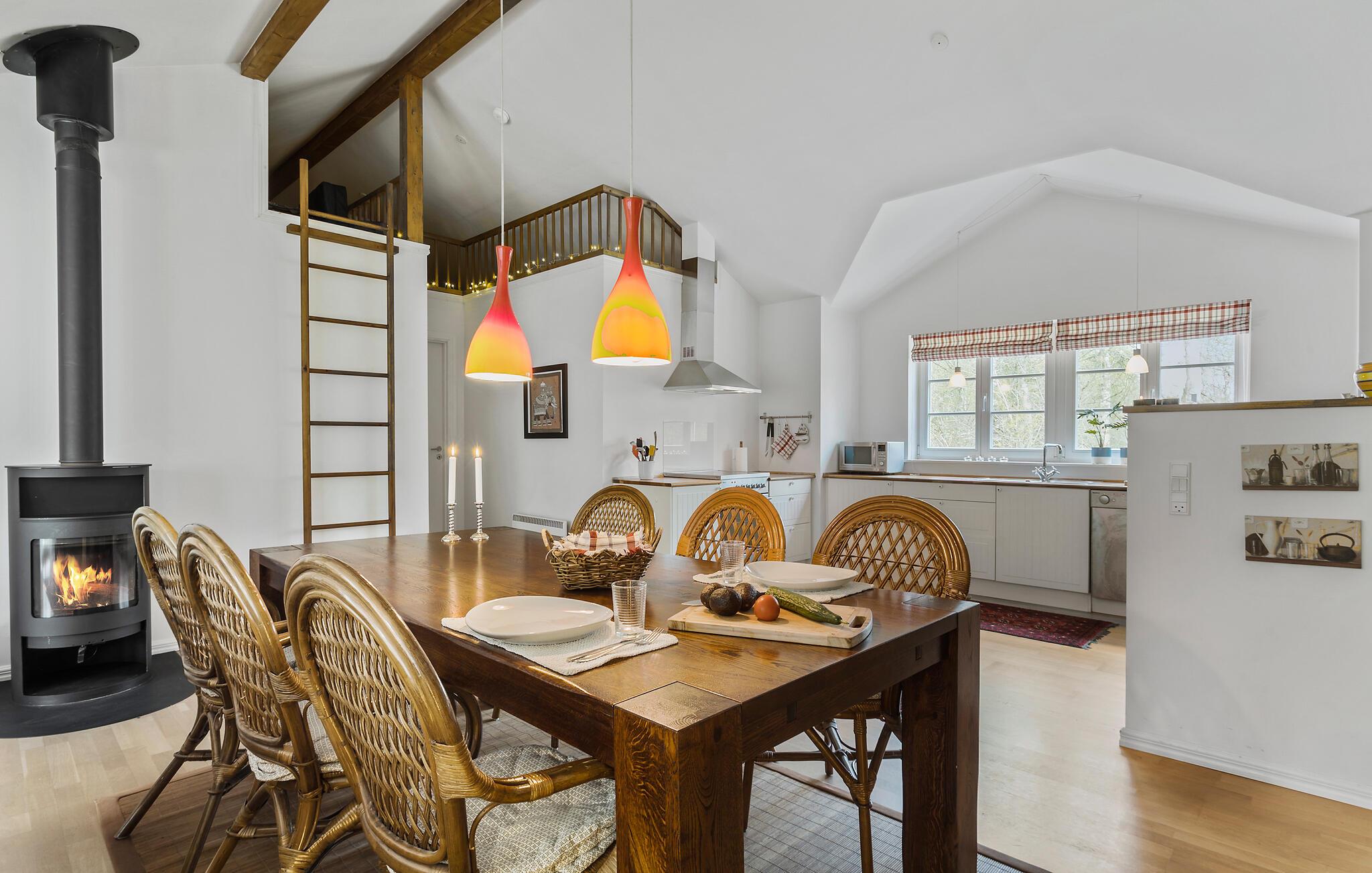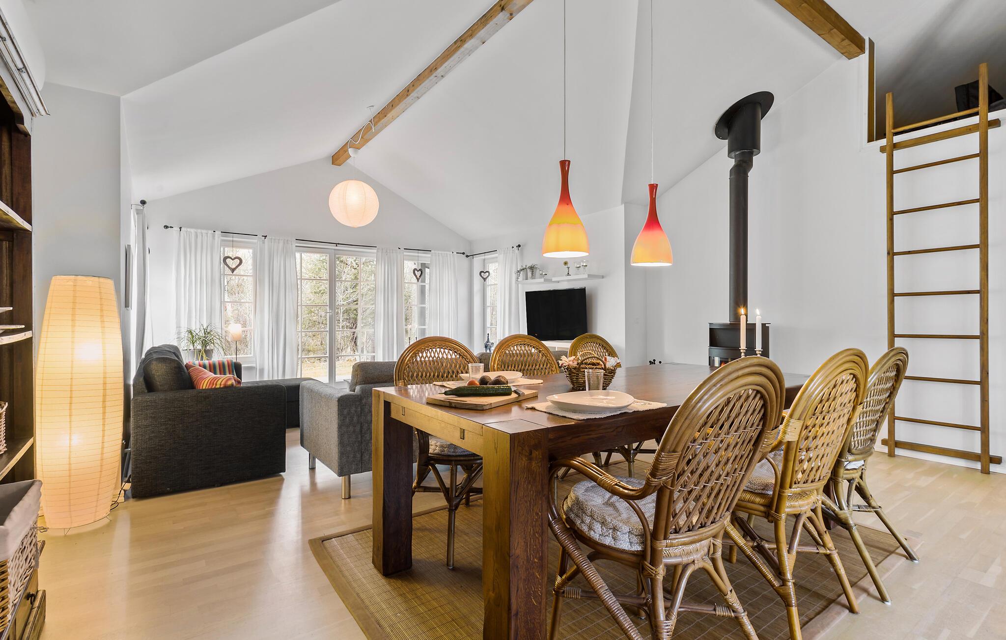 Willkommen in Ihrem behaglichen Ferienhaus, das gemütliche Familienmomente verspricht. Beginnen Sie den Tag in der geräumigen Küche und bereiten Sie eine gute Tasse Kaffee und ein üppiges Frühstück zu. Hier können Sie auch ohne Probleme gemeinsam kochen. Im Wohnzimmer lädt das weiche Sofa zu Filmabenden ein, und der gemütliche Kaminofen verheißt Wärme und Geborgenheit an kühleren Abenden. Spielen Sie Brettspiele am Esstisch und genießen Sie Ihre Mahlzeiten hier. Speisen können Sie auch draußen auf der großzügigen Terrasse. Ob beim morgendlichen Frühstück in der Morgensonne oder bei Grillabenden unter dem Sternenhimmel bleibt Ihnen überlassen. Der umliegende Garten bietet Raum zum Entspannen und für Ballspiele mit den Kindern.