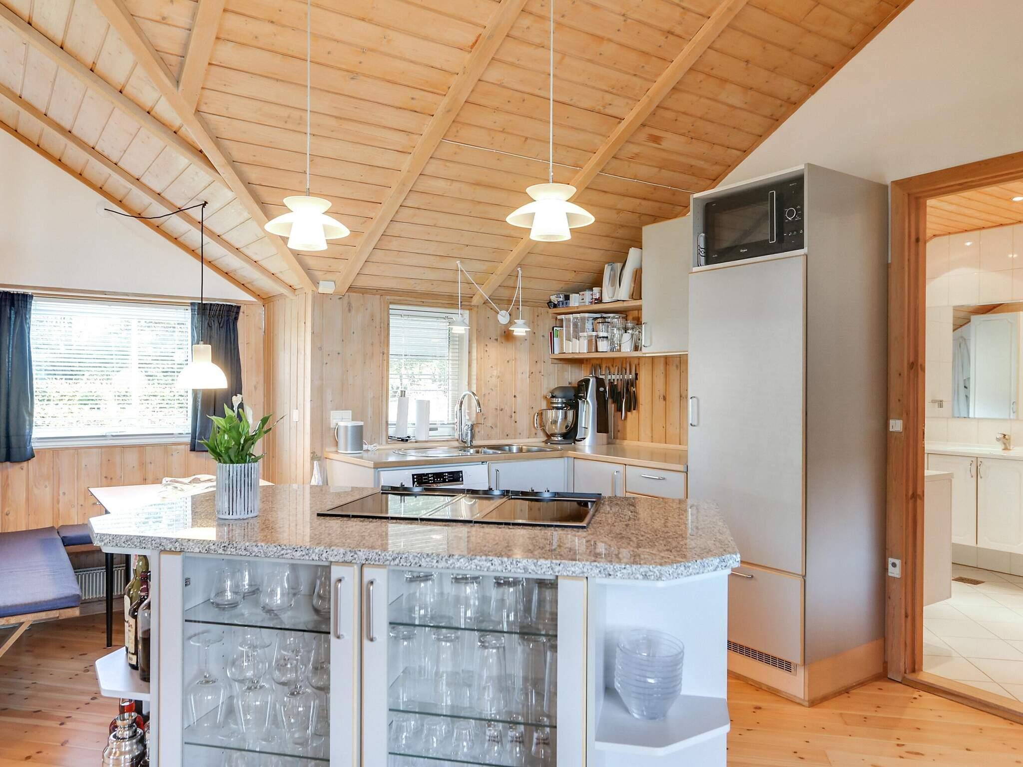 Vom gemütlichen Wohnbereich hat man schönen Ausblick zur teils überdachten Terrasse und weiter zum sonnigen Rasengrundstück. Die offen integrierte, helle Küche ist u.a. mit Cerankochfeld, separatem Backofen, Abzugshaube, Mikrowelle, Geschirrspüler und Kühlschrank mit Gefrierfach ausgestattet. Zudem gibt es nebenan im Schuppen einen zweiten Kühlschrank. Im Haus wurde auch eine energieeffiziente Luft-Luft-Wärmepumpe installiert, um so das Haus stromsparend und somit klimafreundlicher erwärmen zu können. Sie haben Zugriff auf WLAN, Blu-ray Lautsprecher sowie TV mit Chromecast für eigene Streaming-Dienste. Außerdem zwei helle Badezimmer mit Dusche. Es stehen im Haus drei Schlafzimmer mit jeweils zwei Schlafplätzen sowie Kinderbett und Hochstuhl für die Kleinen bereit.
