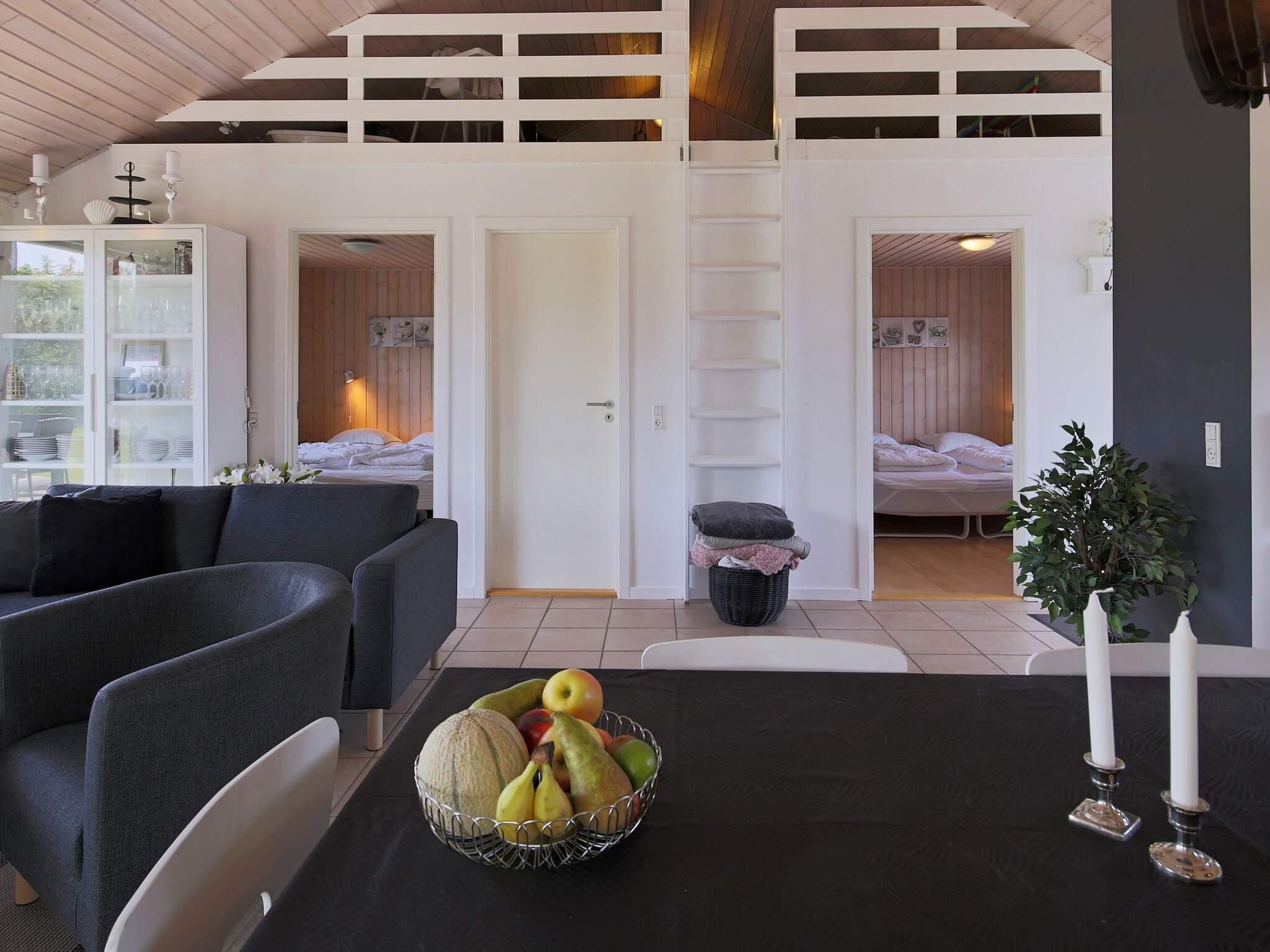 Der offene Küchen-/Wohnbereich bietet Platz für das Familienleben. Zur technischen Ausstattung gehören u.a. Kabel-TV und schnelles Internet sowie ein DAB-Radio. Eine energieeffizieten Luft-Luft-Wärmepumpe sorgt für ein behagliches Innenklima zu jeder Jahreszeit. Es stehen zudem vier Schlafzimmer, alle mit Schrank, Stuhl und Spiegel eingerichtet, zur Verfügung. Außerdem liegen oben unter dem Dach zwei Hemse, die von Kindern etwa ab dem Schulalter als Spielfläche genutzt werden können. Für den jüngsten Gast stehen im Haus zwei Hochstühle, Babywanne sowie ein Stuhl in Juniorgröße bereit.